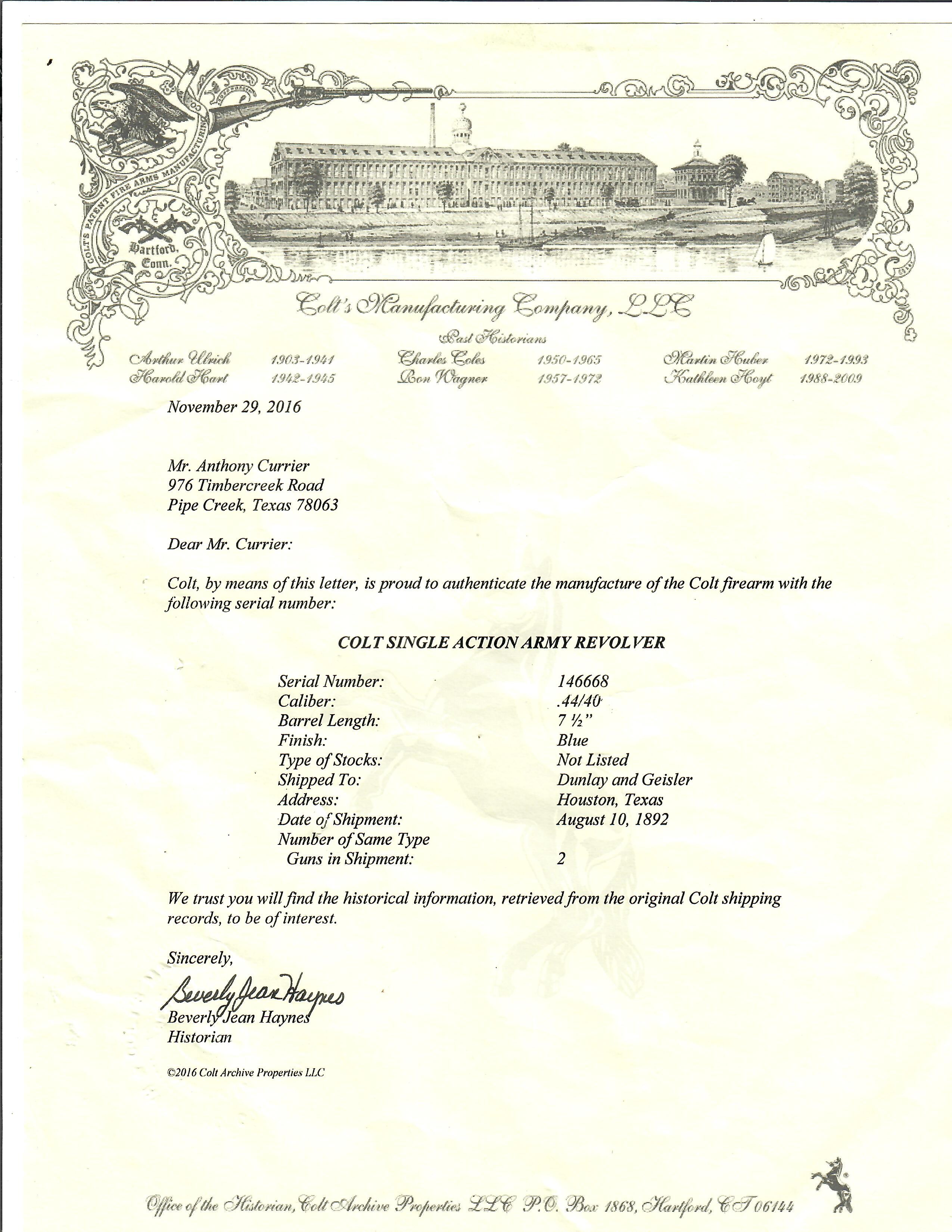 The revolver was built in 1892, and came to us with a printed copy of a Colt Factory letter from the office of the Colt Historian Beverly Jean Haynes. It is dated November 29, 2016, and indicates it is a COLT SINGLE ACTION ARMY REVOLVER in .44/40 caliber, also known as a Frontier Six Shooter. The gun was made with a blued finish and a full length 7 1/2" barrel. There is no listing for the stocks, which usually indicates rubber, which is what this revolver is still fitted with. The gun was shipped on August 10, 1892 as part of a shipment of 2 similar guns to Dunlay & Geisler in Houston, Texas. We have not been able to find much on this retailer, however there are multiple examples of Colt revolvers that were shipped there.