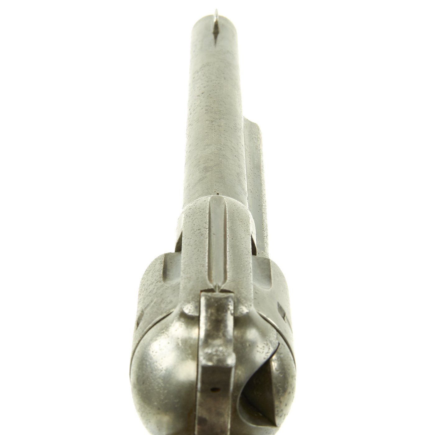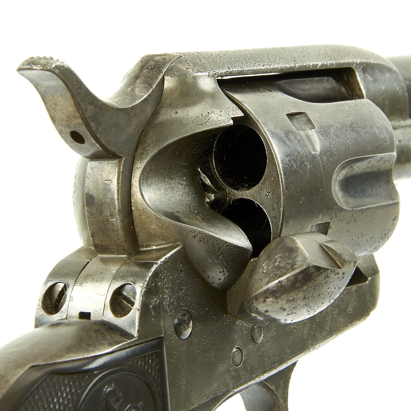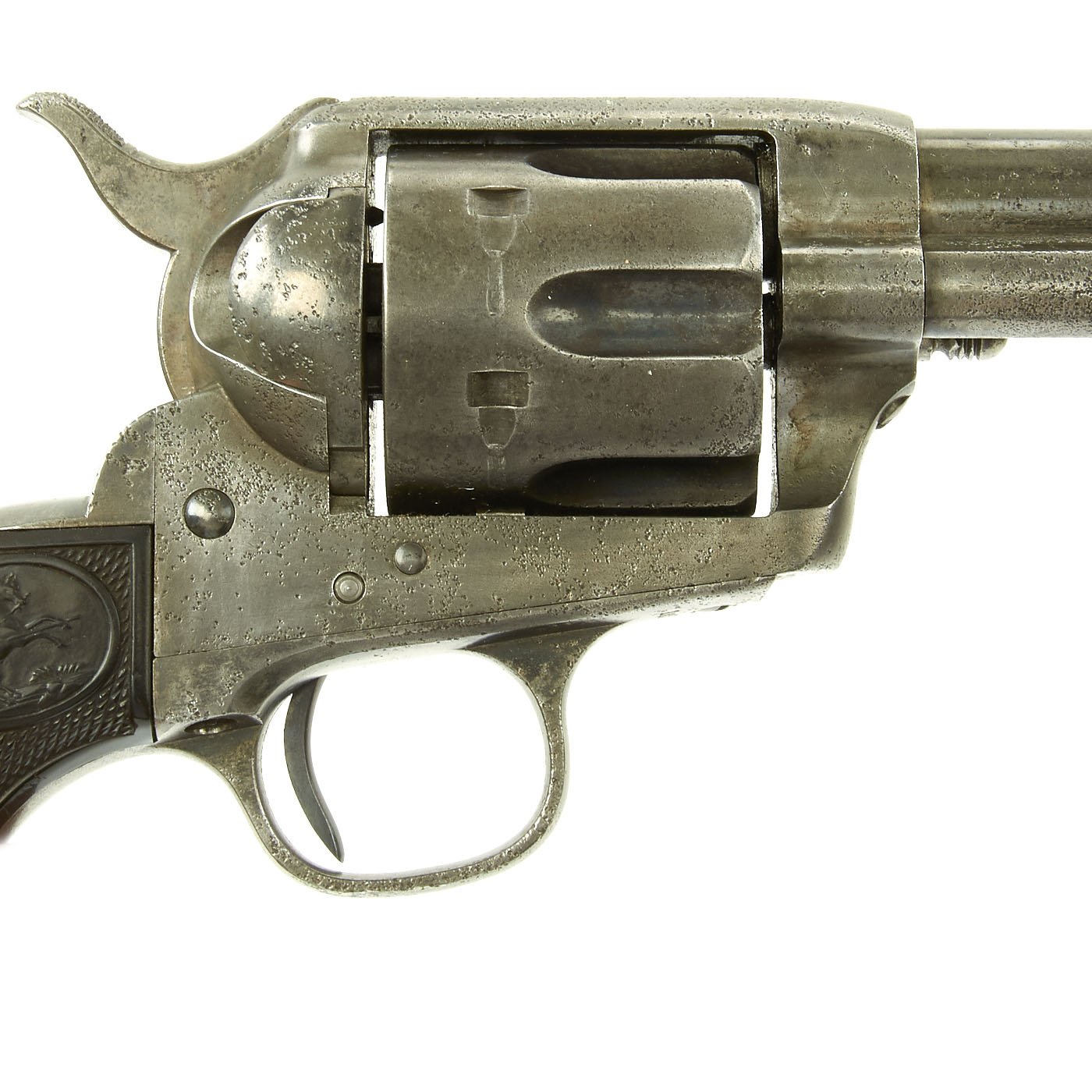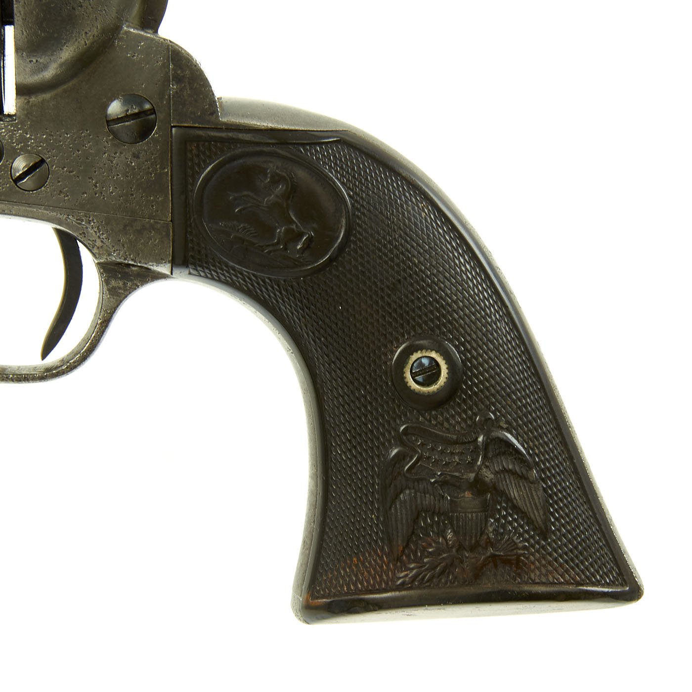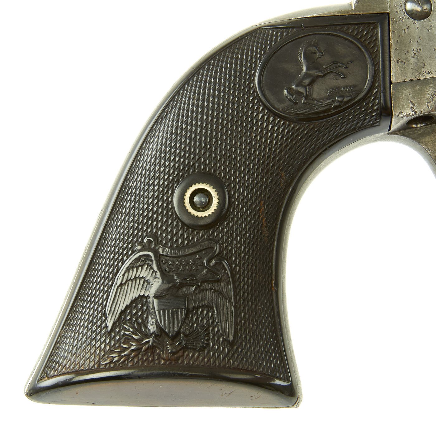 The original blued finish has faded to a lovely gray patina over the entire gun, giving it a great vintage look. There is some overall peppering to the revolver from removed surface rust. The original Colt grips have the "Prancing Pony" as well as the U.S. Federal eagle, the standard grips for this revolver. They appear to be completely original, and have the expected wear from use and age. There are no cracks, and only slight wear.