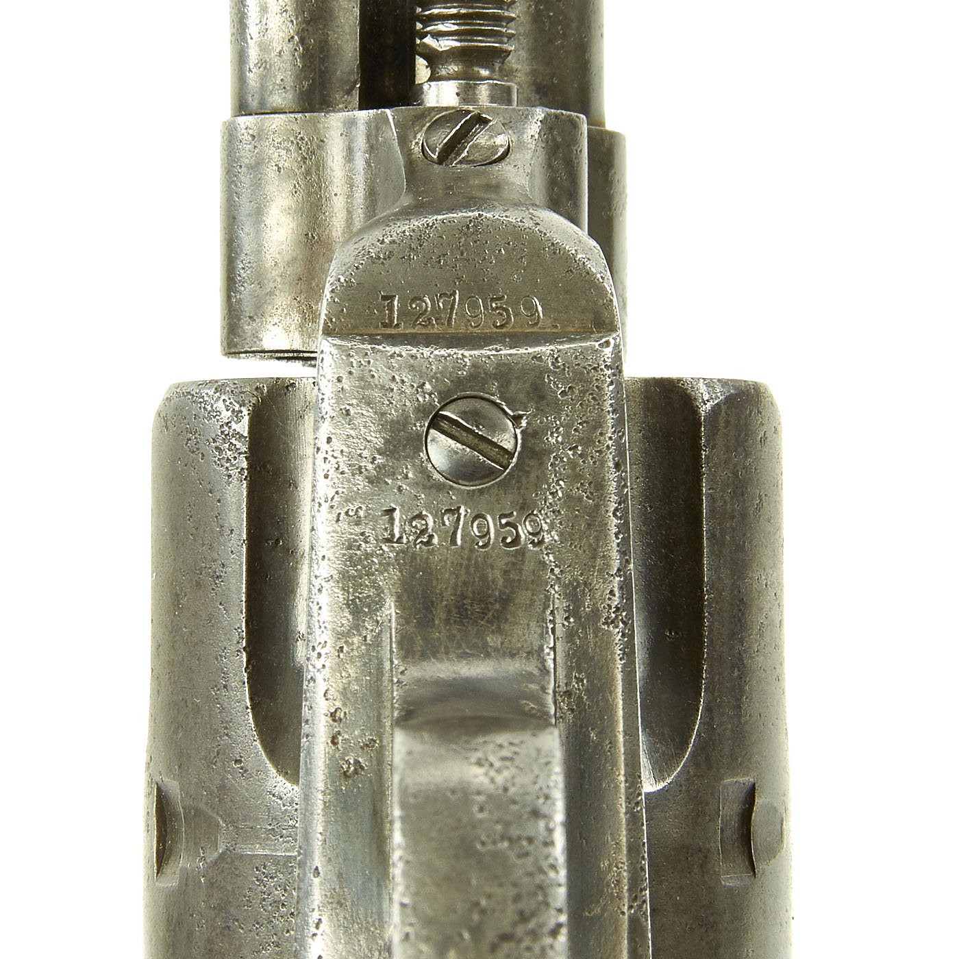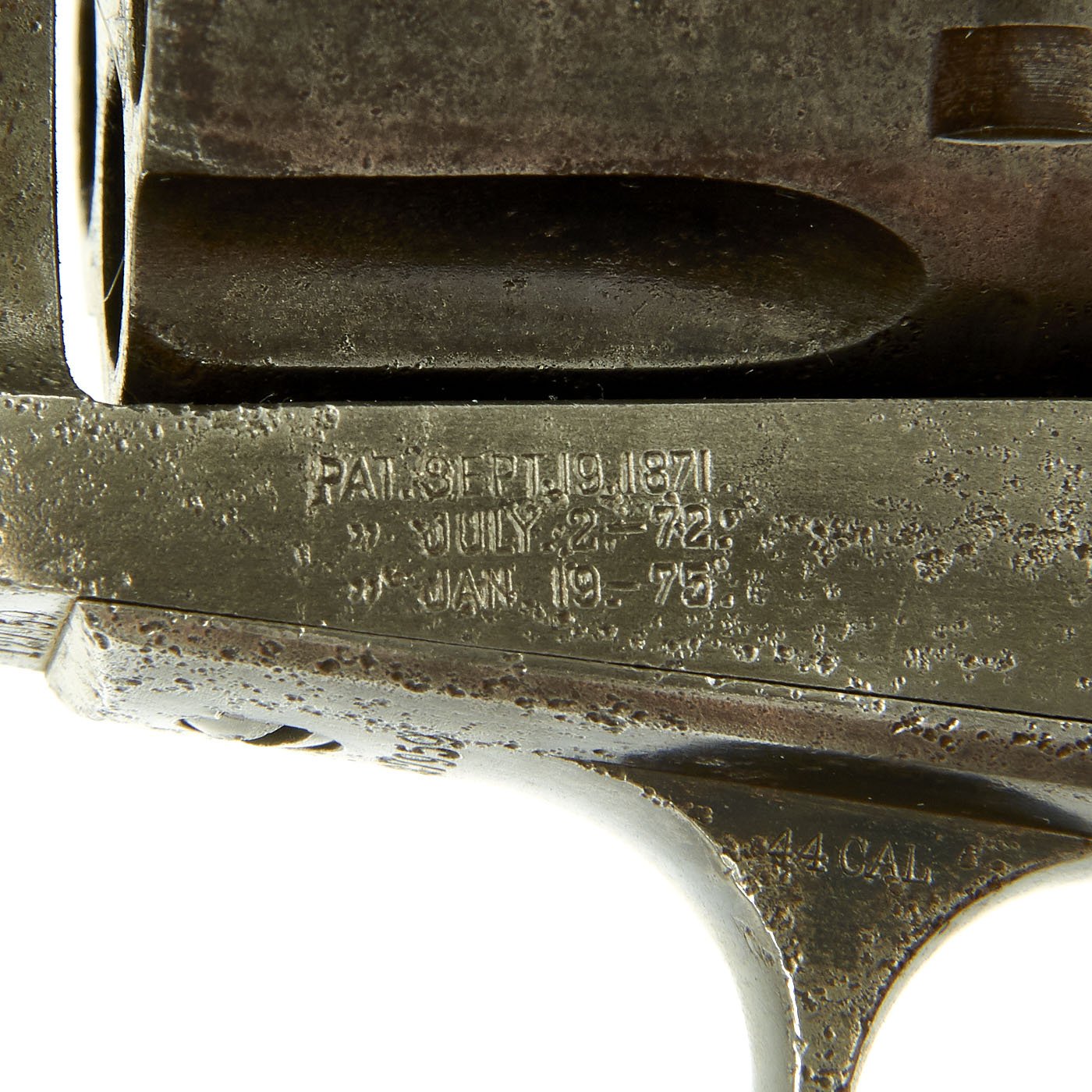 This revolver's serial number is 127959, which indicates it was manufactured in 1884, and it is marked 44 CAL on the front left of the trigger guard and 44 on the barrel, indicating the caliber. The left side of the frame shows patent dates of 1871, 1872 and 1875. The trigger guard, frame, cylinder and grip bottom strap strap have matching serial number, so this is an all matching revolver.