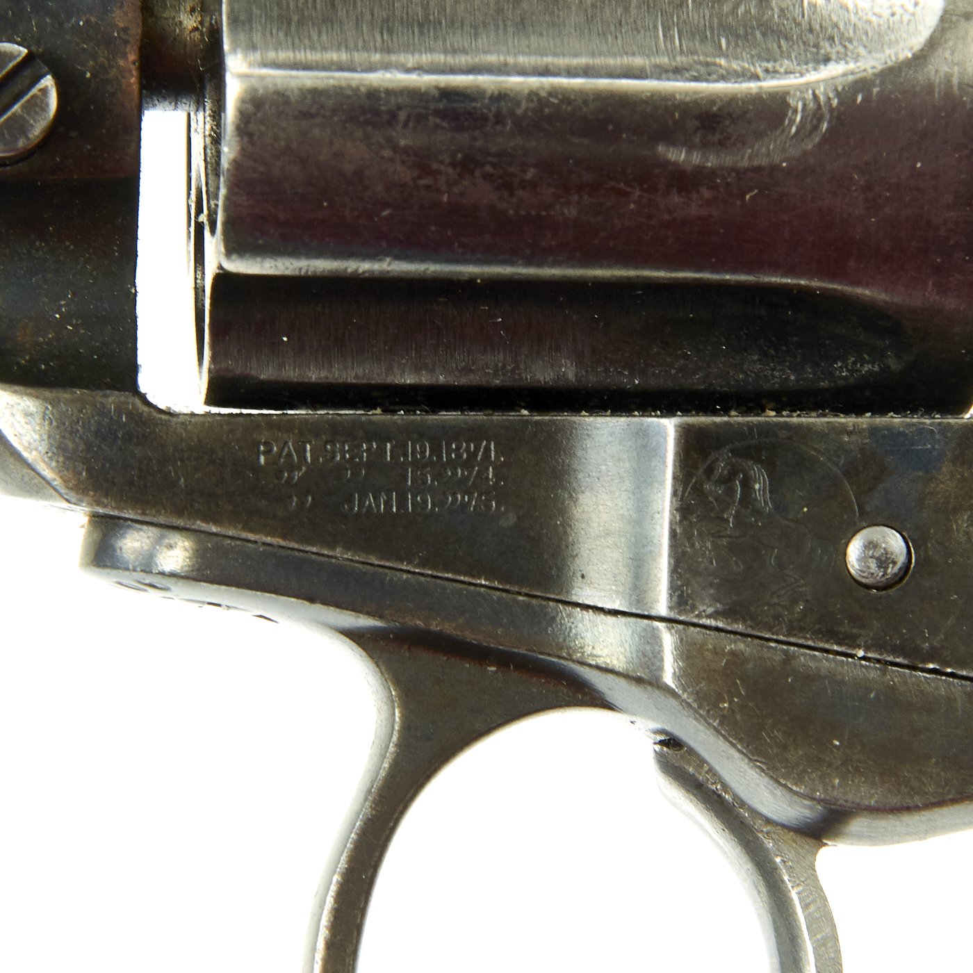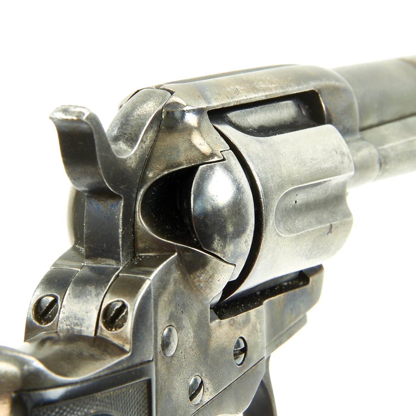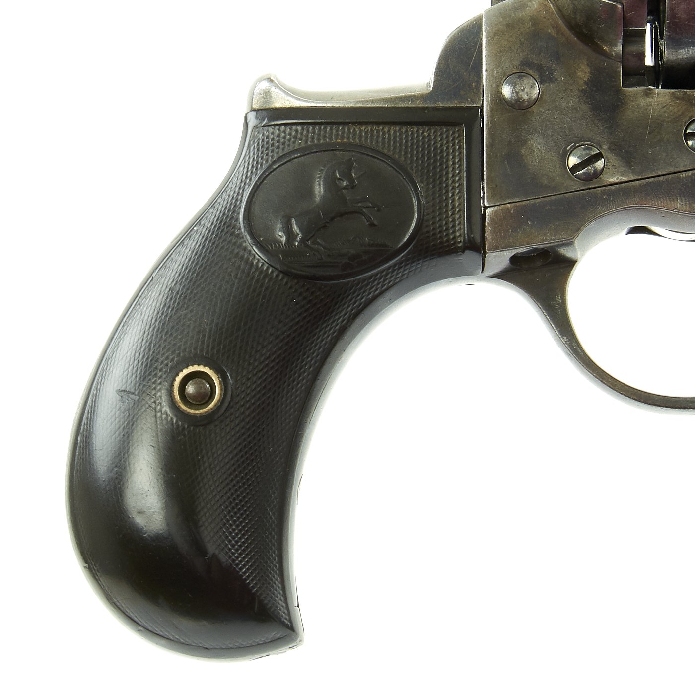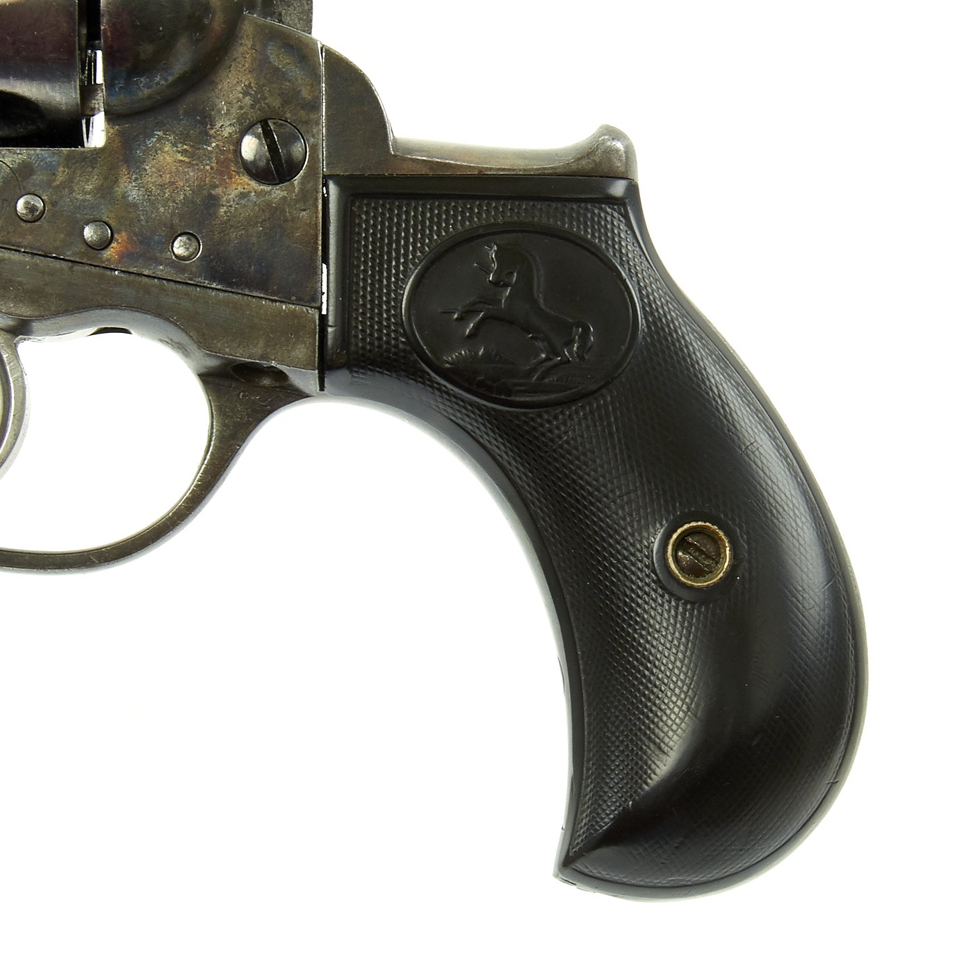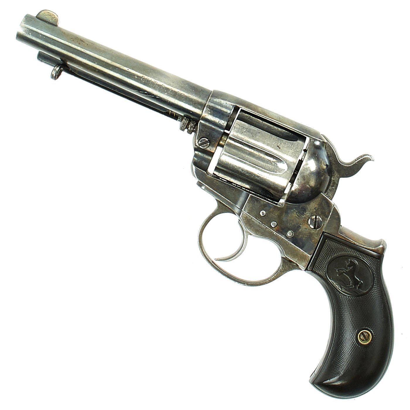 We purchased this revolver as a "LIGHTNING" with a 4 1/2" barrel, and it is in fine working order and condition. The action cycles correctly, though the cylinder lock is worn, so it sometimes doesn't index properly. This has its original case hardened and blued colors now turned to grey, though the barrel and trigger guard show traces of the original finish. It's bird's head gutta-percha grips bear the Colt prancing horse logo on each side. Grips show wear, but are solid, with no cracks or chips.