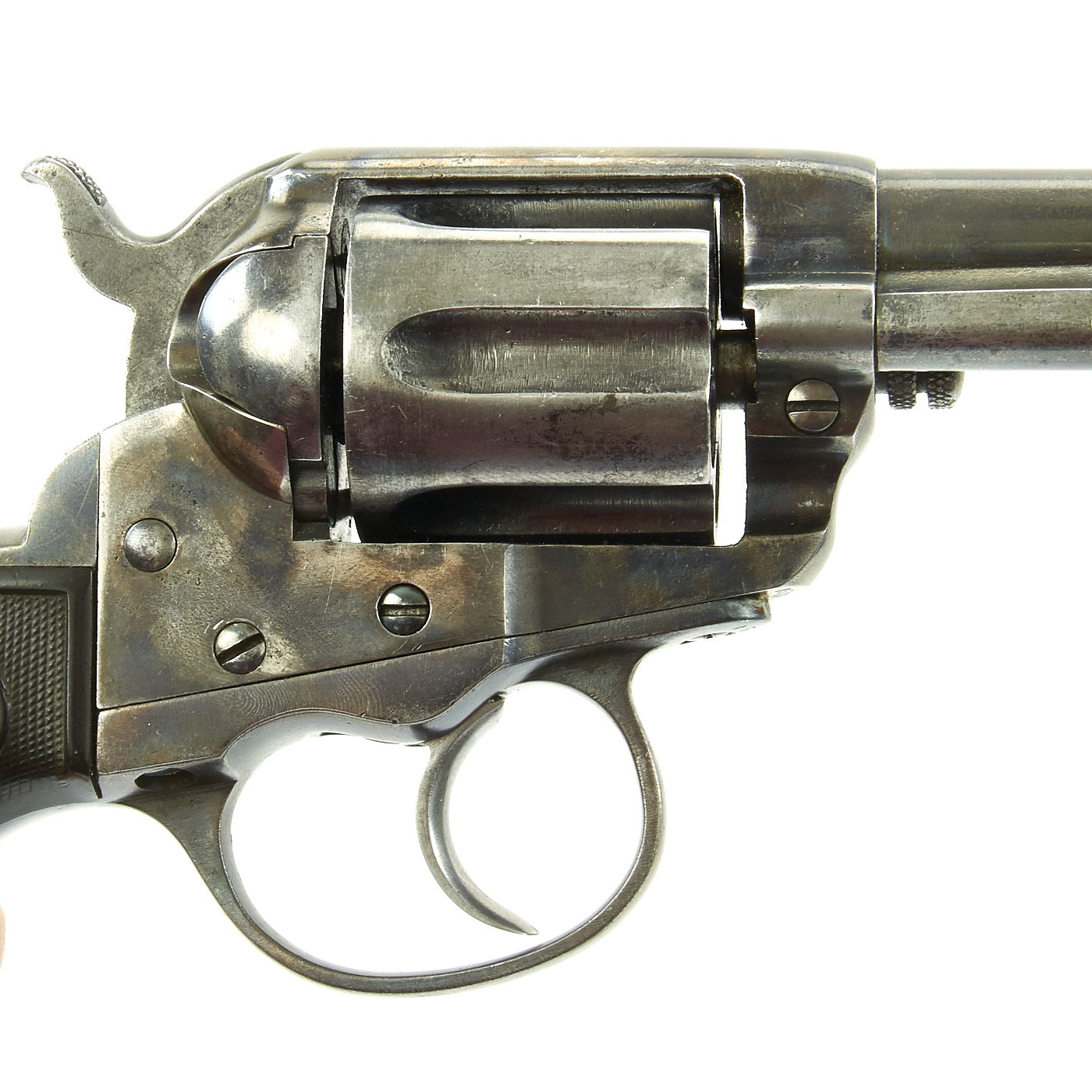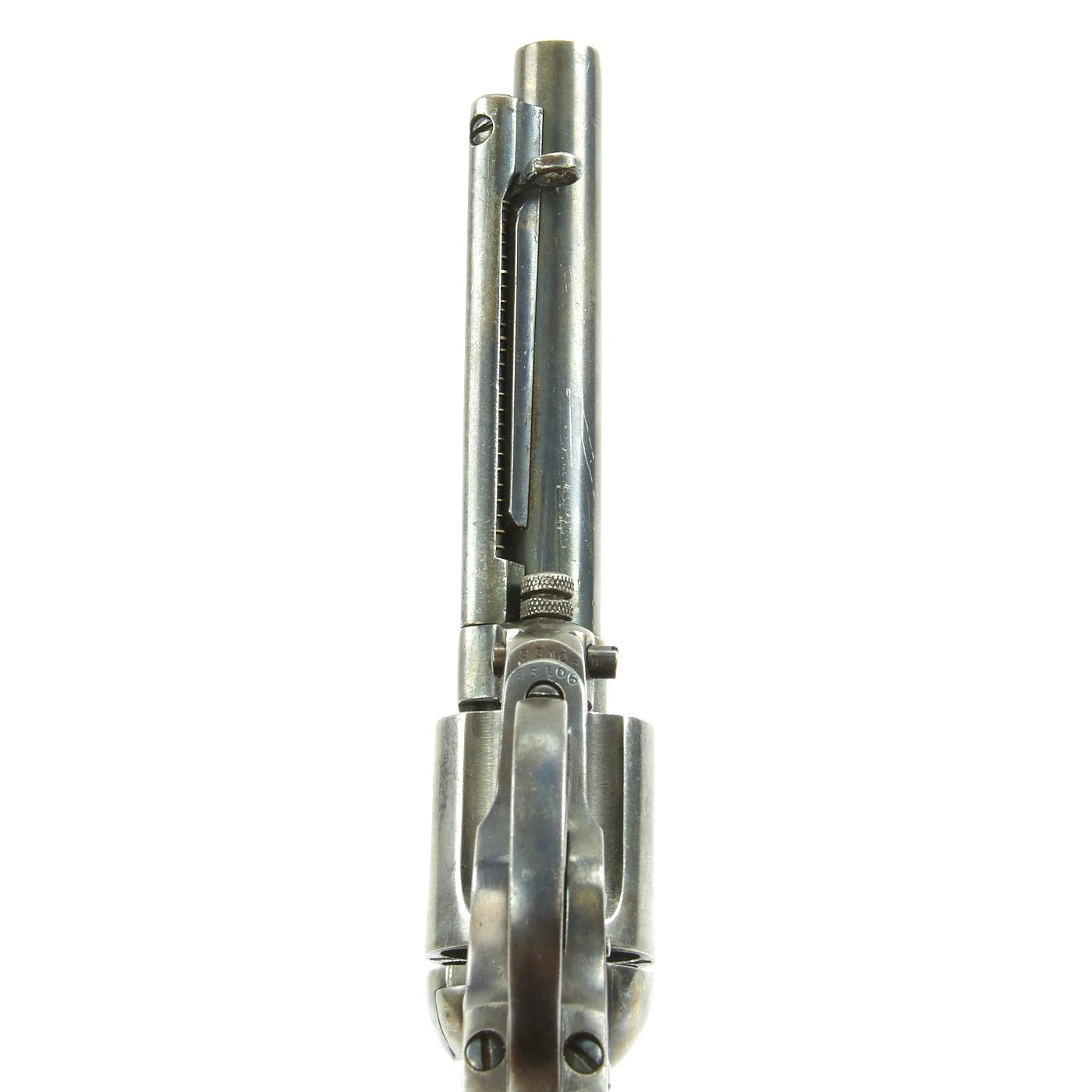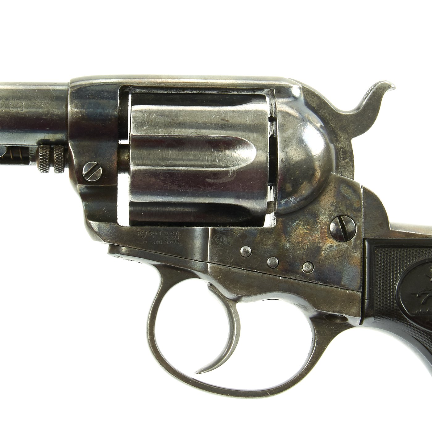 Original Item: Only One Available The romance around Colt "Cowboy" Revolvers never ceases to amaze us. This is a fine example of the Model 1877 "Lightning" Double Action .38 Caliber Revolver. It is marked on the bottom of the grip, frame, and trigger guard (faded) with serial number 85106, indicating it was made in 1891. The M1877 was offered from the factory in two basic finishes: nickel-plated or a case-hardened frame with a blue barrel and cylinder. The revolver was available in barrel lengths from 2.5" to 7.5" and was available with or without the ejector rod and housing. The shorter barreled versions without the ejector rod were marketed as "shopkeeper's specials". This version is marked on the barrel with:
