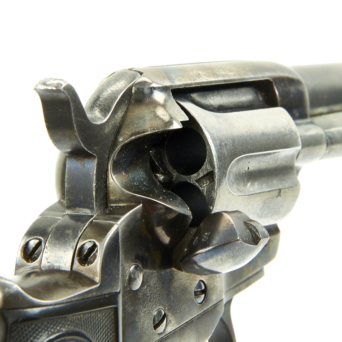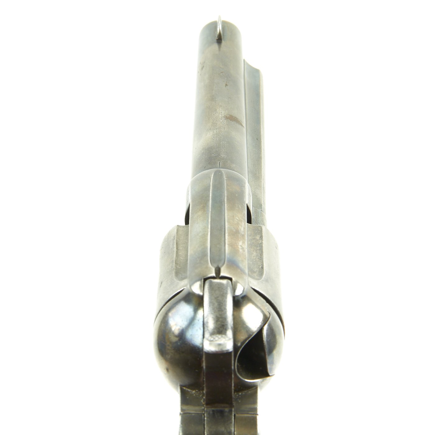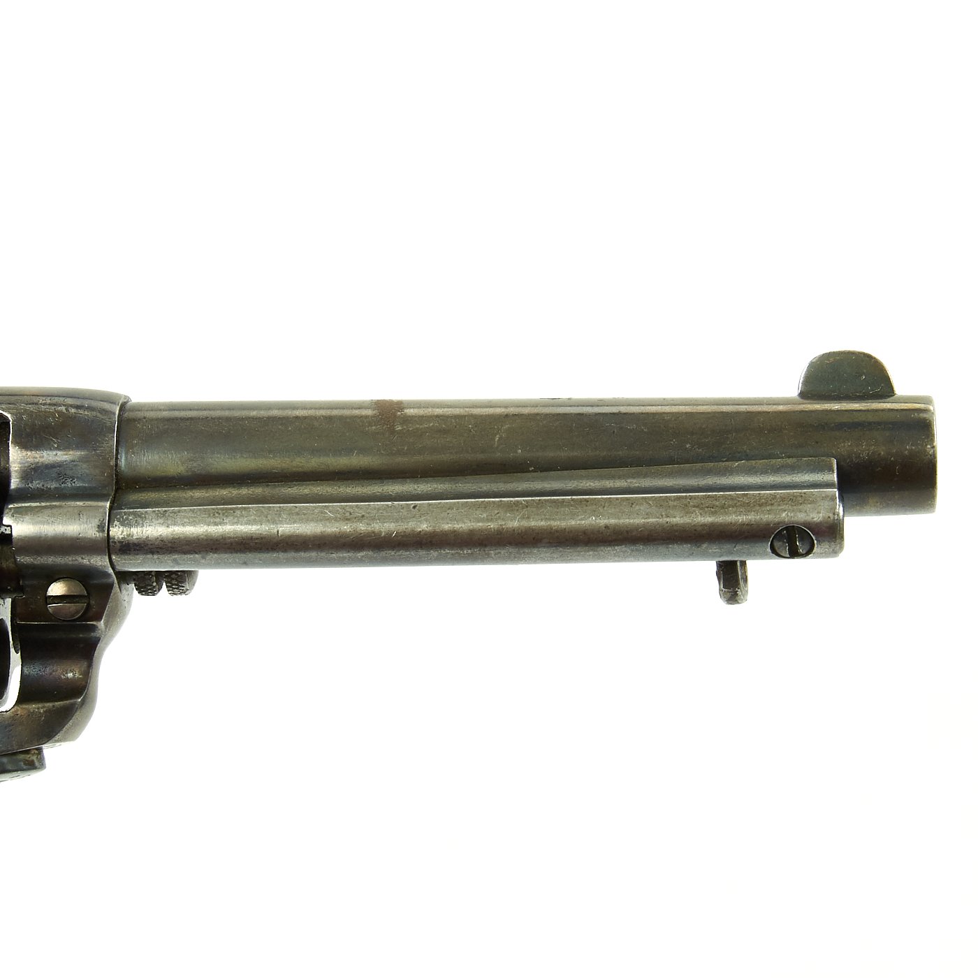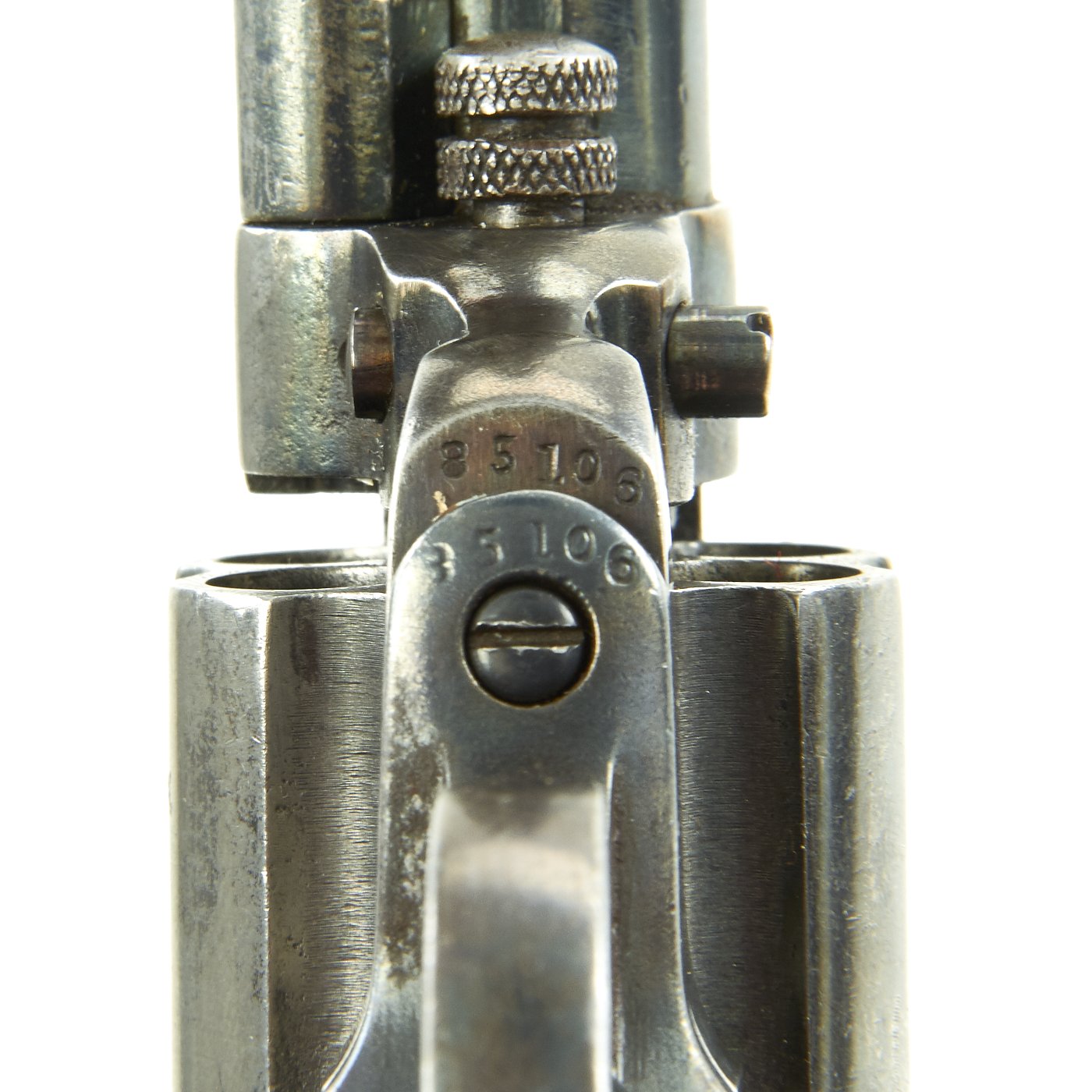 Original Item: Only One Available The romance around Colt "Cowboy" Revolvers never ceases to amaze us. This is a fine example of the Model 1877 "Lightning" Double Action .38 Caliber Revolver. It is marked on the bottom of the grip, frame, and trigger guard (faded) with serial number 85106, indicating it was made in 1891. The M1877 was offered from the factory in two basic finishes: nickel-plated or a case-hardened frame with a blue barrel and cylinder. The revolver was available in barrel lengths from 2.5" to 7.5" and was available with or without the ejector rod and housing. The shorter barreled versions without the ejector rod were marketed as "shopkeeper's specials". This version is marked on the barrel with: