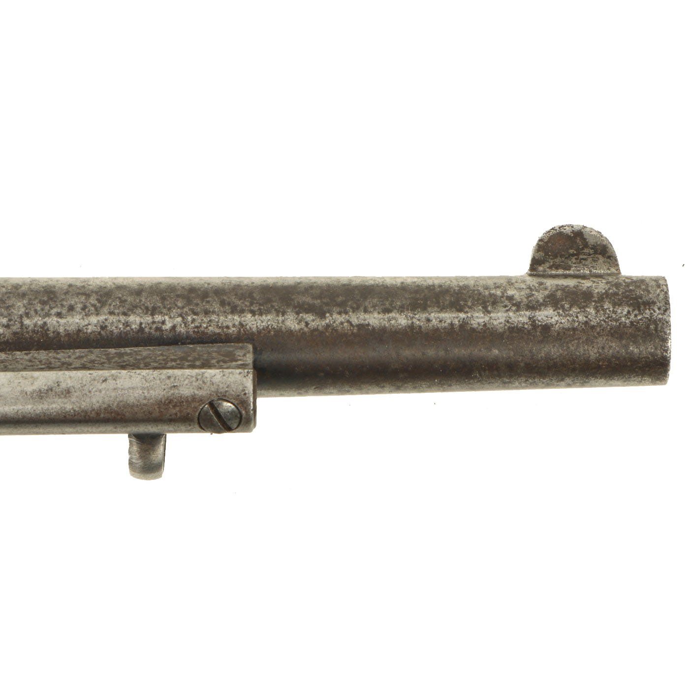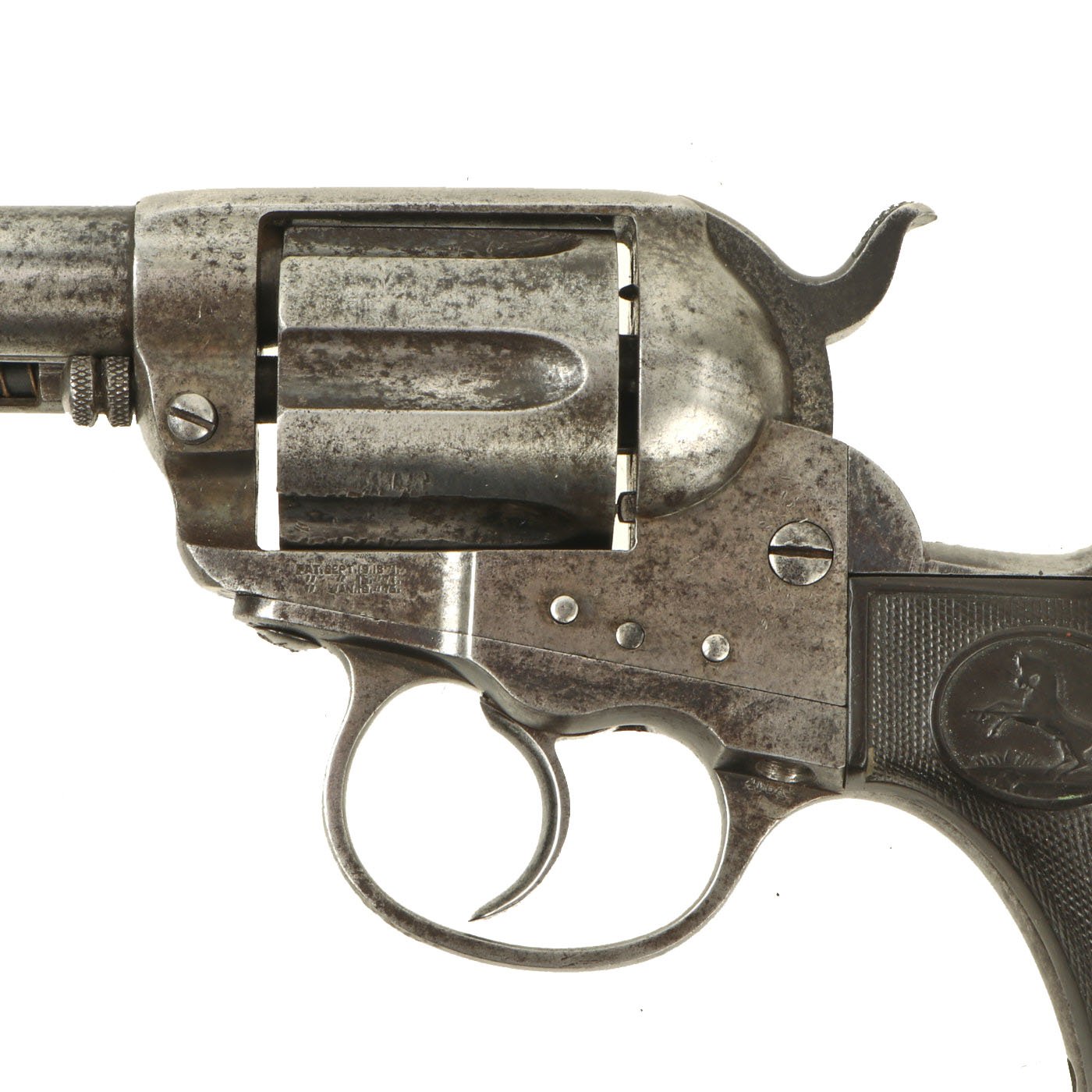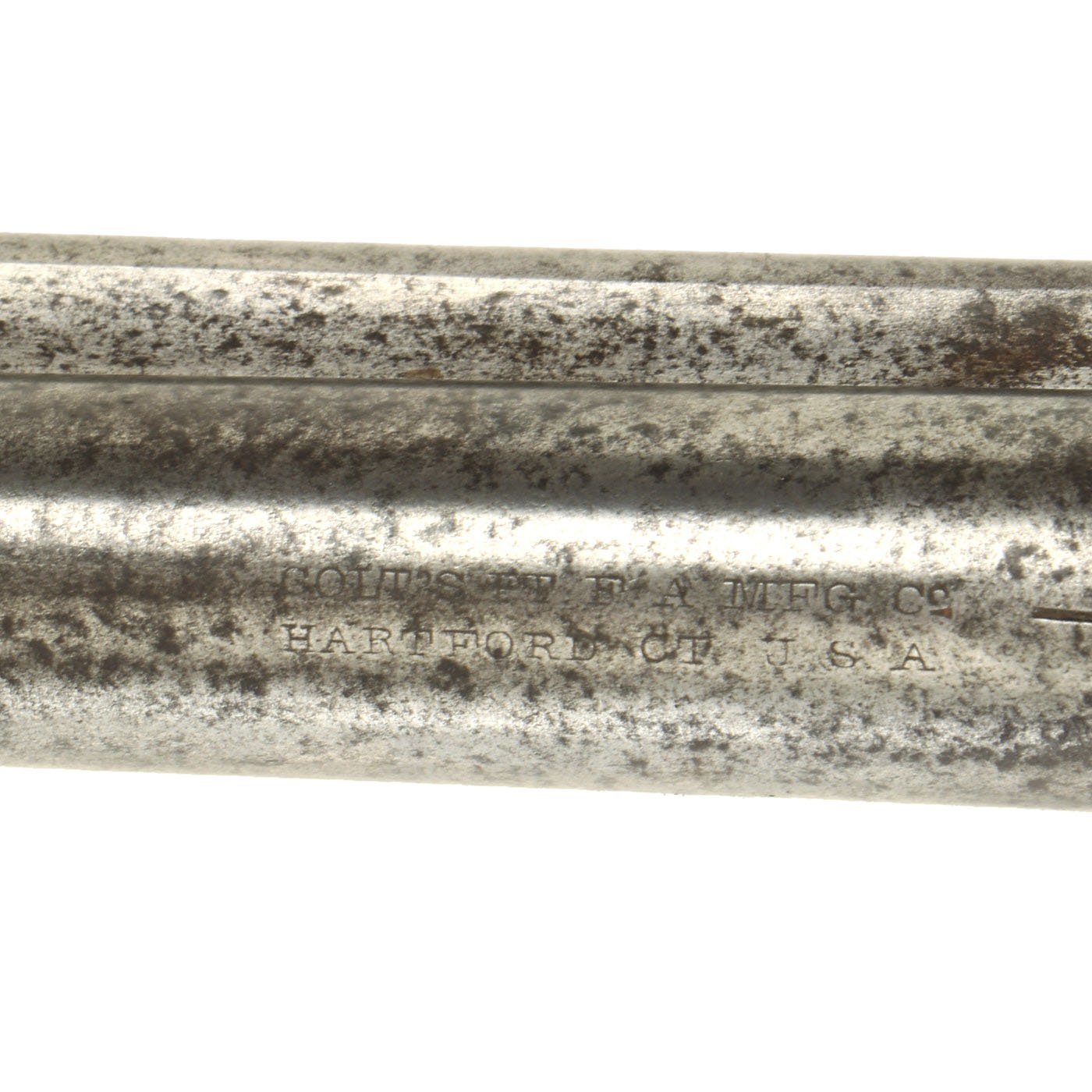We purchased this revolver as a "THUNDERER" and it is in good working order and condition. This revolver still has small traces of the original blued finish, however most of it has now turned to a grey patina. The left side of the frame still has the original Colt patent dates listed. Its bird's head gutta-percha grips bear the Colt prancing horse logo on each side, and still have a good deal of the original checkering. The right grip does have more wear though, and is also missing a substantial chunk on the bottom. In very nice unmessed with condition.