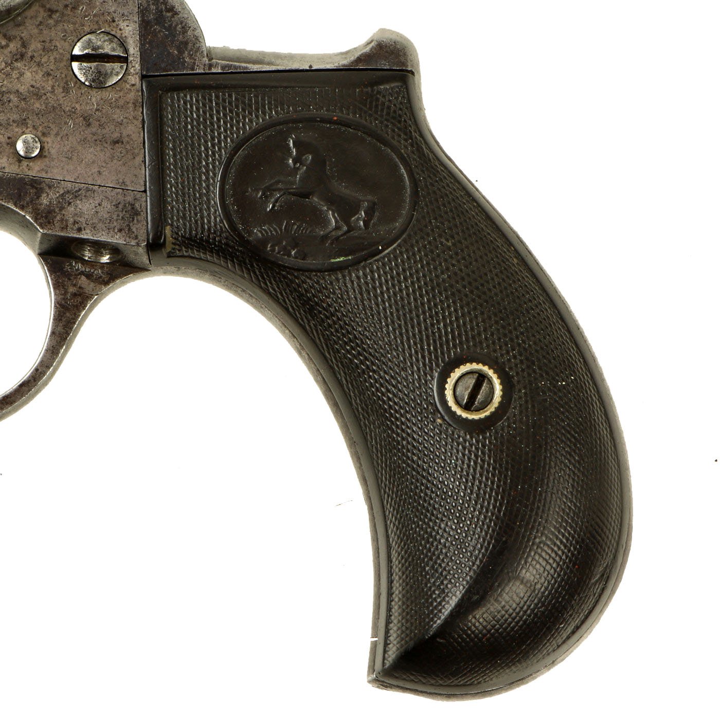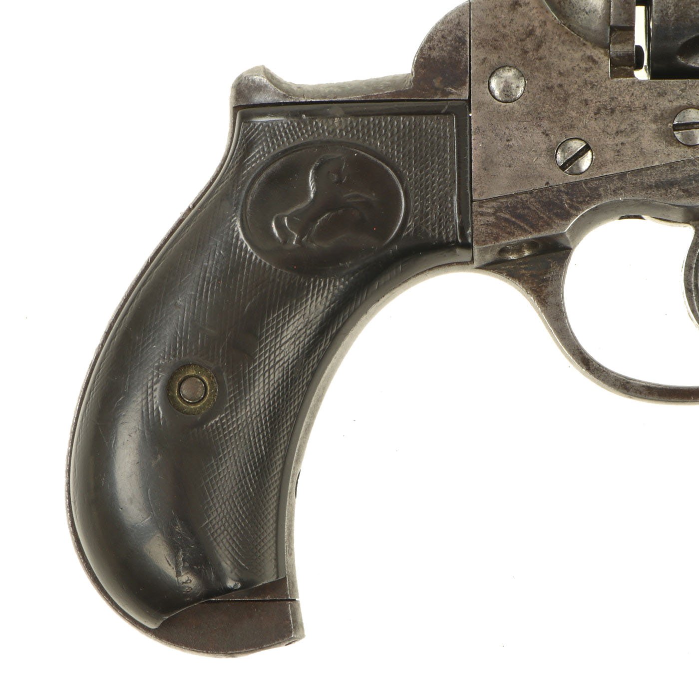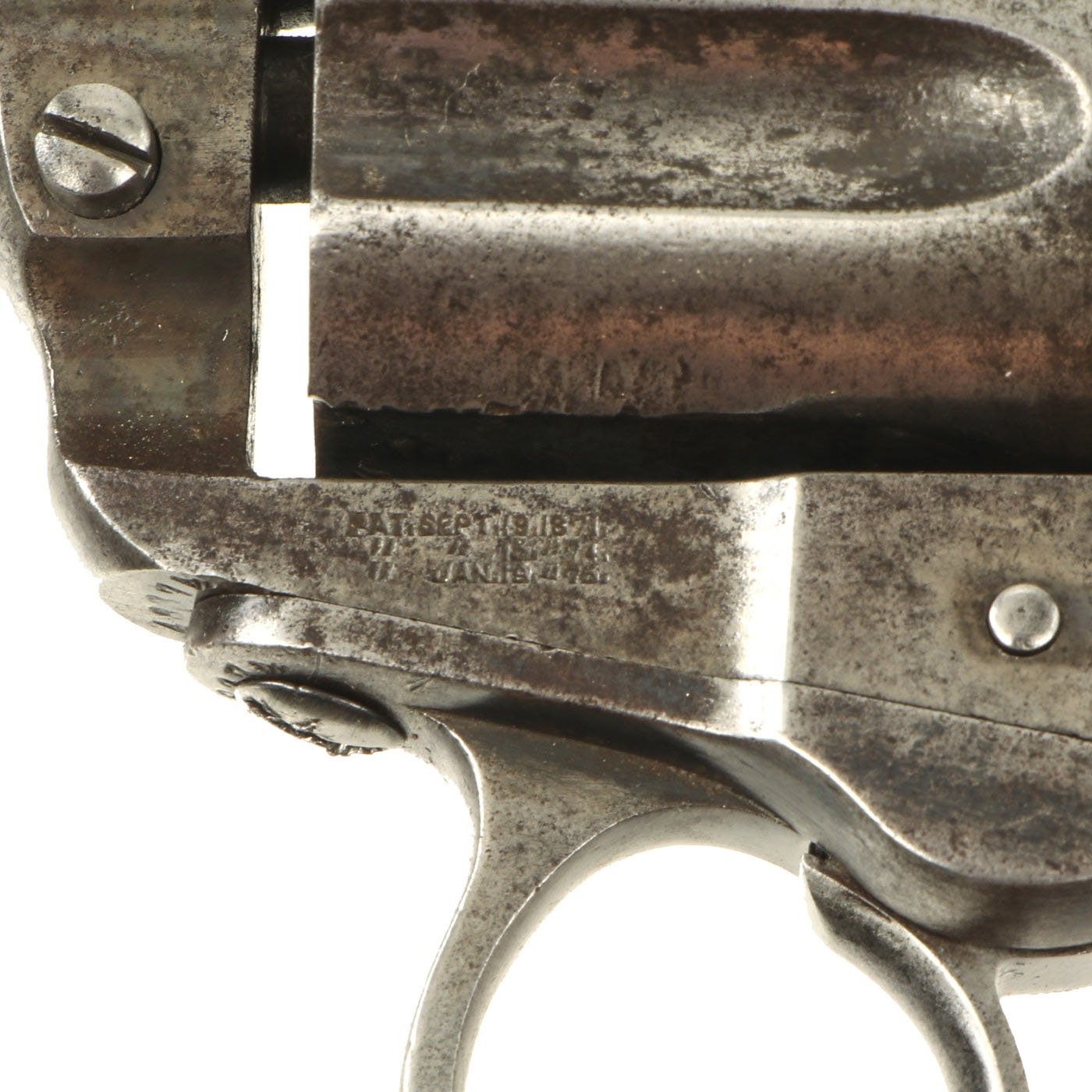 We purchased this revolver as a "THUNDERER" and it is in good working order and condition. This revolver still has small traces of the original blued finish, however most of it has now turned to a grey patina. The left side of the frame still has the original Colt patent dates listed. Its bird's head gutta-percha grips bear the Colt prancing horse logo on each side, and still have a good deal of the original checkering. The right grip does have more wear though, and is also missing a substantial chunk on the bottom. In very nice unmessed with condition.