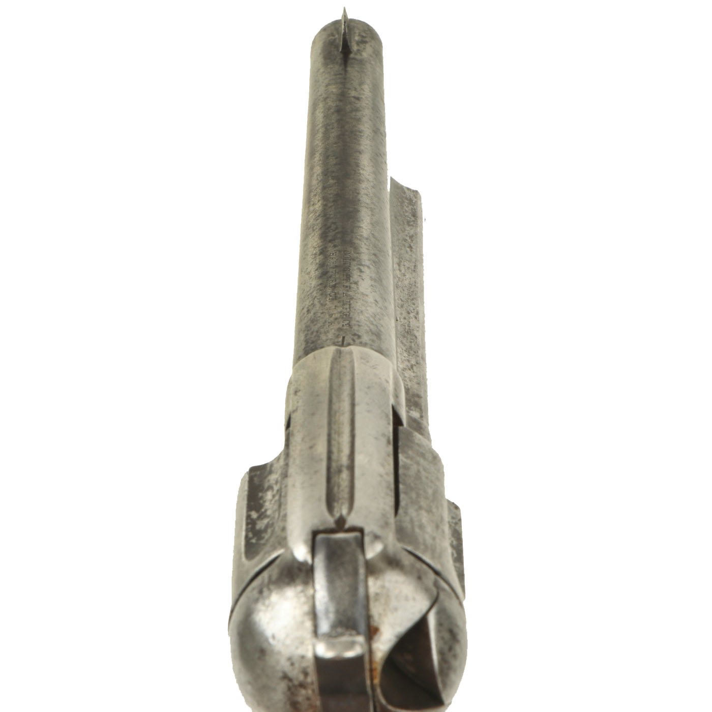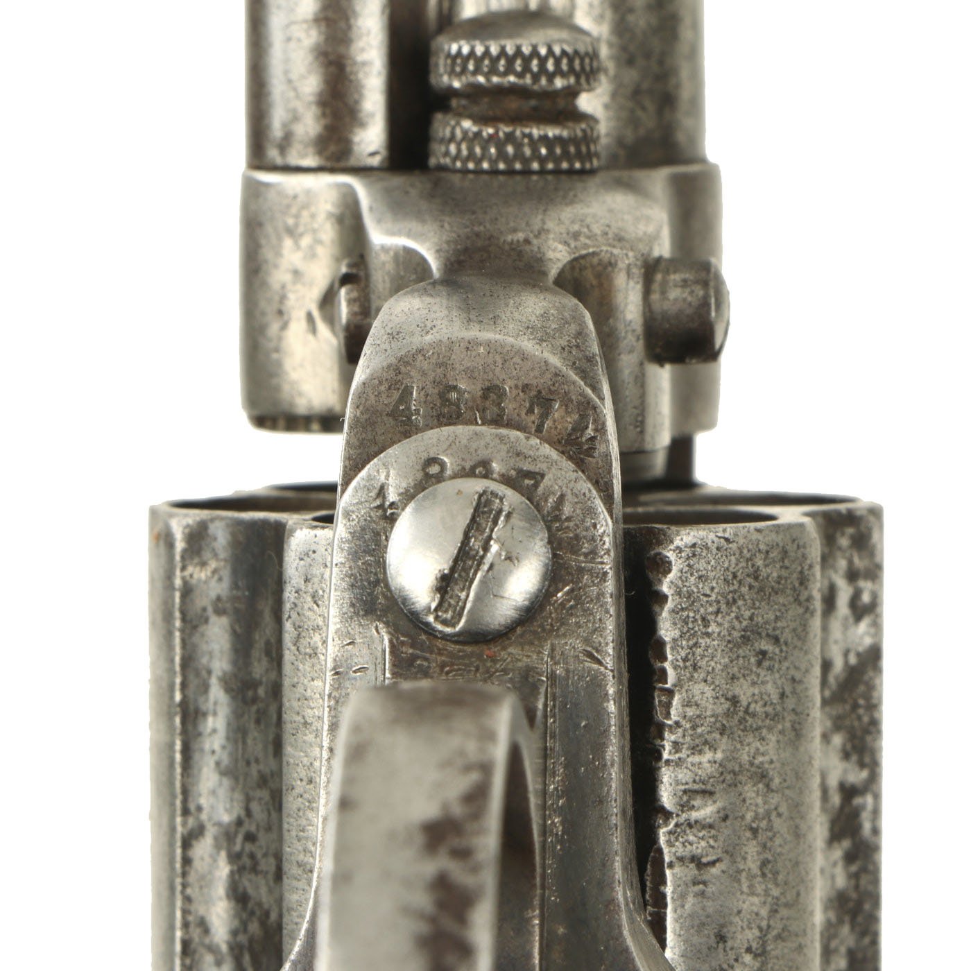 The revolver functions correctly, though the action is worn and definitely has some slop in the mechanics. The cylinder lockup is a bit weak, and the indexing is slightly off. It works in both single and double action, and as with any revolver of this age and amount of use, it can be finicky. The bore shows clear lands and grooves, and a partly bright finish with areas of oxidation and fouling.