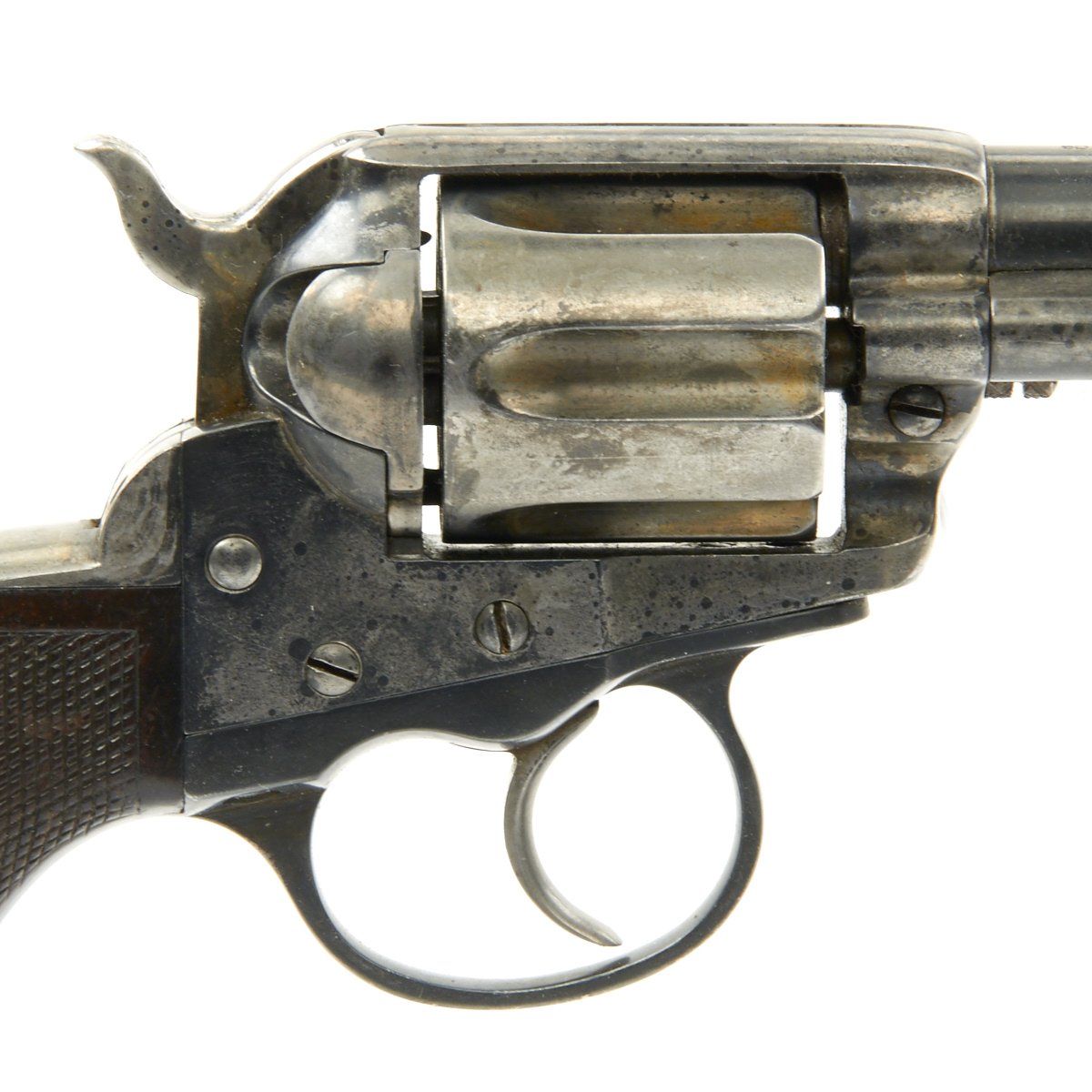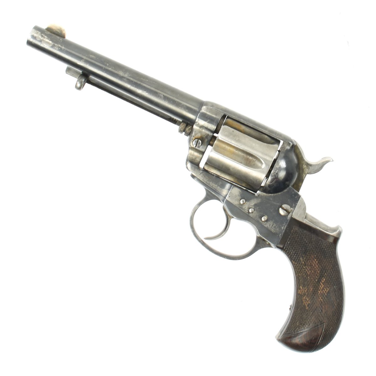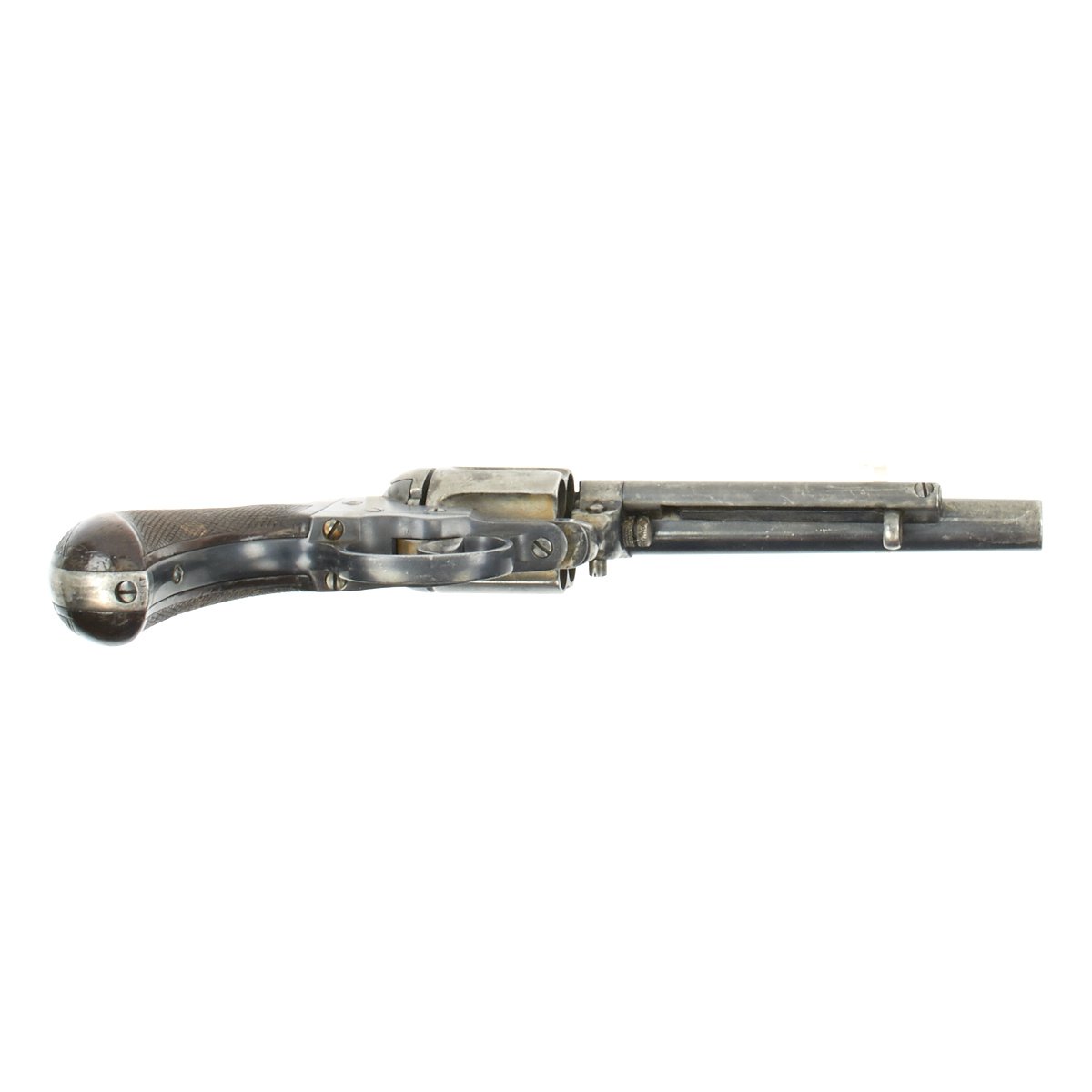 We purchased this revolver as a "THUNDERER" and it is in fine working order and condition. This has its original case hardened and blued colors retained to a good degree. It's bird's head grips are made of real wood, which looks to be rosewood, and they have a great grain. Grips show some wear, but are solid, with no cracks or chips, and most of the original checkering is intact.