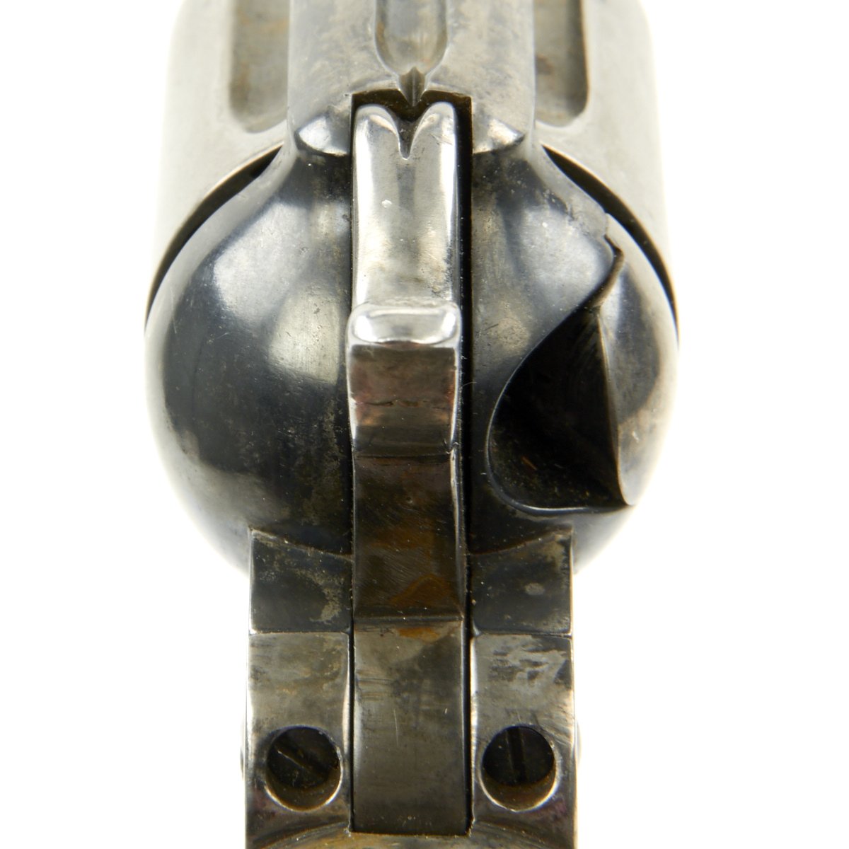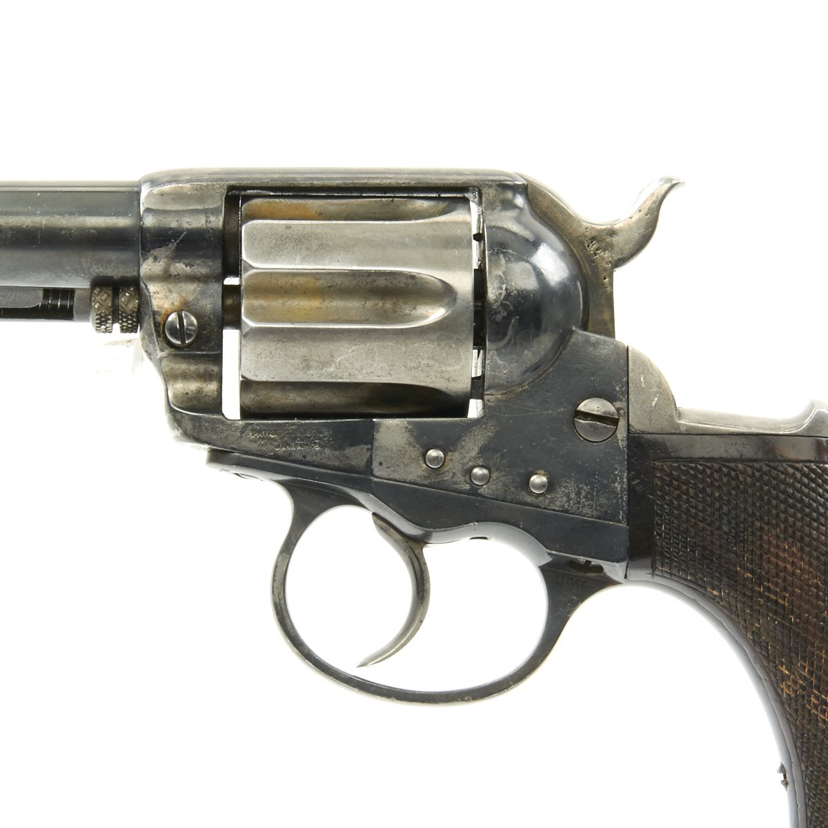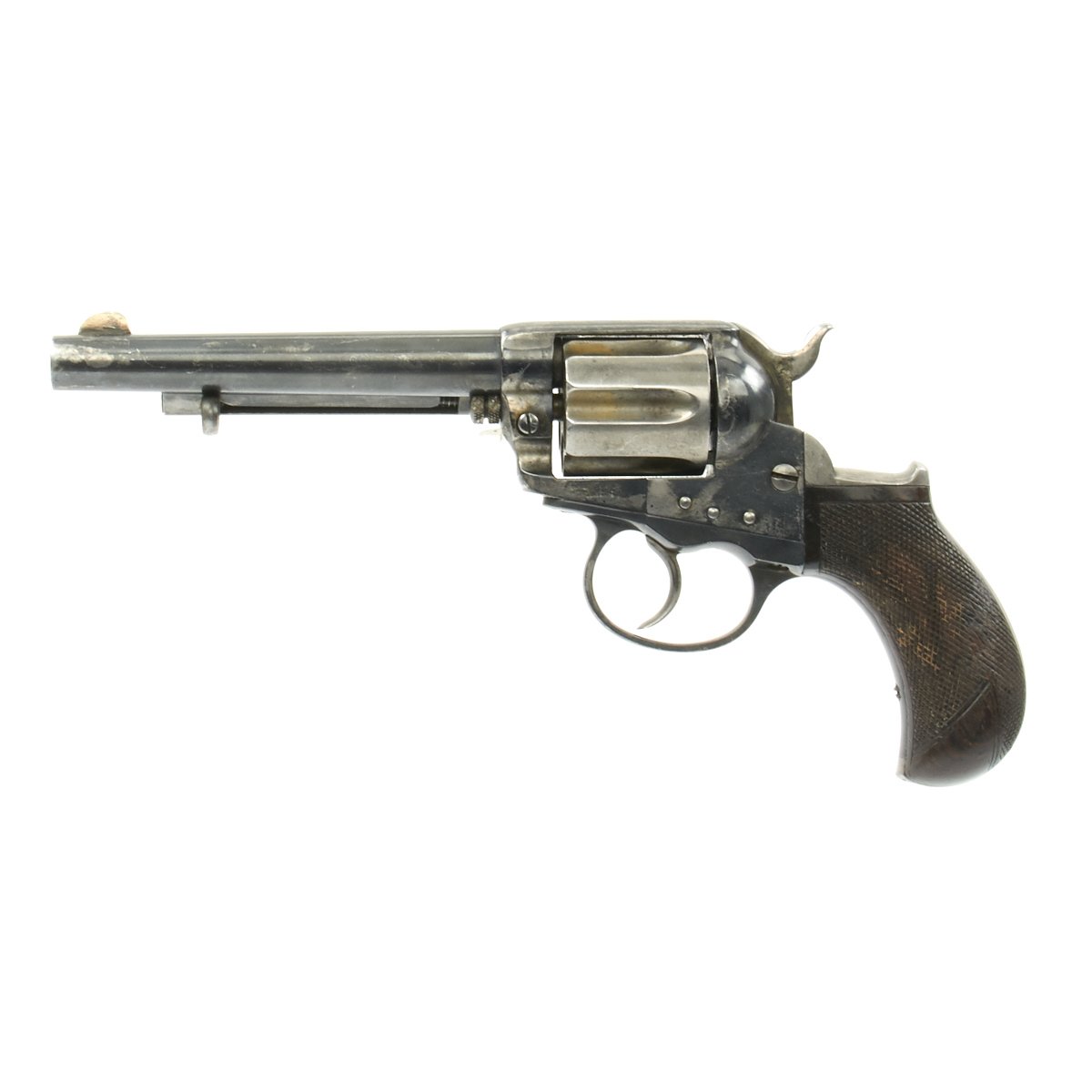 We purchased this revolver as a "THUNDERER" and it is in fine working order and condition. This has its original case hardened and blued colors retained to a good degree. It's bird's head grips are made of real wood, which looks to be rosewood, and they have a great grain. Grips show some wear, but are solid, with no cracks or chips, and most of the original checkering is intact.
