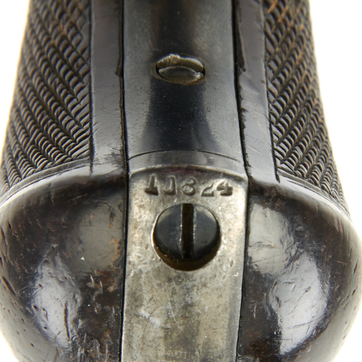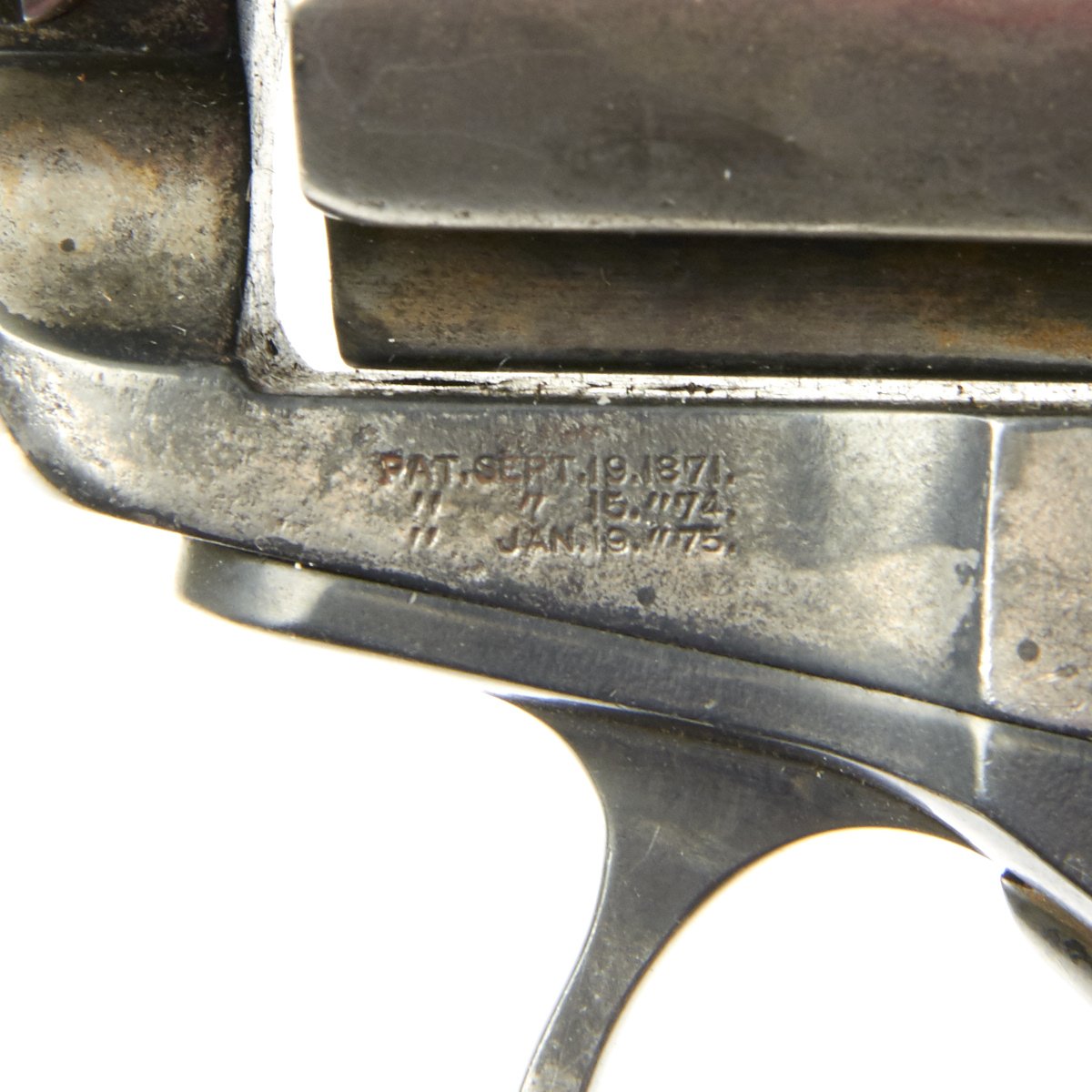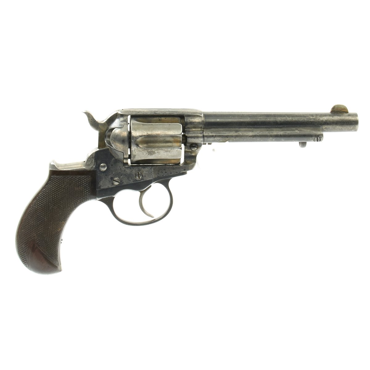 It is marked on the bottom of the grip, frame, and trigger guard with serial number 10842, indicating it was made in 1878. The M1877 was offered from the factory in two basic finishes: nickel-plated or a case-hardened frame with a blue barrel and cylinder. The revolver was available in barrel lengths from 2.5" to 7.5" and was available with or without the ejector rod and housing. The shorter barreled versions without the ejector rod were marketed as "shopkeeper's specials".