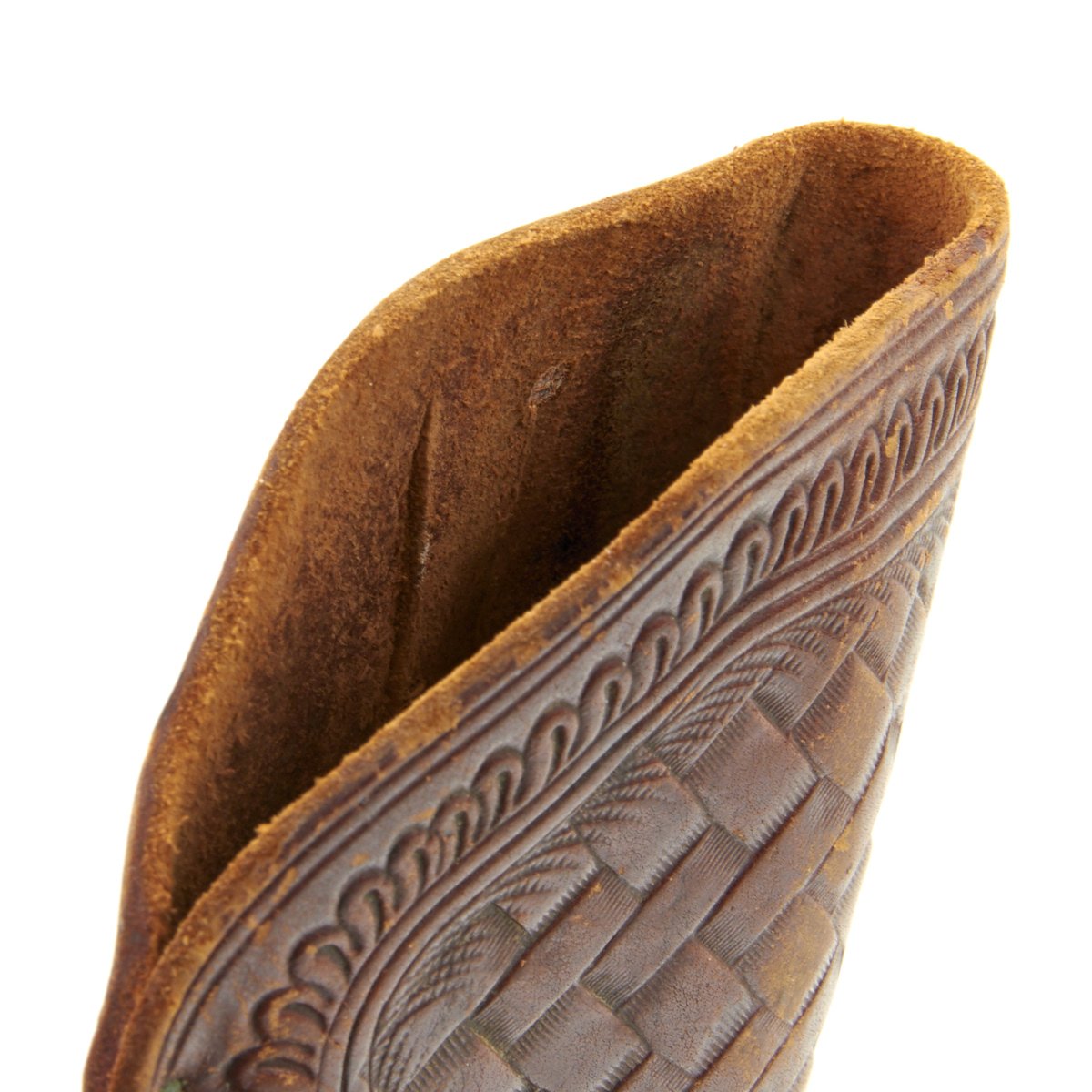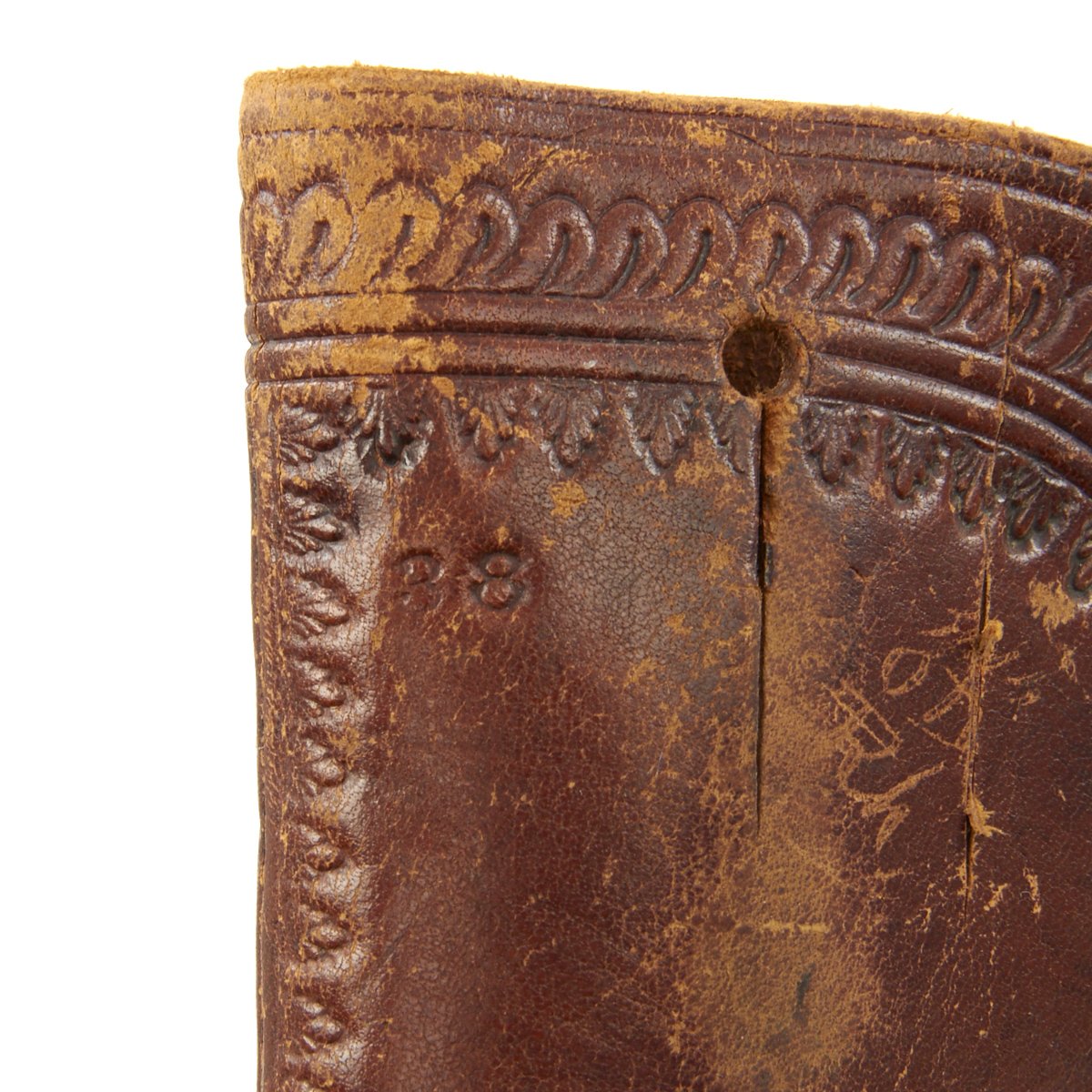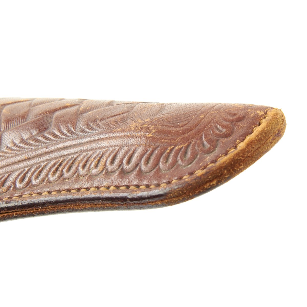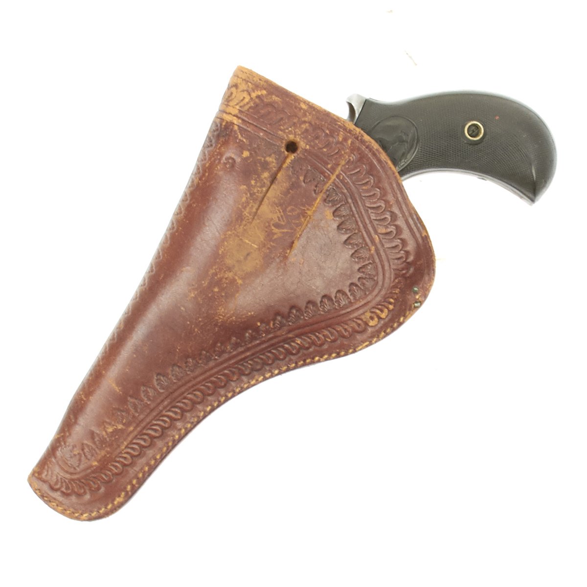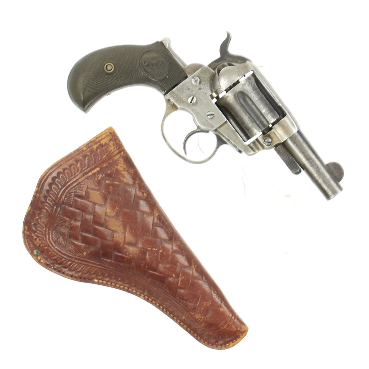 We purchased this revolver as a SHERIFF'S MODEL variety of the "LIGHTNING" and it is in fine working order and condition. This has its original case hardened and blued colors now turned to grey. It's bird's head gutta-percha grips bear the Colt prancing horse logo on each side and the revolver comes with its original very nicely tooled leather holster the rear of which has been slit to wear with a waist belt. Some of the stitching has pulled out, but that would be easily fixed.