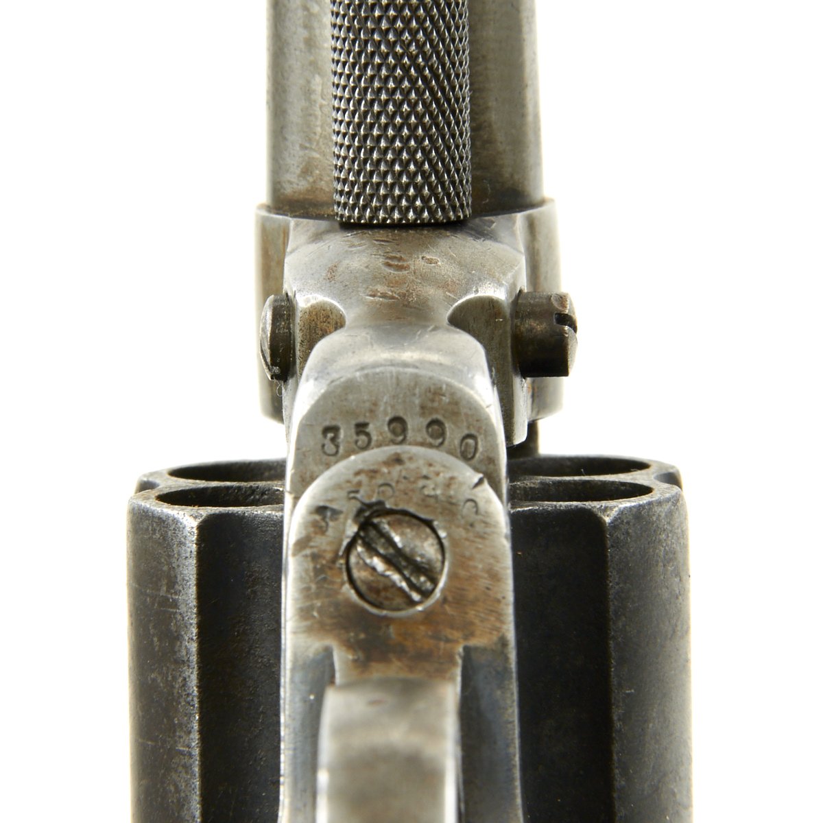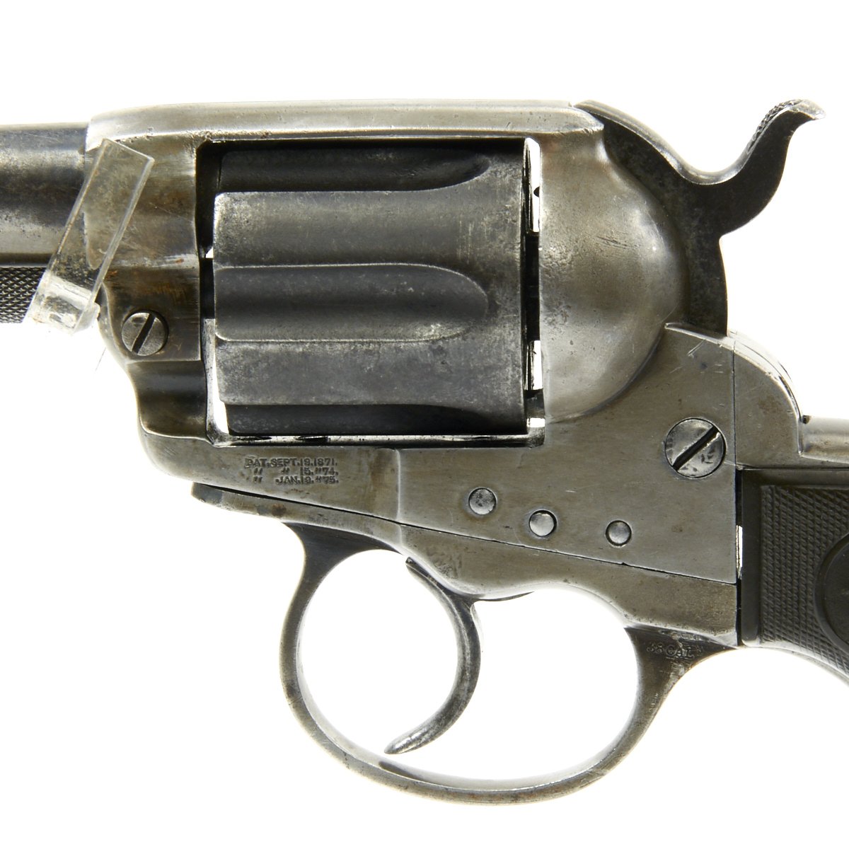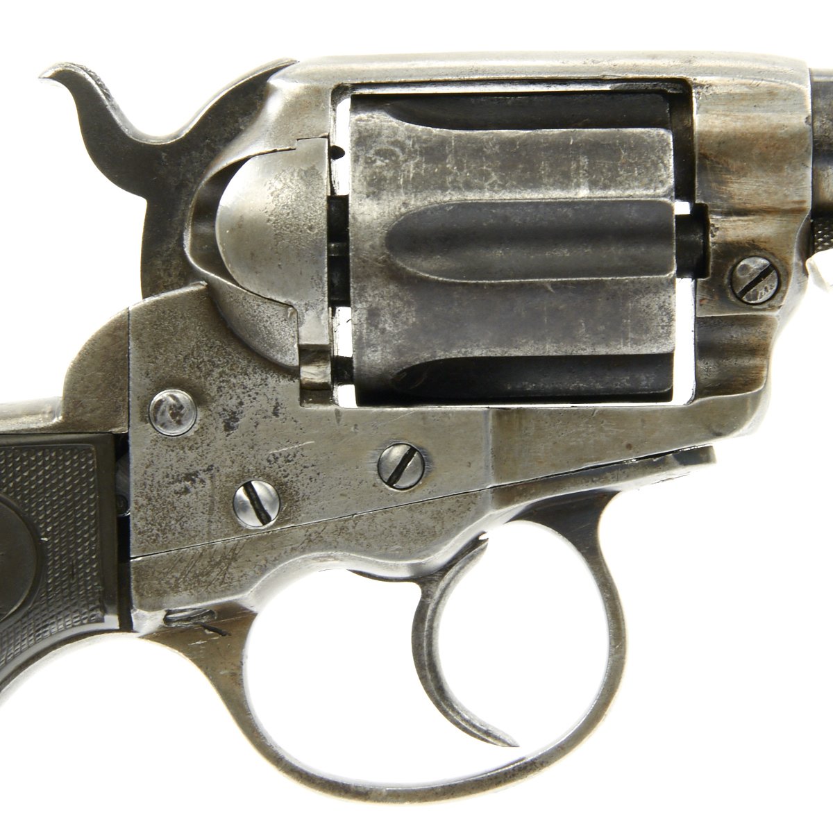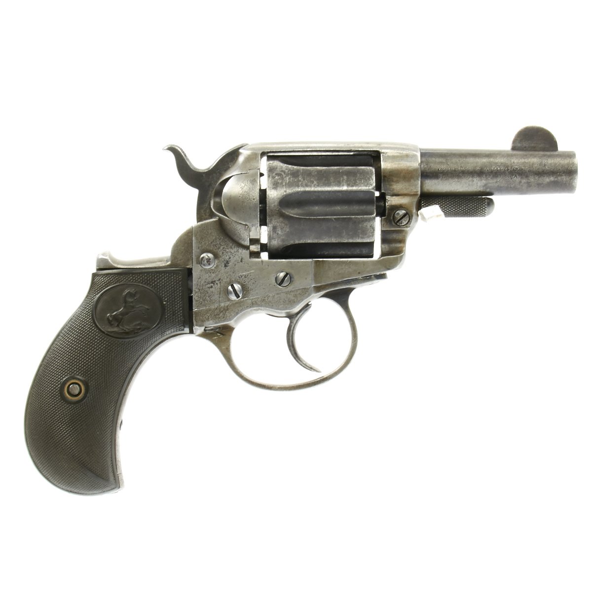 Original Item: Only One Available The romance around Colt "Cowboy" Revolvers never ceases to amaze us. This is a fine example of the Model 1877 "Lightning" Double Action .38 Caliber Revolver. It is marked on the bottom of the grip, frame, and trigger guard (faded) with serial number 35990, indicating it was made in 1882. The M1877 was offered from the factory in two basic finishes: nickel-plated or a case-hardened frame with a blue barrel and cylinder. The revolver was available in barrel lengths from 2.5" to 7.5" and was available with or without the ejector rod and housing. The shorter barreled versions without the ejector rod were marketed as "shopkeeper's specials". This version is marked on the barrel with: