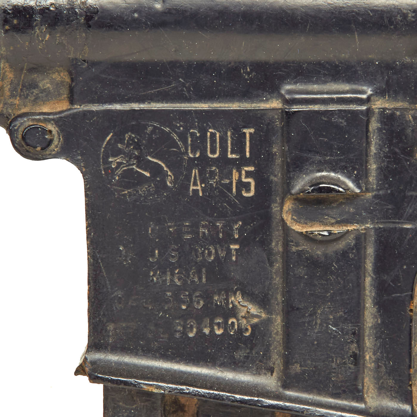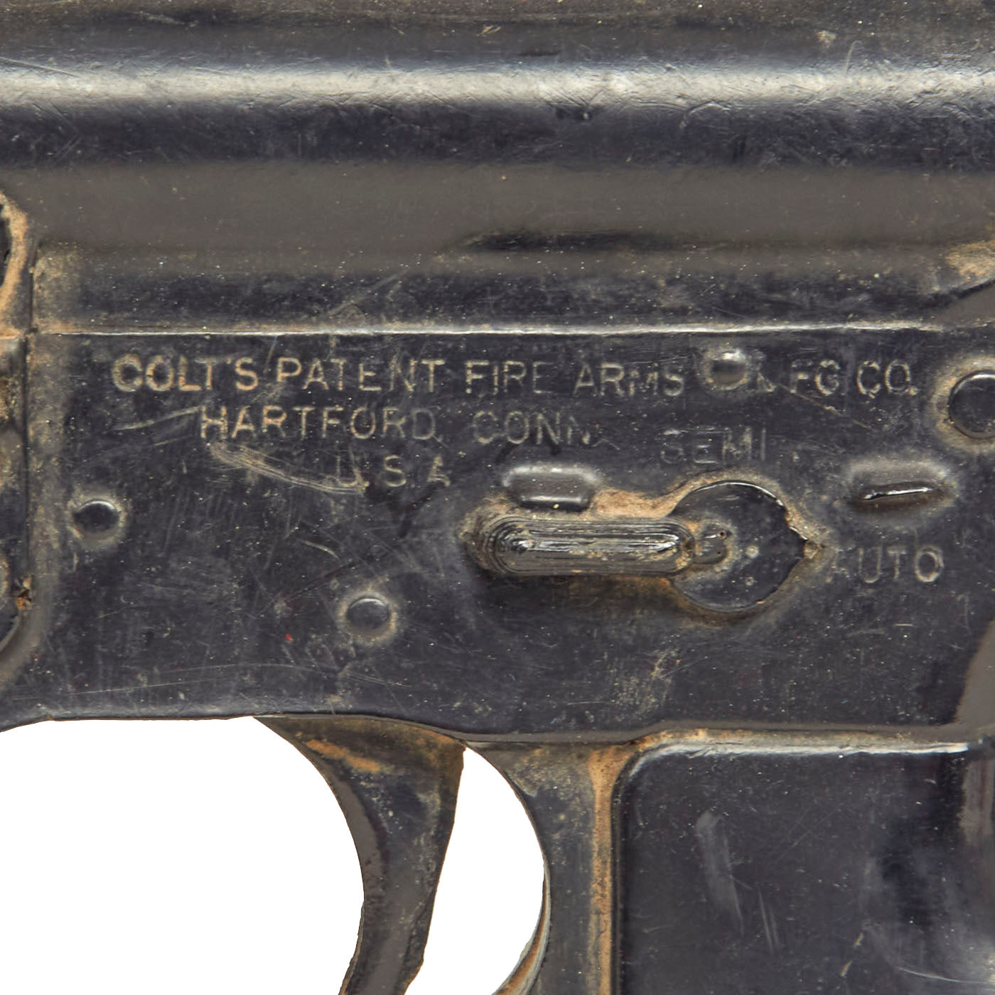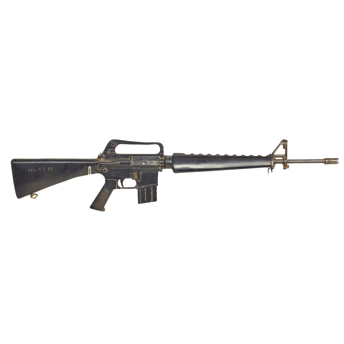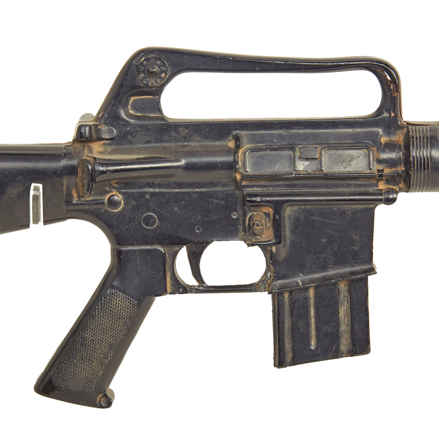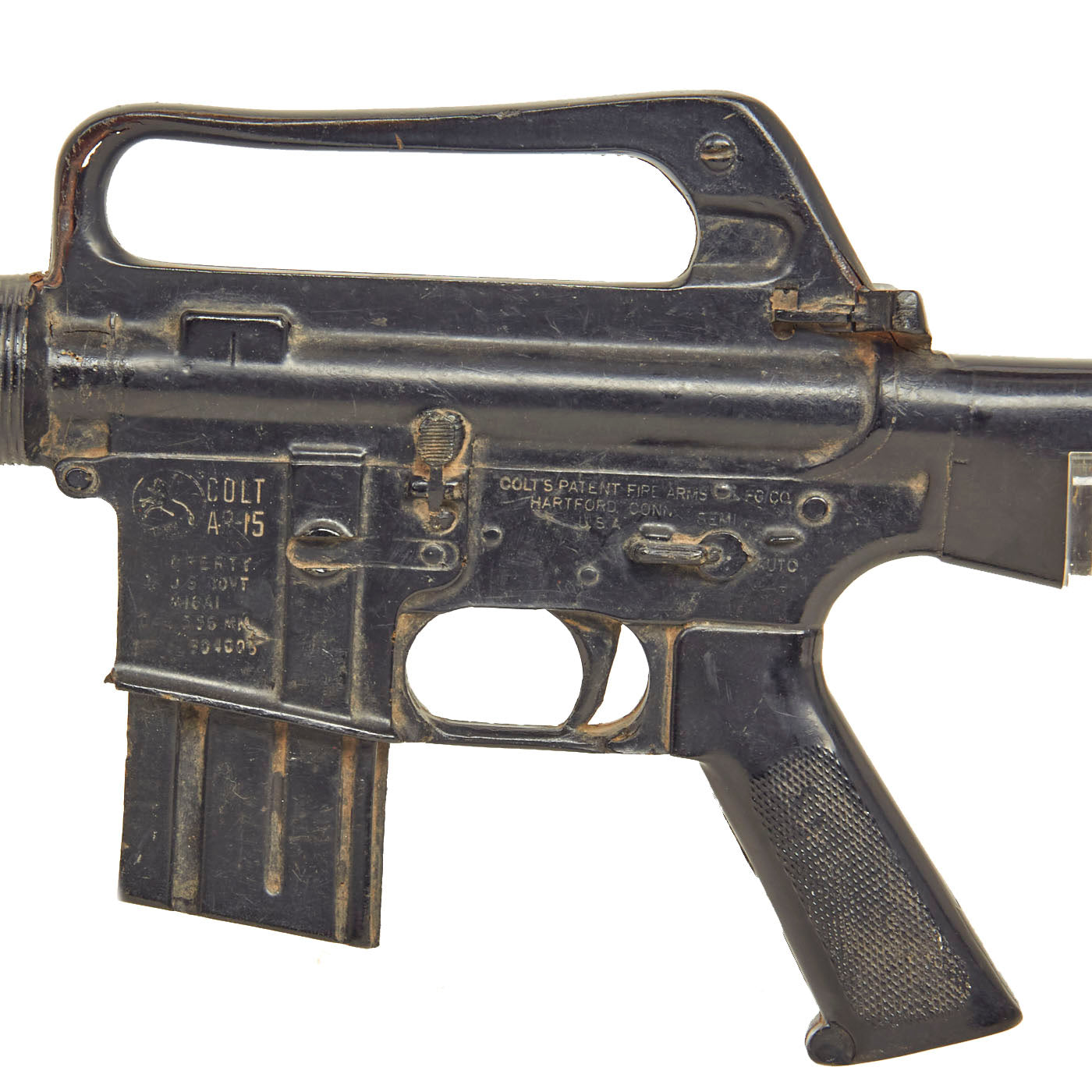 The military calls these rifles Rubber Ducks. This is an actual military issue trainer designed to be the correct weight and size of an M16A1. They are made from decommissioned M16/A1/A2 parts, which were then used during the molding process. Markings on these varied, and many had markings removed or changed while in service. This example is marked on the magazine well: