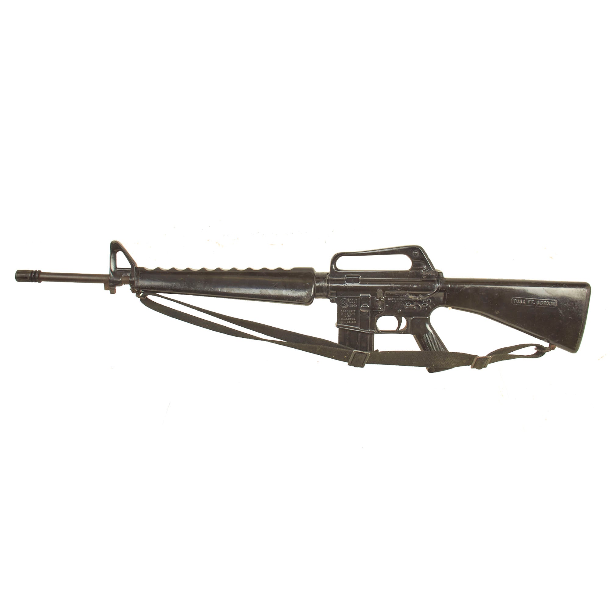Original Item: Only One available. Colt M16A1 Military issue non-functional RUBBER DUCK training and parade rifle. Features genuine M16 metal barrel, muzzle brake, front sight, sling swivels, and other components, all coated in rubber with resin construction.