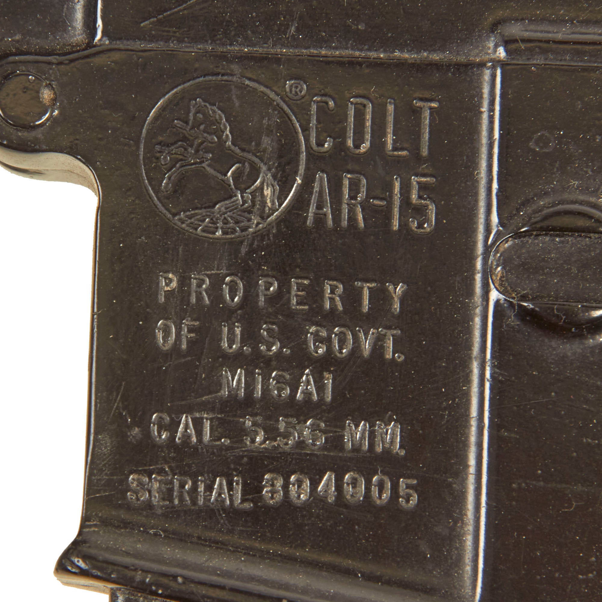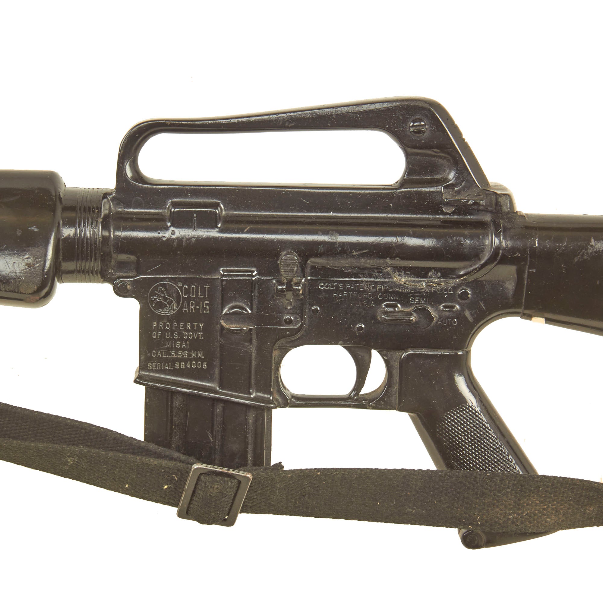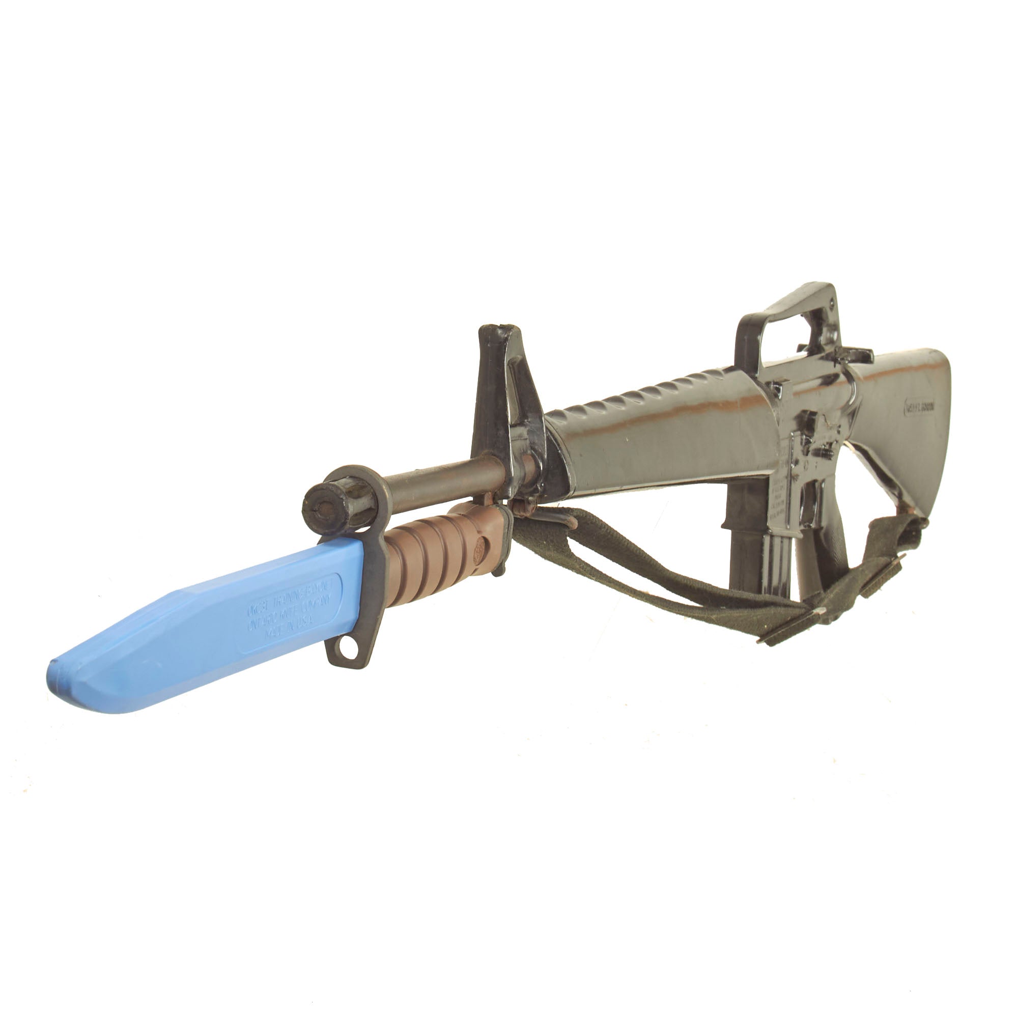 The military calls these rifles Rubber Ducks. This is an actual military issue trainer designed to be the correct weight and size of an M16A1. They are made from decommissioned M16/A1/A2 parts, which were then used during the molding process. Markings on these varied, and many had markings removed or changed while in service. This example is marked on the magazine well: