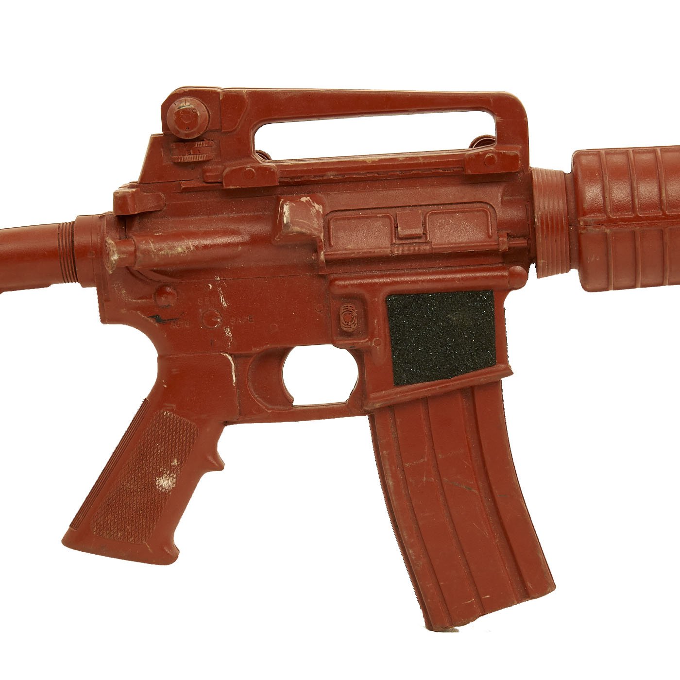 The military calls these rifles Rubber Ducks. This is an actual military or police issue trainer designed to be the correct weight and size of an M4. The red color was most likely used so that it could not be confused with the real thing. These usually have markings like the original, but they were not used in the mold for this item, except for the safety selector markings. There is a number 15 scratched into the back of the shoulder stock, probably an inventory number.