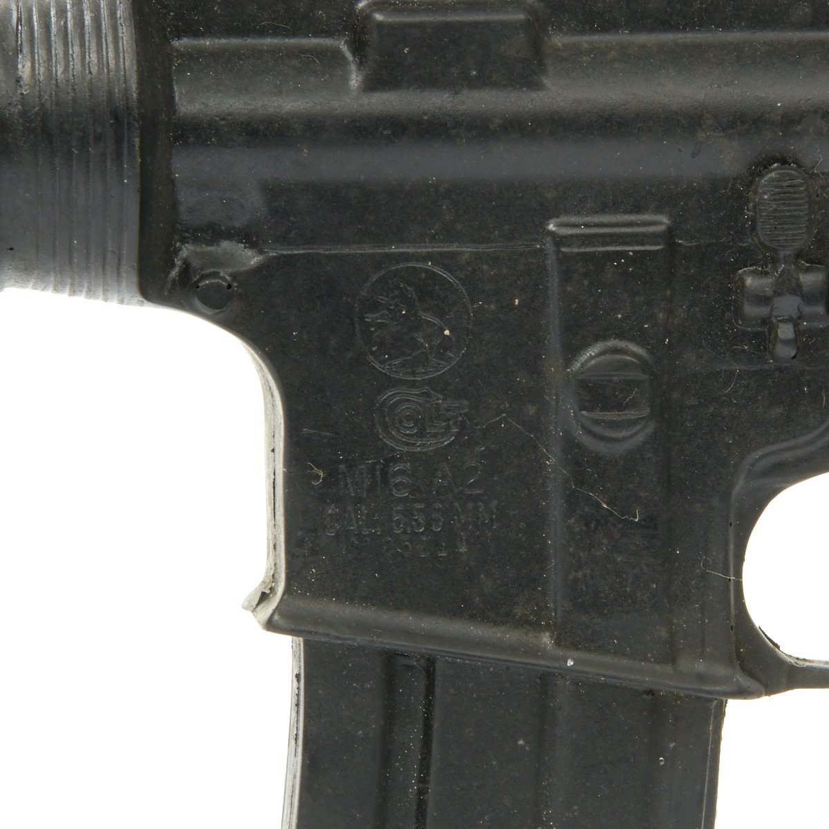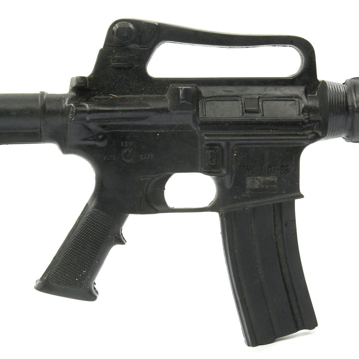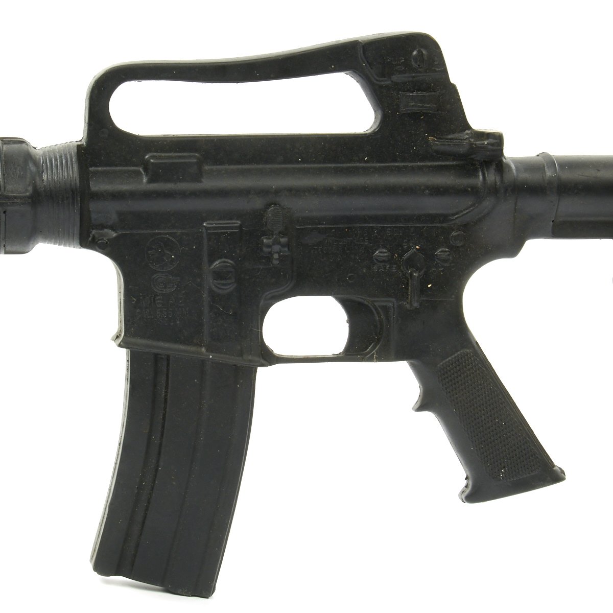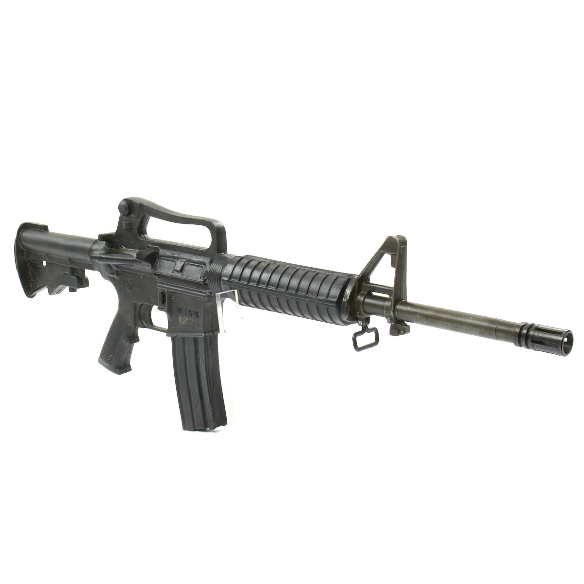 The military calls these rifles Rubber Ducks. This is an actual military issue trainer designed to be the correct weight and size of an M16A2. They are made from decommissioned M16/A1/A2 parts, which were then used during the molding process. Markings on these varied, and many had markings removed or changed while in service. This example is marked on the magazine well: