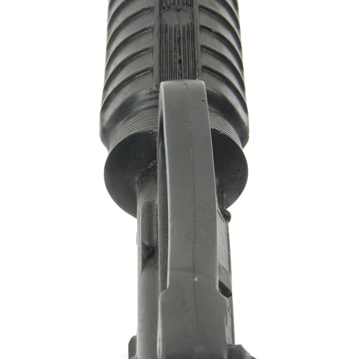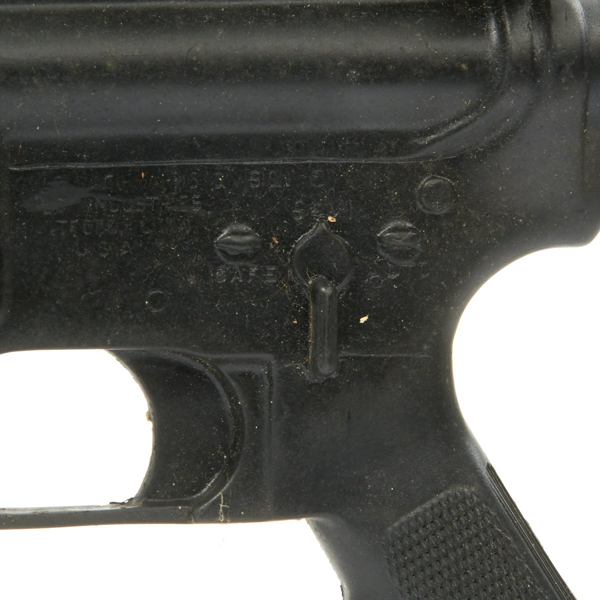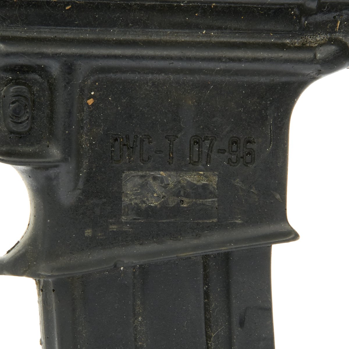 The military calls these rifles Rubber Ducks. This is an actual military issue trainer designed to be the correct weight and size of an M16A2. They are made from decommissioned M16/A1/A2 parts, which were then used during the molding process. Markings on these varied, and many had markings removed or changed while in service. This example is marked on the magazine well:
