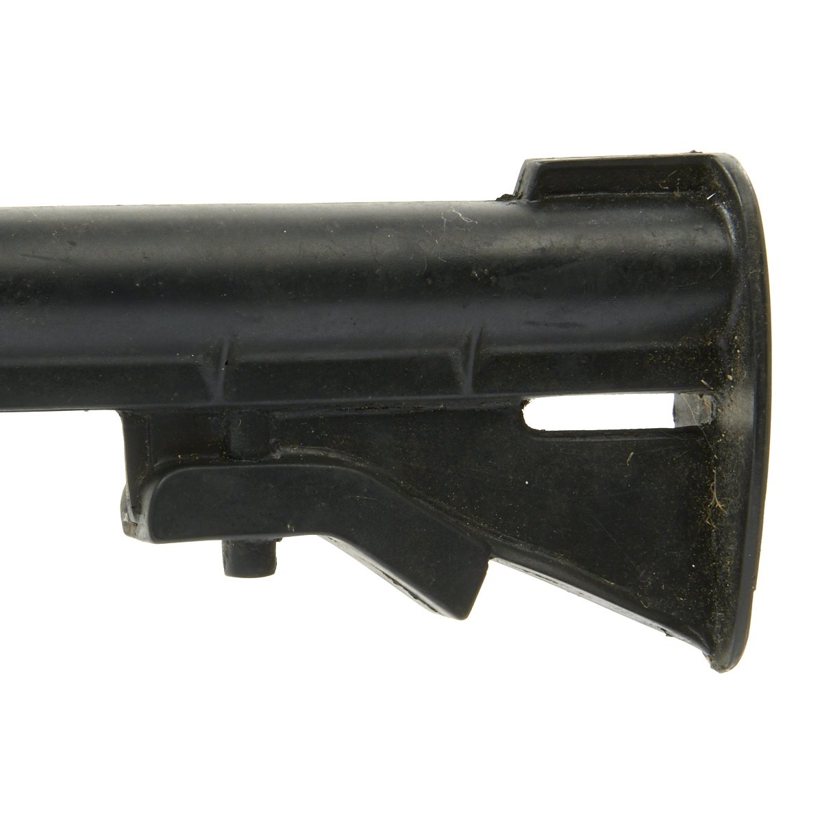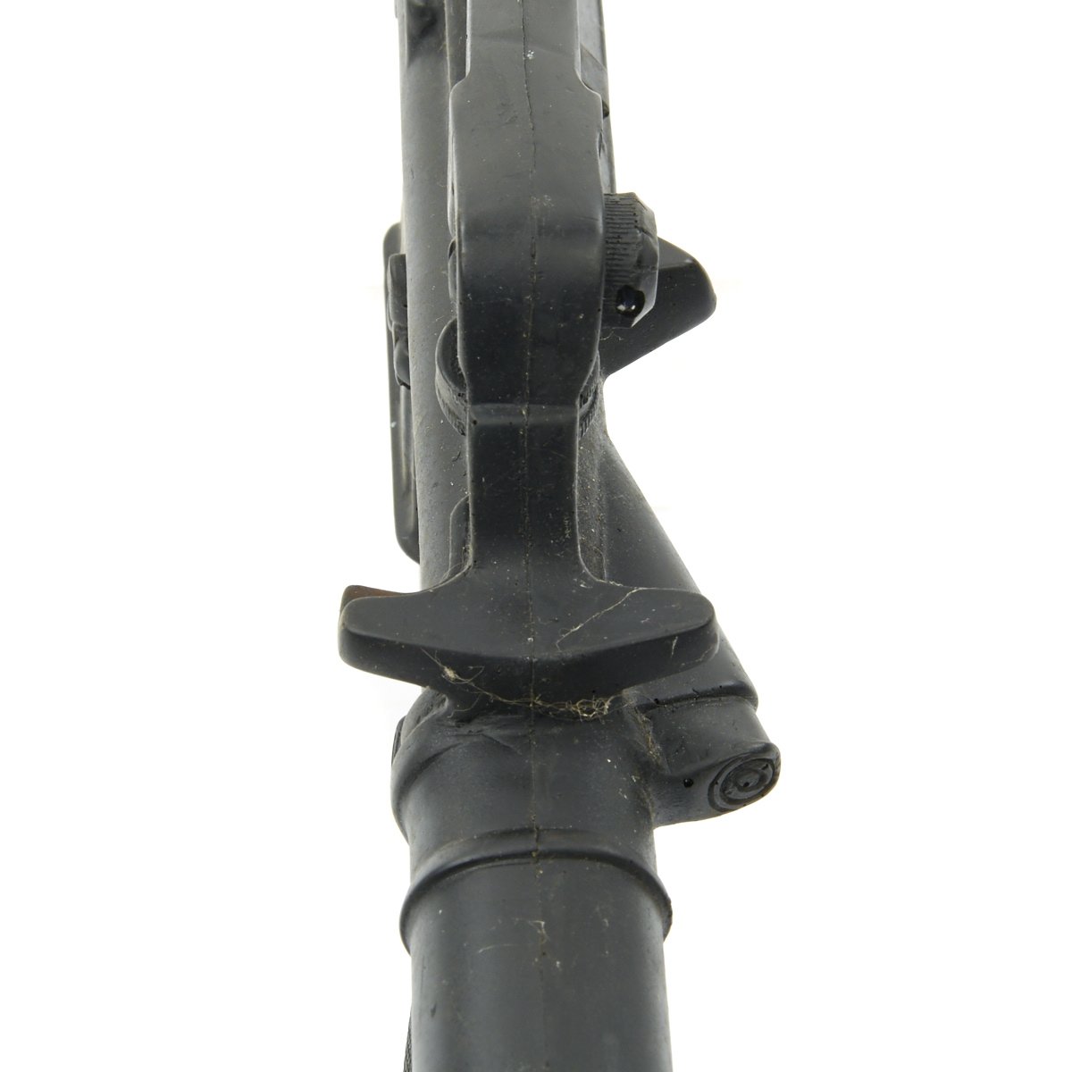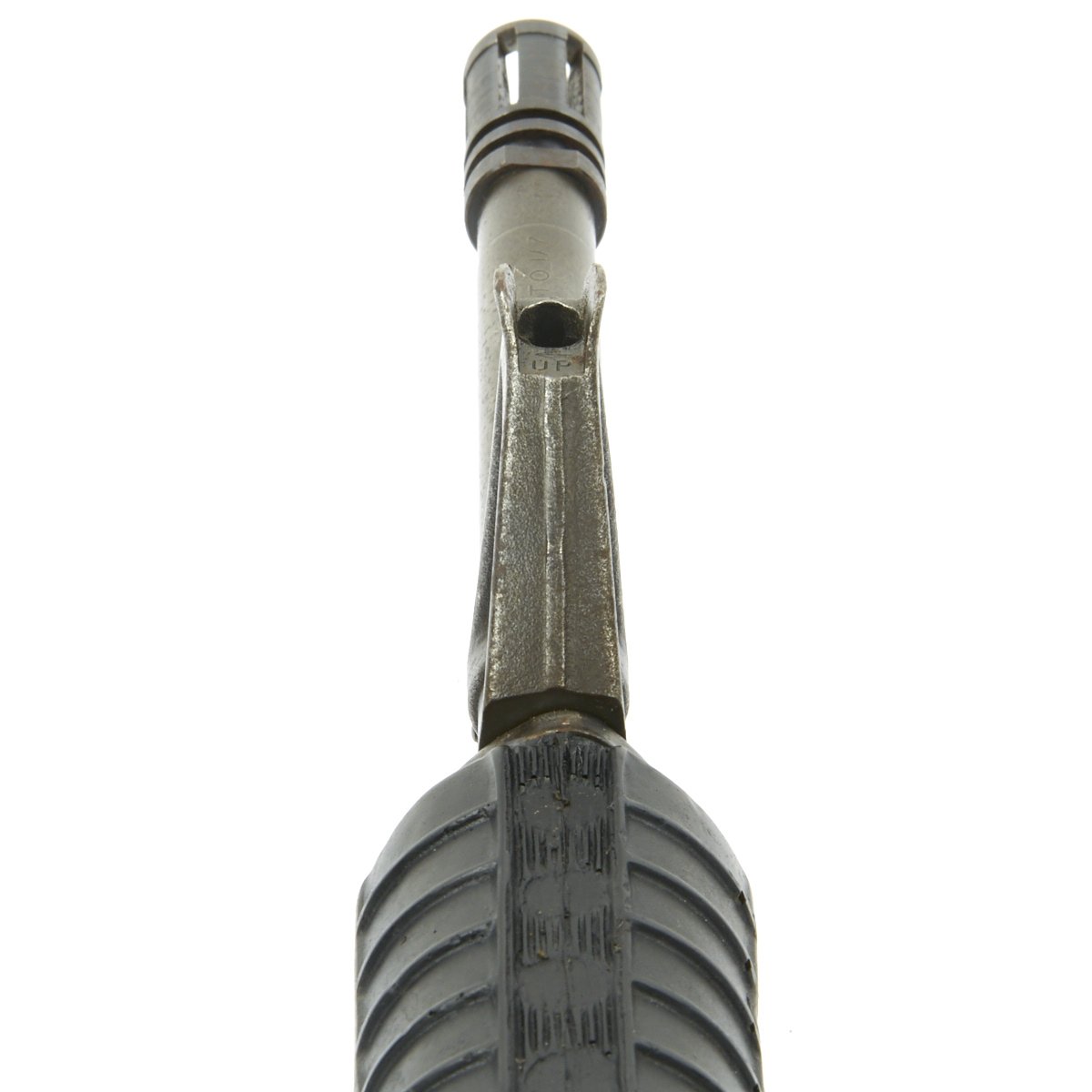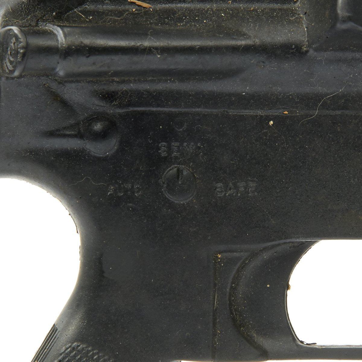 The military calls these rifles Rubber Ducks. This is an actual military issue trainer designed to be the correct weight and size of an M16A2. They are made from decommissioned M16/A1/A2 parts, which were then used during the molding process. Markings on these varied, and many had markings removed or changed while in service. This example is marked on the magazine well: