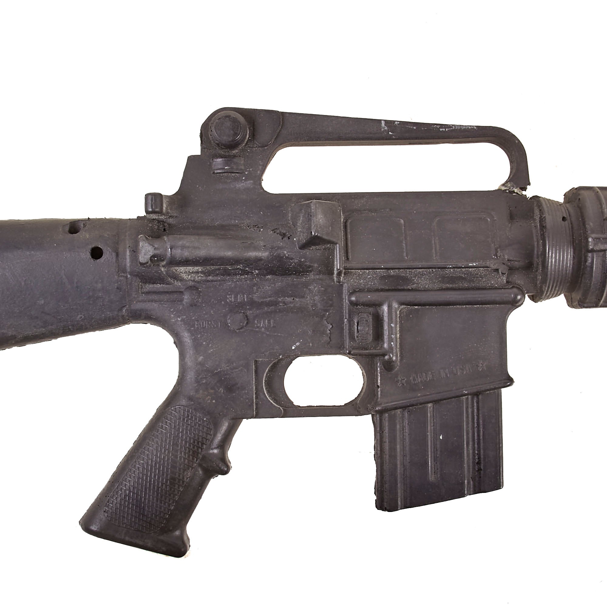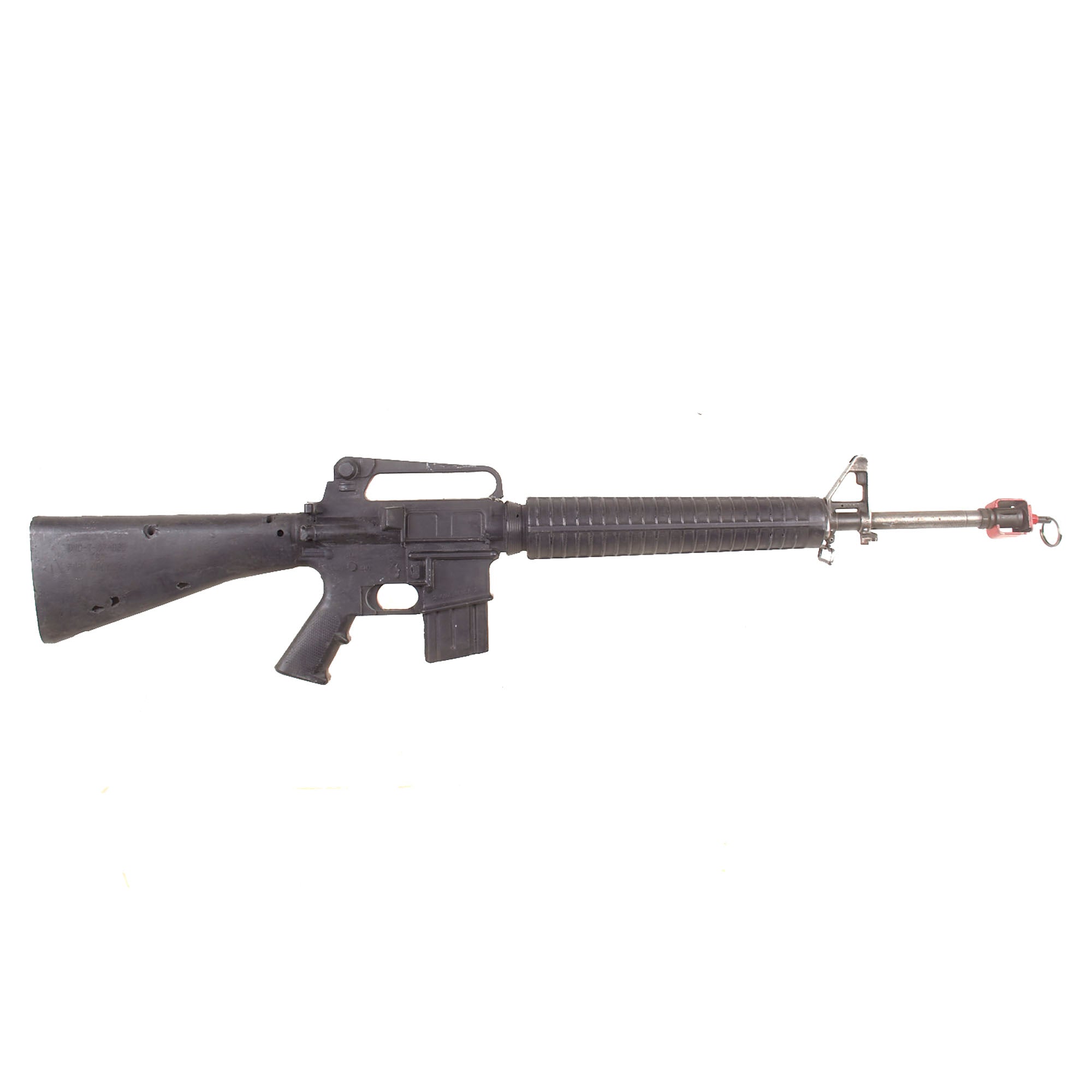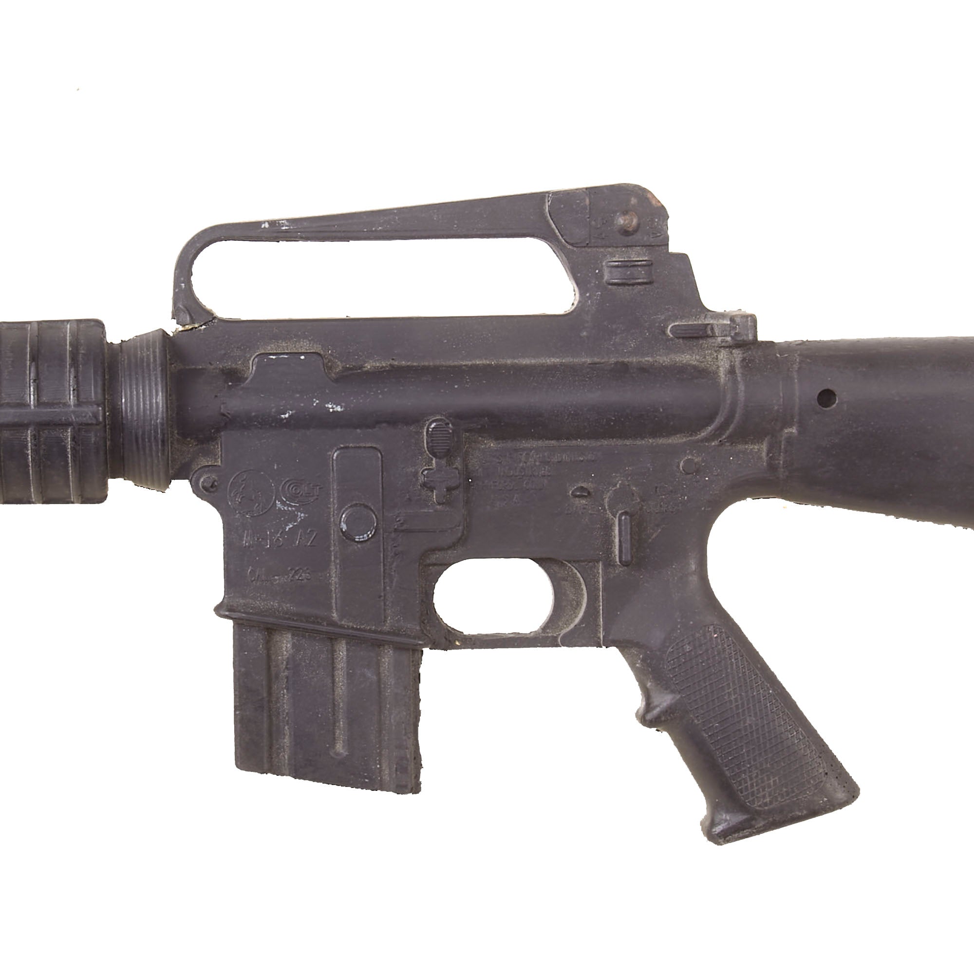 The military calls these rifles Rubber Ducks. This is an actual military issue trainer designed to be the correct weight and size of an M16A2. They are made from decommissioned M16/A1/A2 parts, which were then used during the molding process. Markings on these varied, and many had markings removed or changed while in service. This example is marked on the magazine well:
