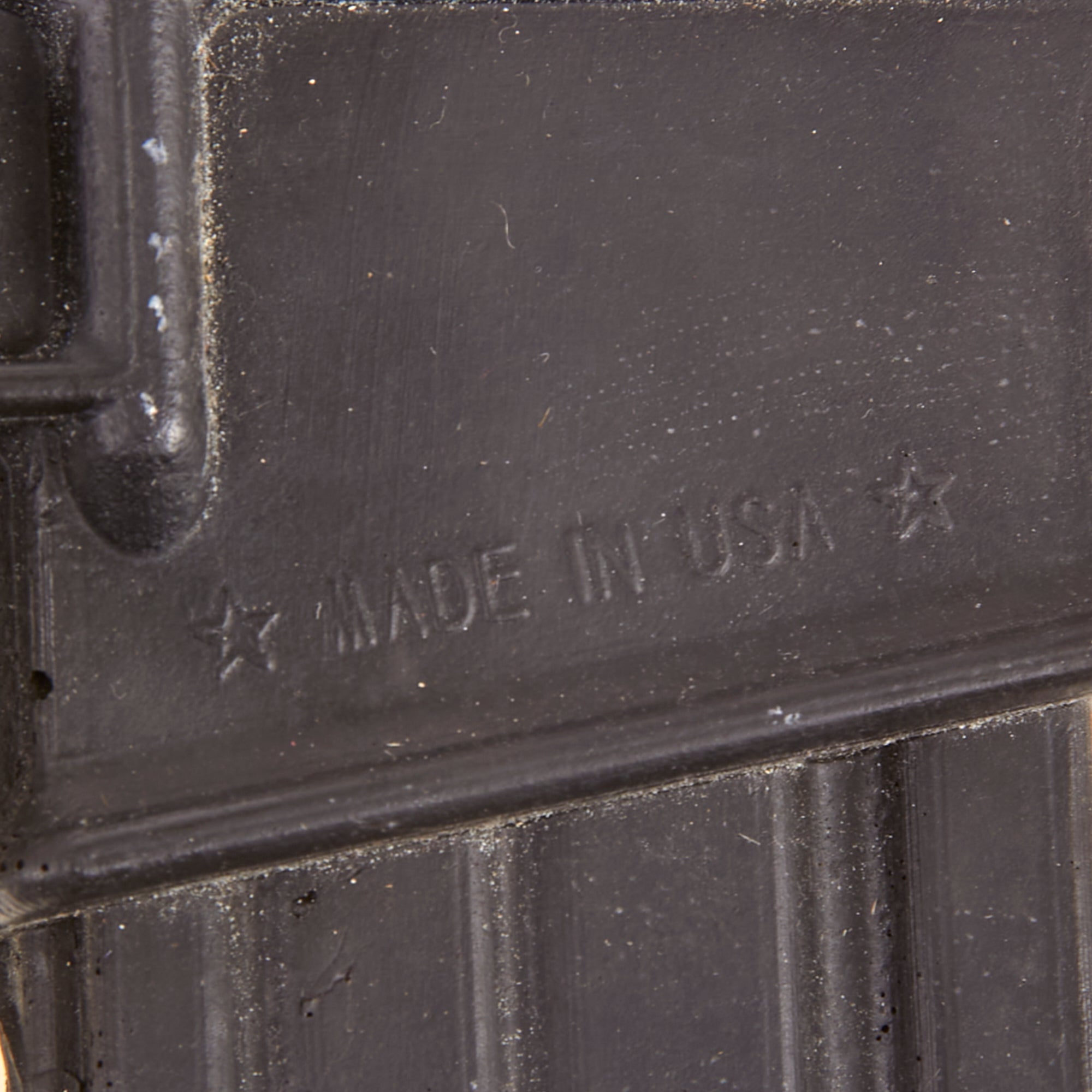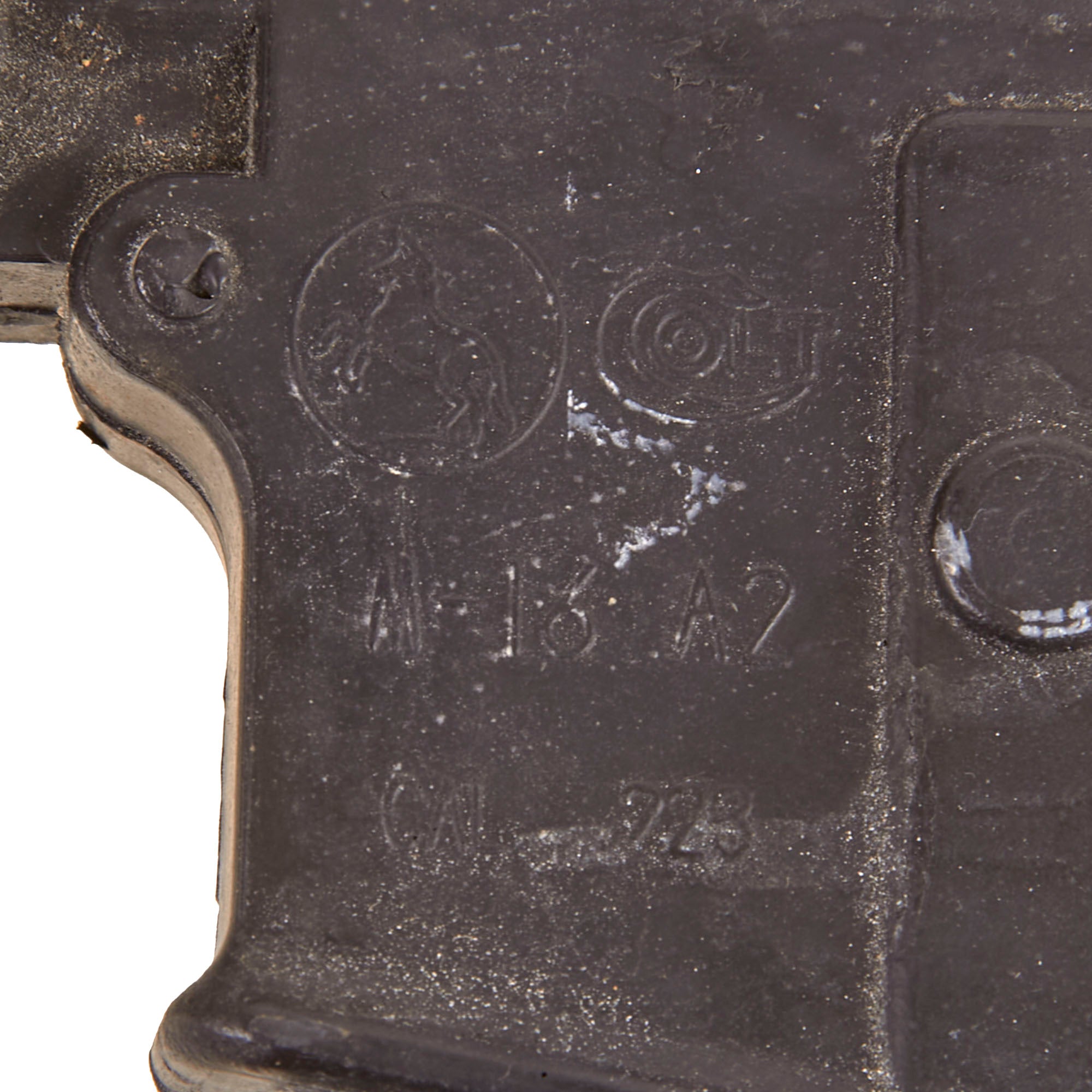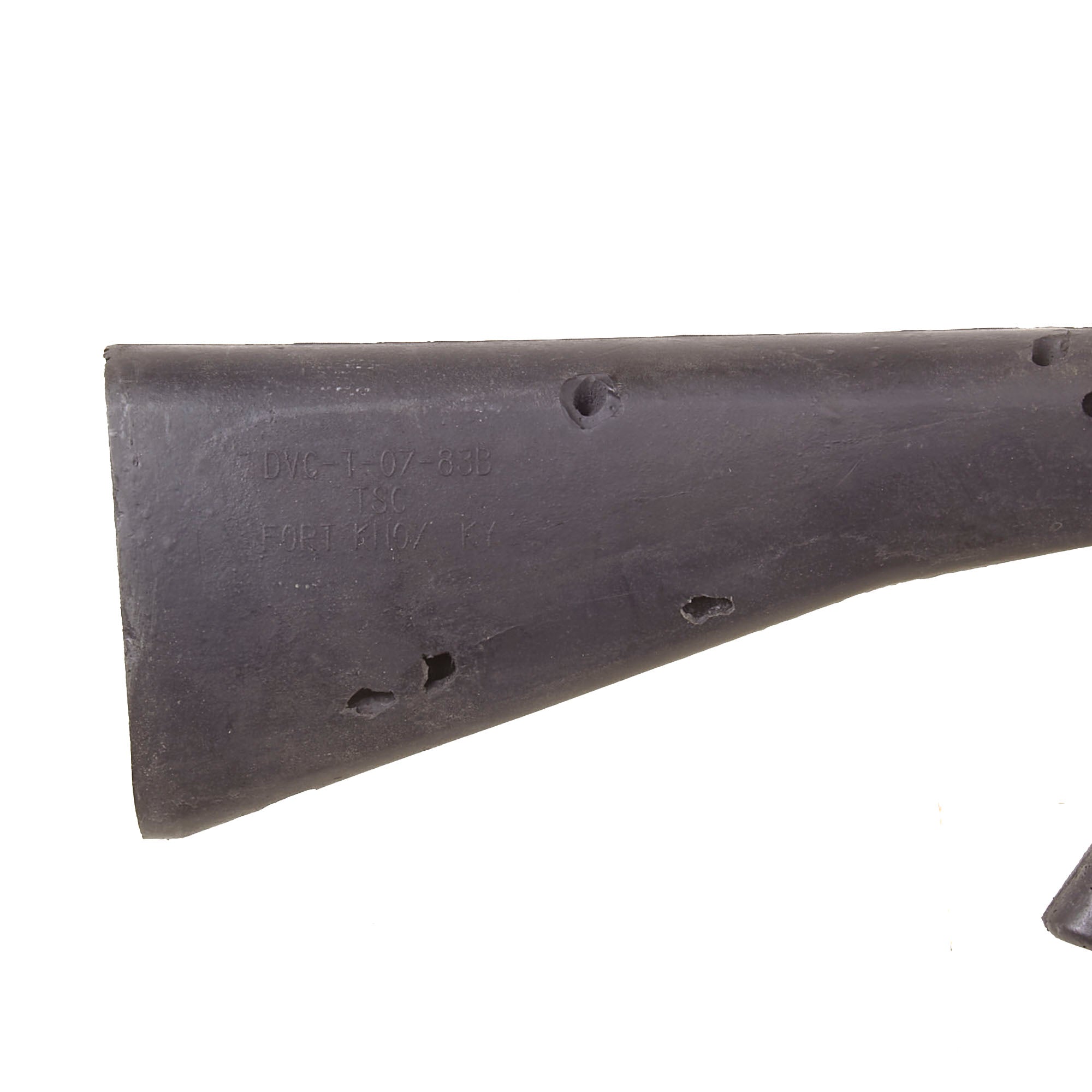 The military calls these rifles Rubber Ducks. This is an actual military issue trainer designed to be the correct weight and size of an M16A2. They are made from decommissioned M16/A1/A2 parts, which were then used during the molding process. Markings on these varied, and many had markings removed or changed while in service. This example is marked on the magazine well: