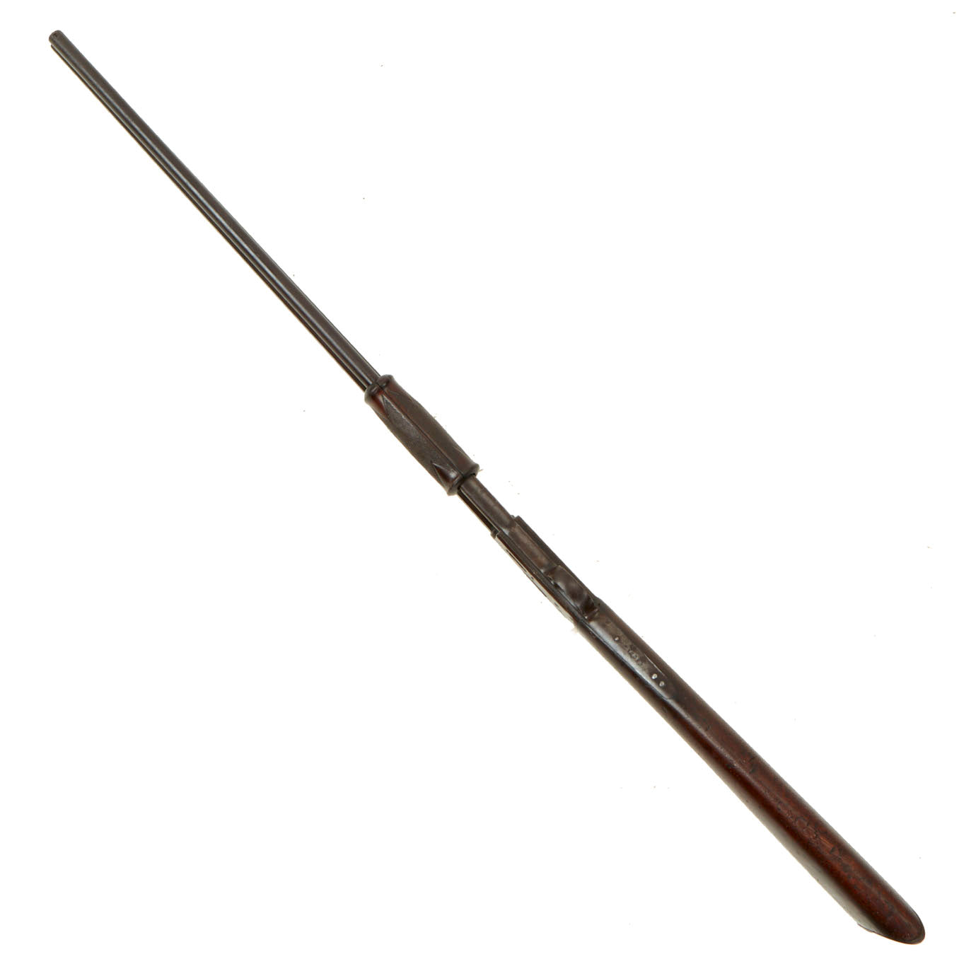 Stocks are in very good condition, with a great patina and the reddish-brown color of aged oiled walnut. Offered with a crisp tight action in fully functional condition. Metal work is good, showing no signs of major restoration, showing a lovely antique patina. The barrel markings are fully legible. The bore is partly bright with clear lands and grooves, with light wear and oxidation. We often see these close to shot out, so still having clear rifling is a rarity.
