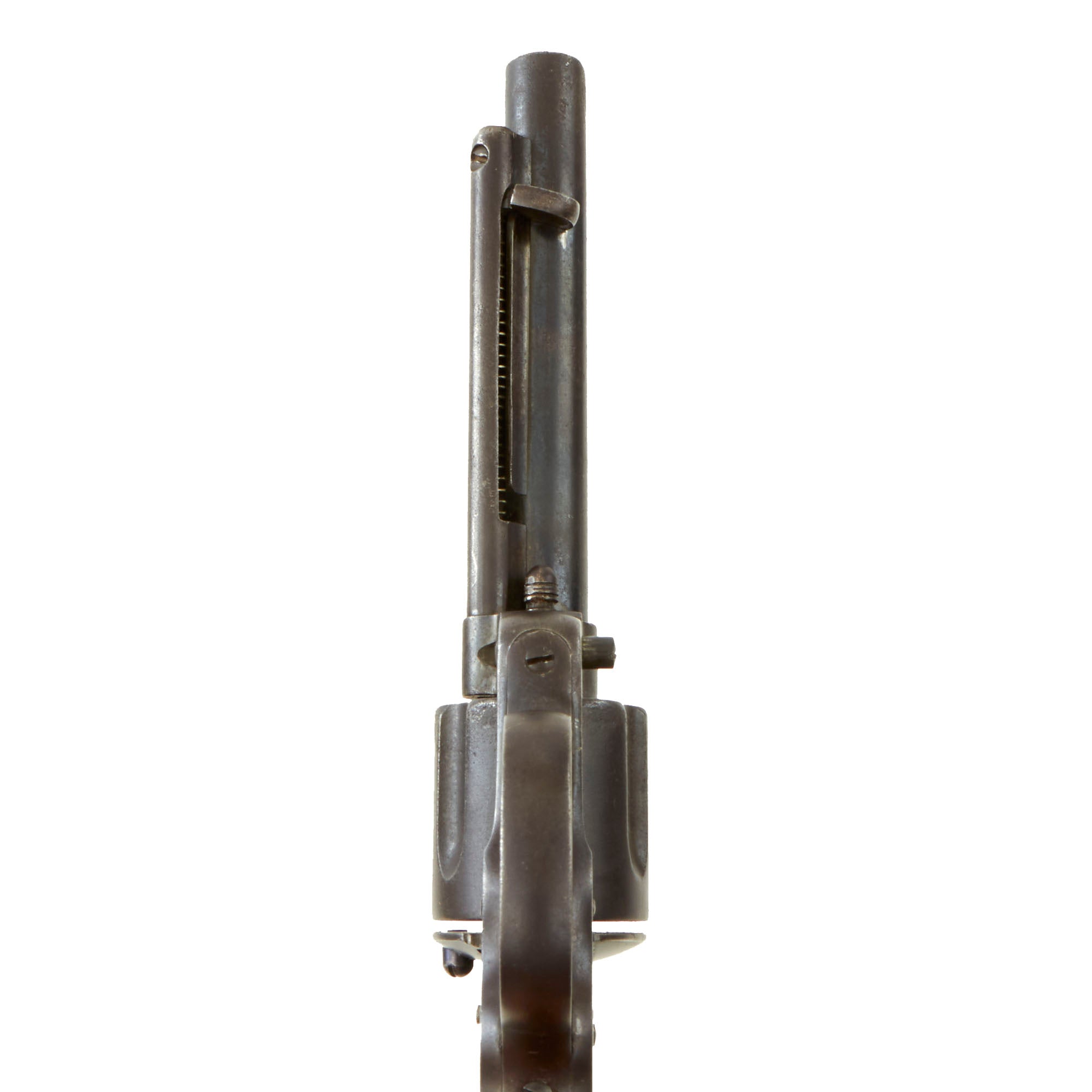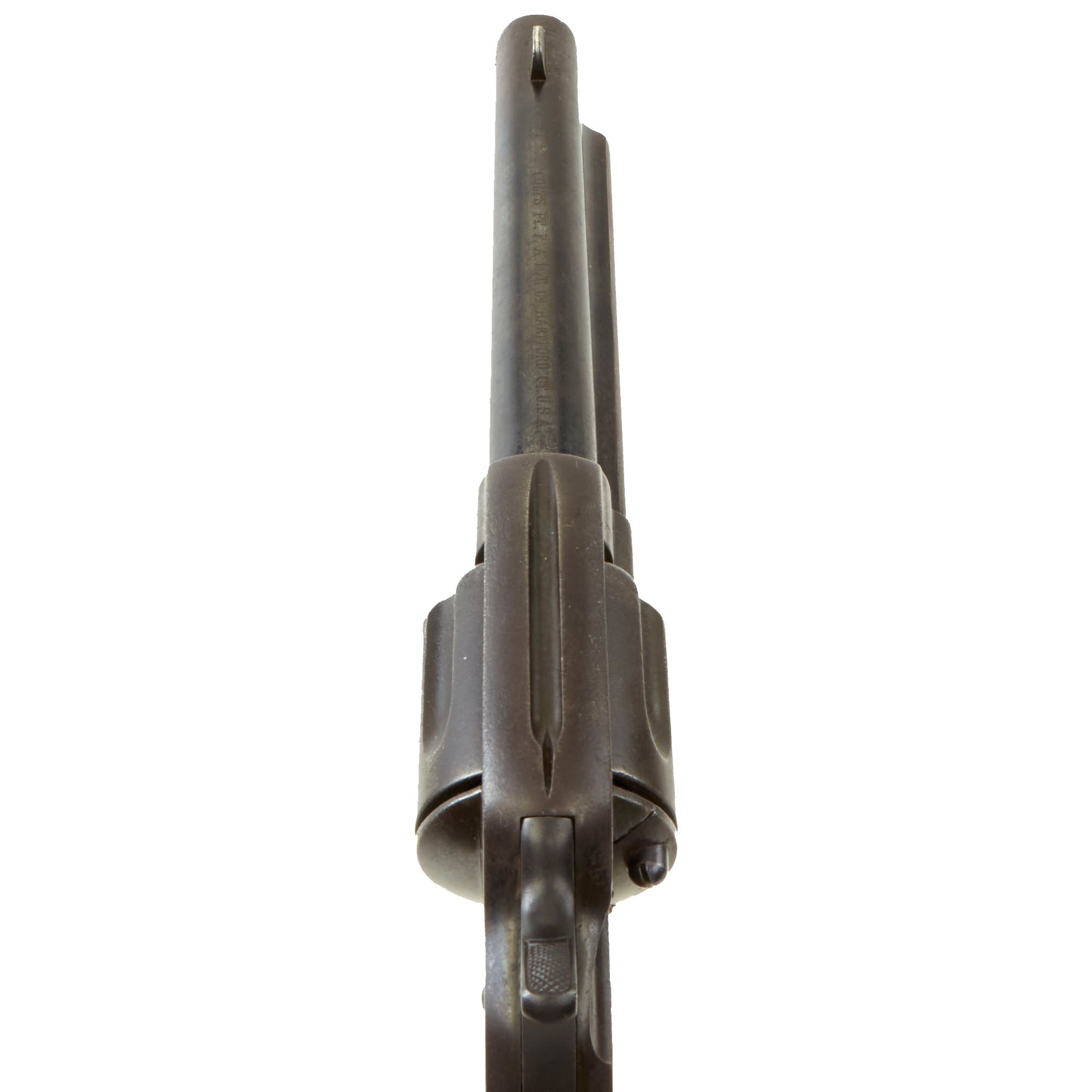 Overall condition is very good, with most markings well retained, and a great lightly worn look. The bore is in very good condition, with a mostly bright finish and clear lands and grooves. There is some light fouling and oxidation, as to be expected on a black powder cartridge revolver, and there also is a bit of wear. We tested the functionality in both double and single action, and it cycles well, though the ratchet is a bit worn so there is definitely some wobble, even when at full cock. We did not notice any trouble with the indexing or cylinder lockup. The ejector is present and fully functional.
