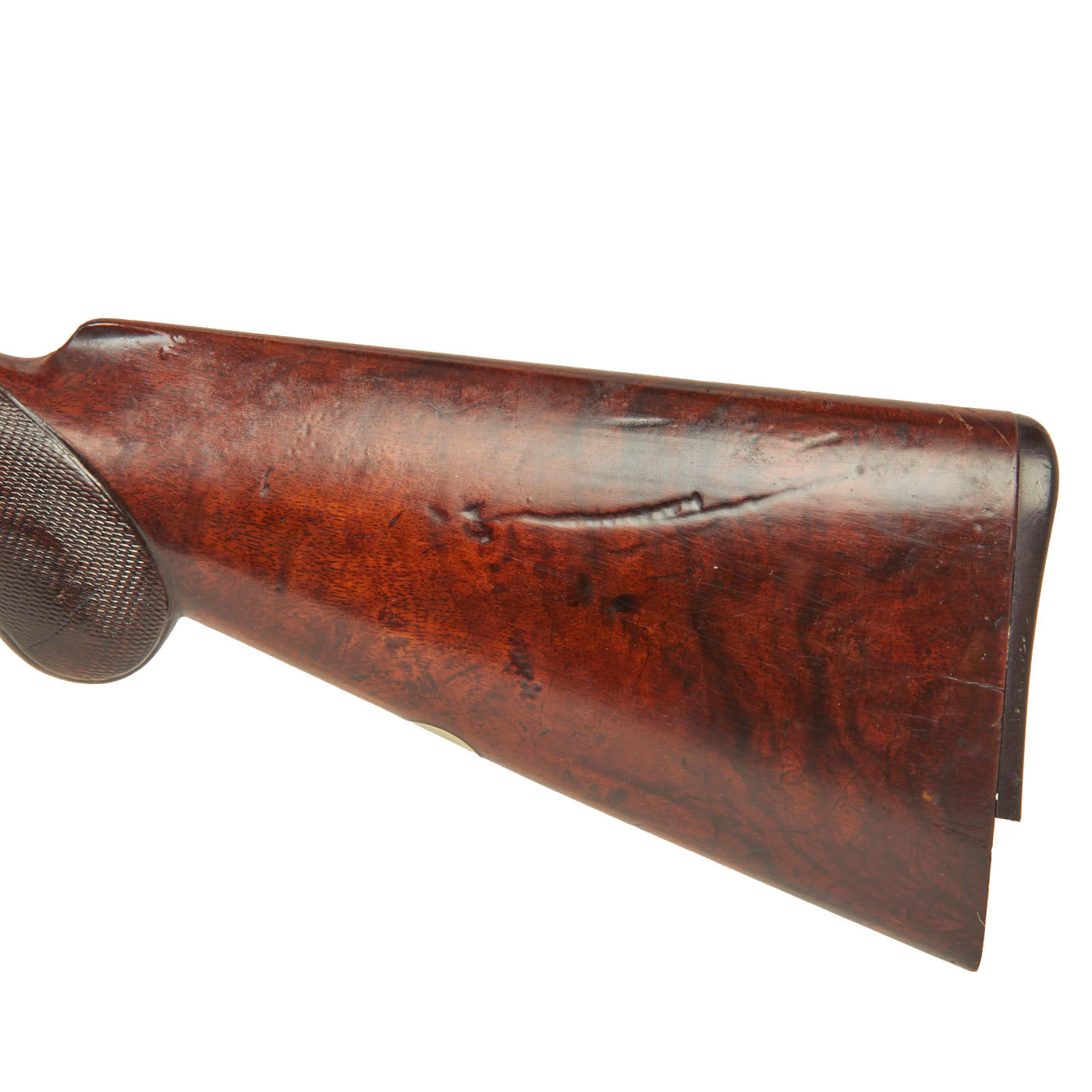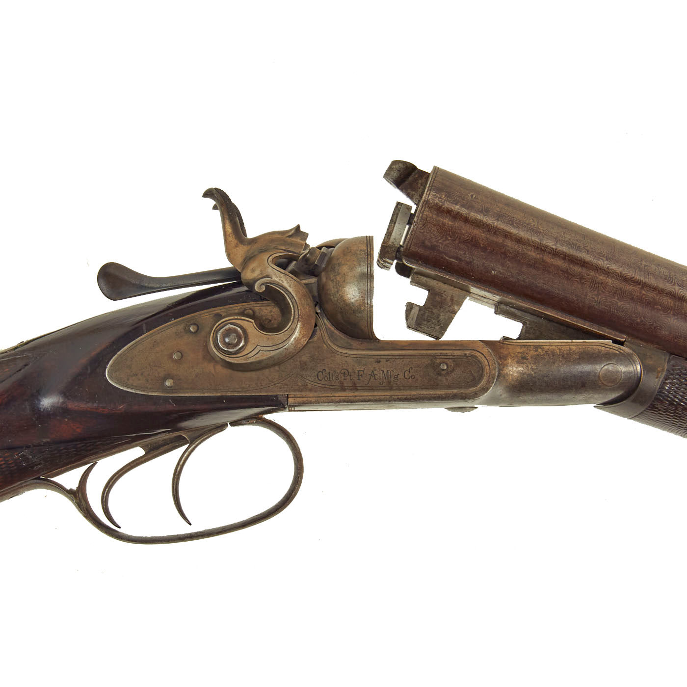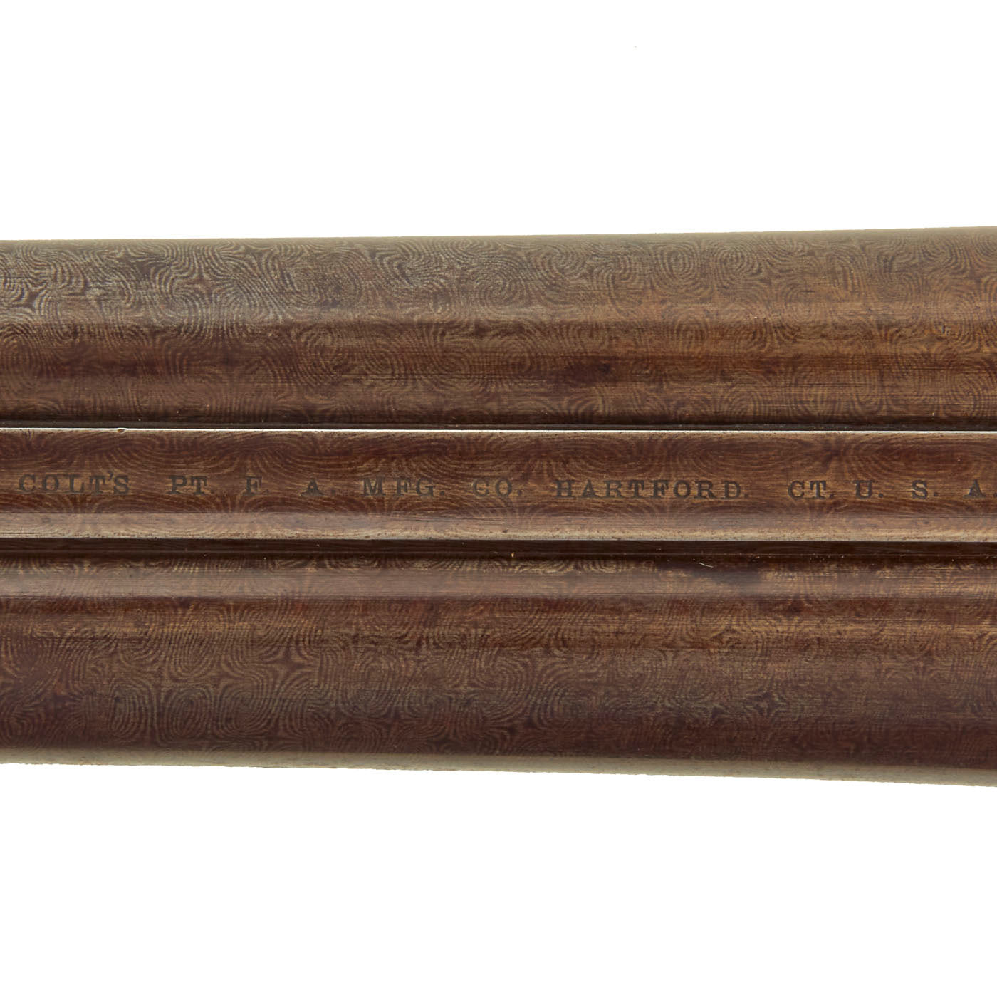 Original Item: Only One Available. We just received this lovely example out of an antique firearms auction. This is a very nice example of the Colt Model 1878 Hammer Shotgun, with lovely 32 inch long Damascus laminated steel barrels. The serial number 18445 is stamped on the bottom of the barrel assembly, the top of the action in the hinge joint, the rear of the trigger guard, and on the metal fitting of the fore stock, indicating production in 1884, close to the end of this models production life. It is in the larger 10 gauge chambering, and looks to have seen light use, with the bores rating about 8-9 out of 10. They show just a bit of overall oxidation and wear.