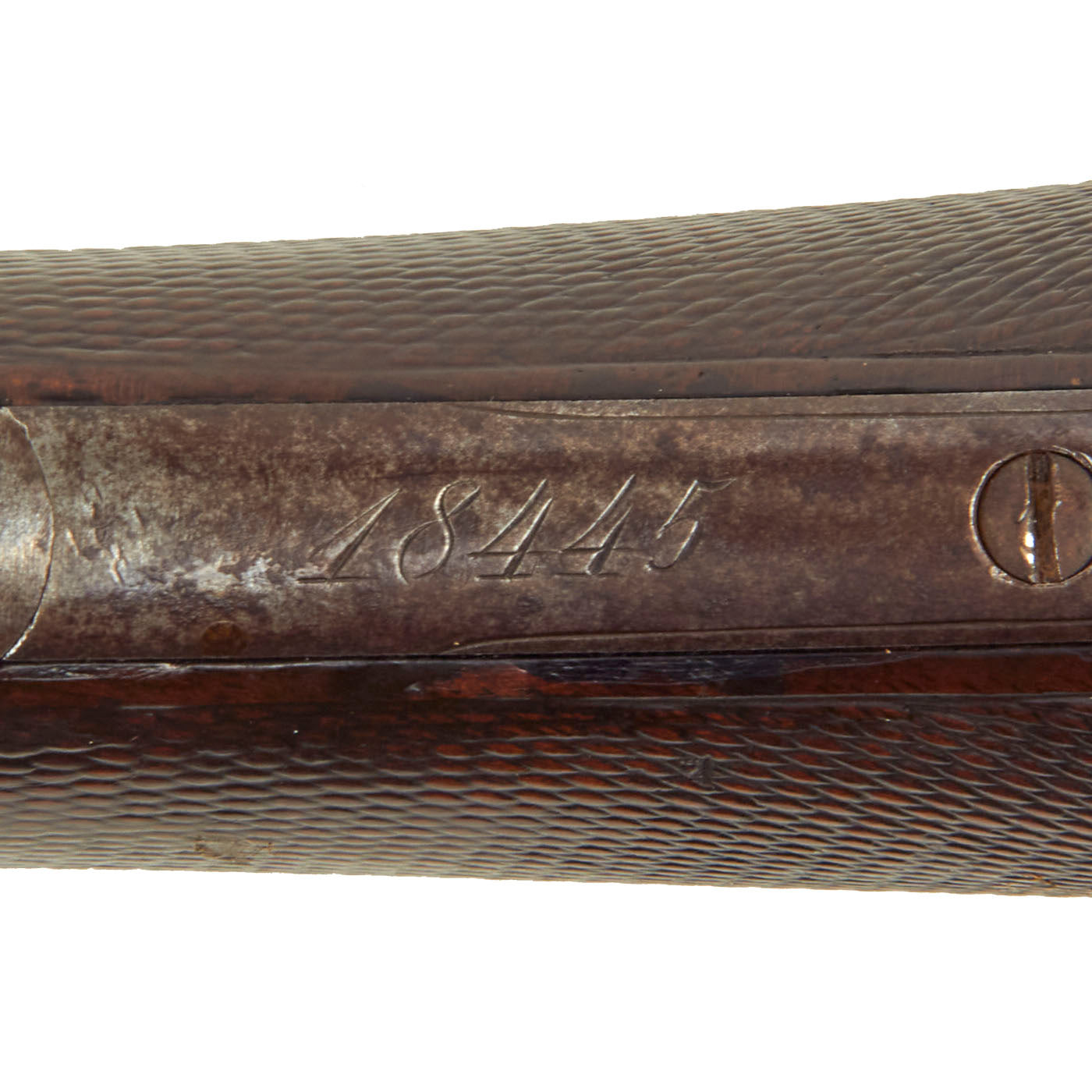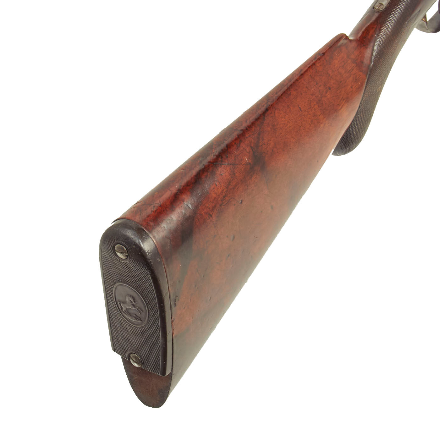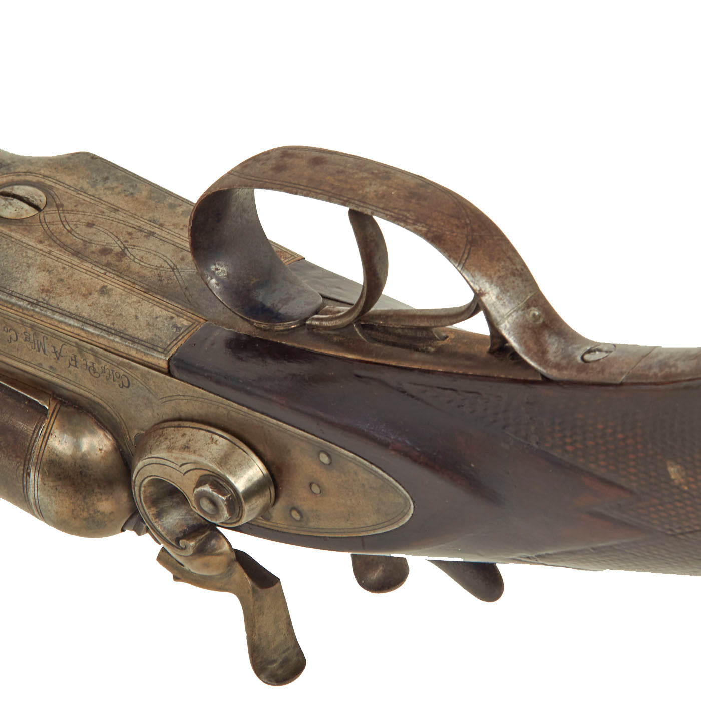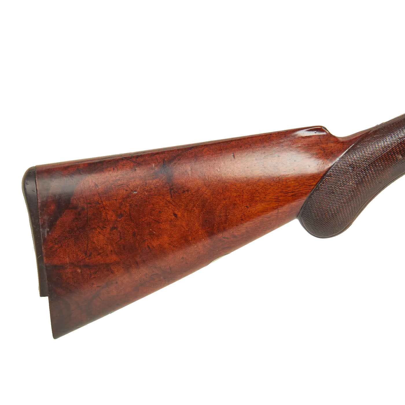 Original Item: Only One Available. We just received this lovely example out of an antique firearms auction. This is a very nice example of the Colt Model 1878 Hammer Shotgun, with lovely 32 inch long Damascus laminated steel barrels. The serial number 18445 is stamped on the bottom of the barrel assembly, the top of the action in the hinge joint, the rear of the trigger guard, and on the metal fitting of the fore stock, indicating production in 1884, close to the end of this models production life. It is in the larger 10 gauge chambering, and looks to have seen light use, with the bores rating about 8-9 out of 10. They show just a bit of overall oxidation and wear.