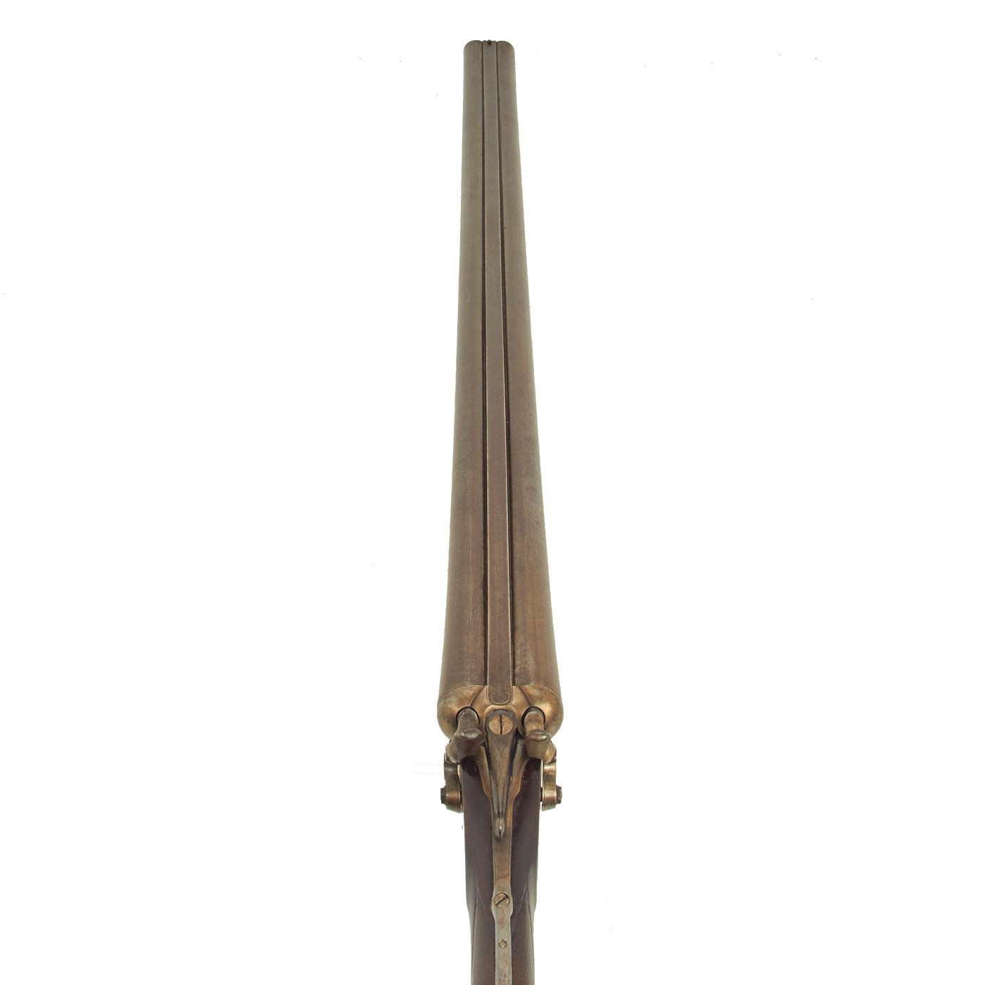 The bottom of the barrel has some additional markings, as well as 10, giving the gauge of the shotgun. The gun is in very good condition shape, and bores are clear, with some oxidation peppering. The standard top lever pushed to the side, opening the chambers for reloading. Removing the fore stock allows the barrels to be removed from the receiver.