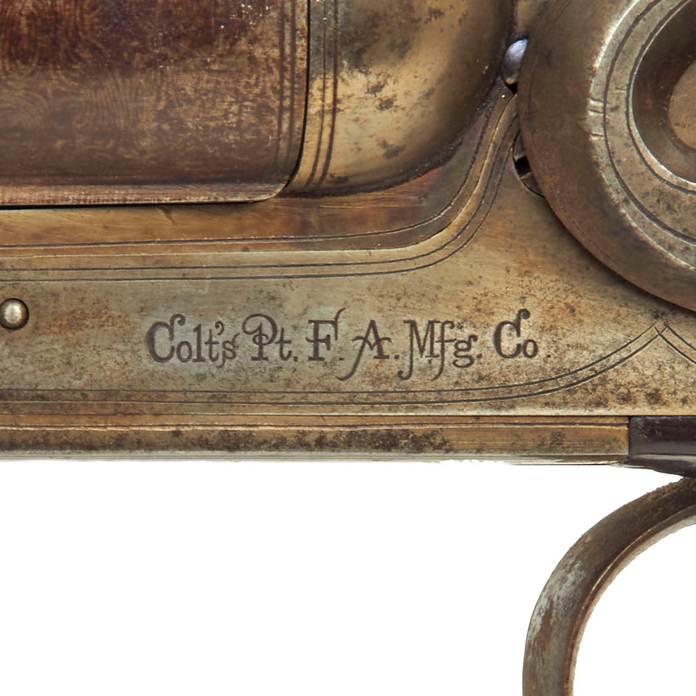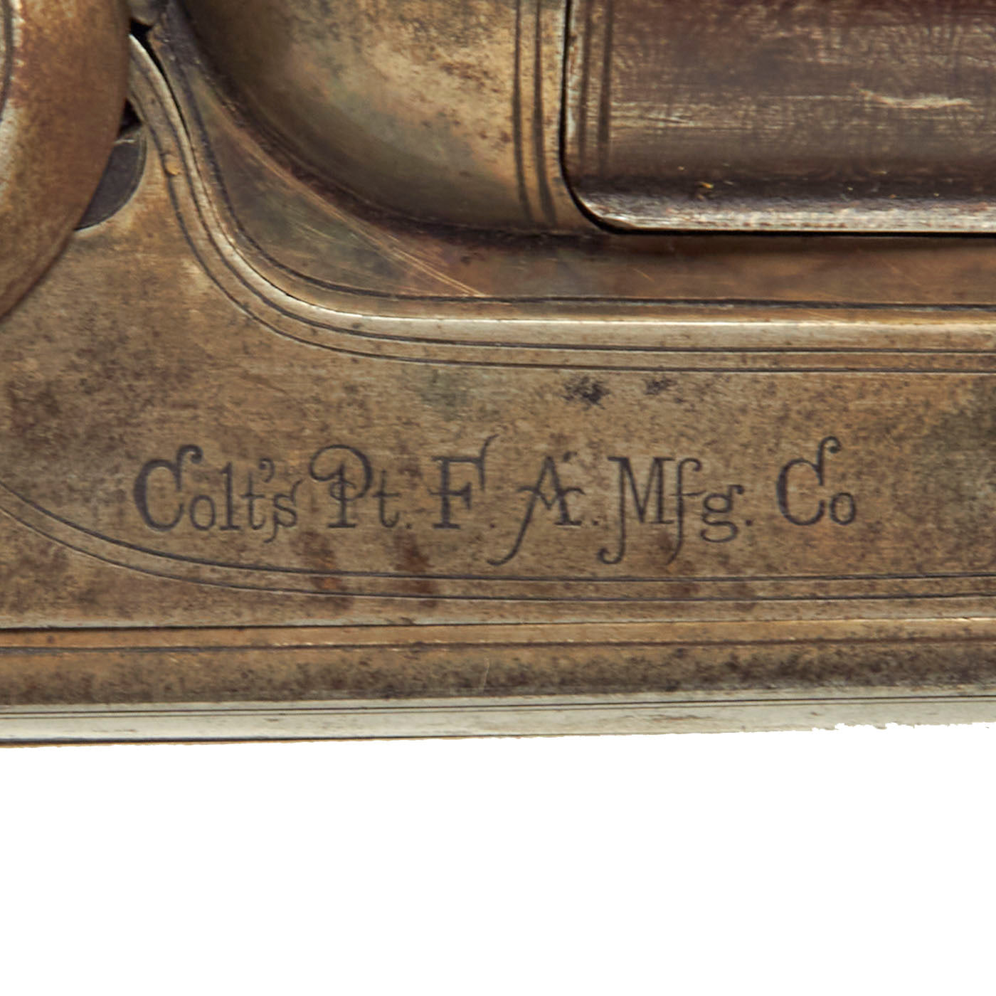Both lock plates are correctly marked Colt's Pt. F. A. Mfg. Co. in lovely ornamented print, and the top strap has the correct address marking: