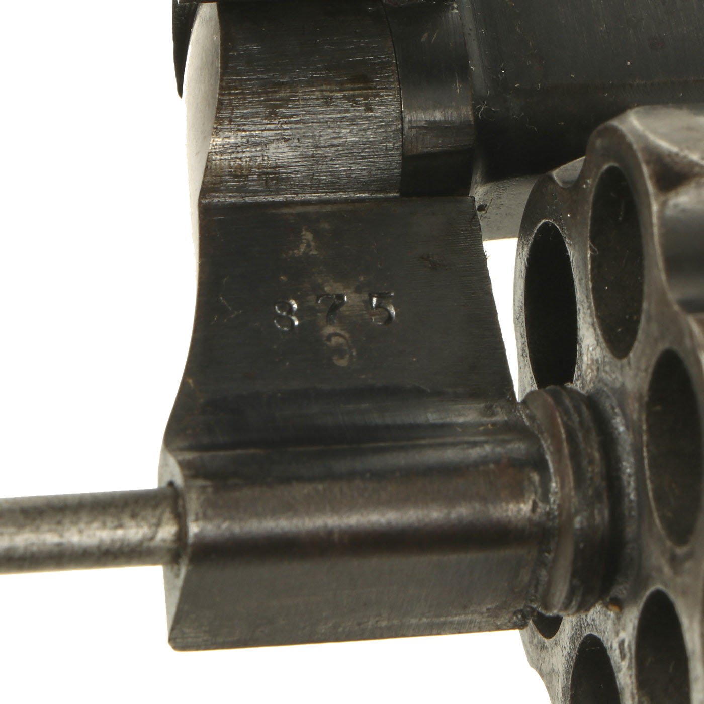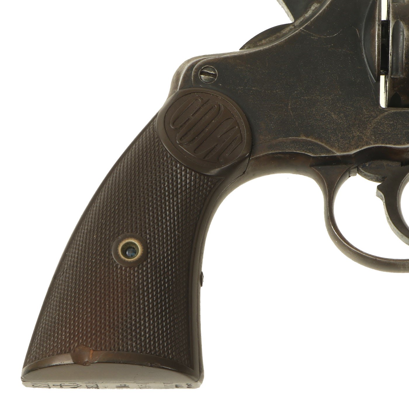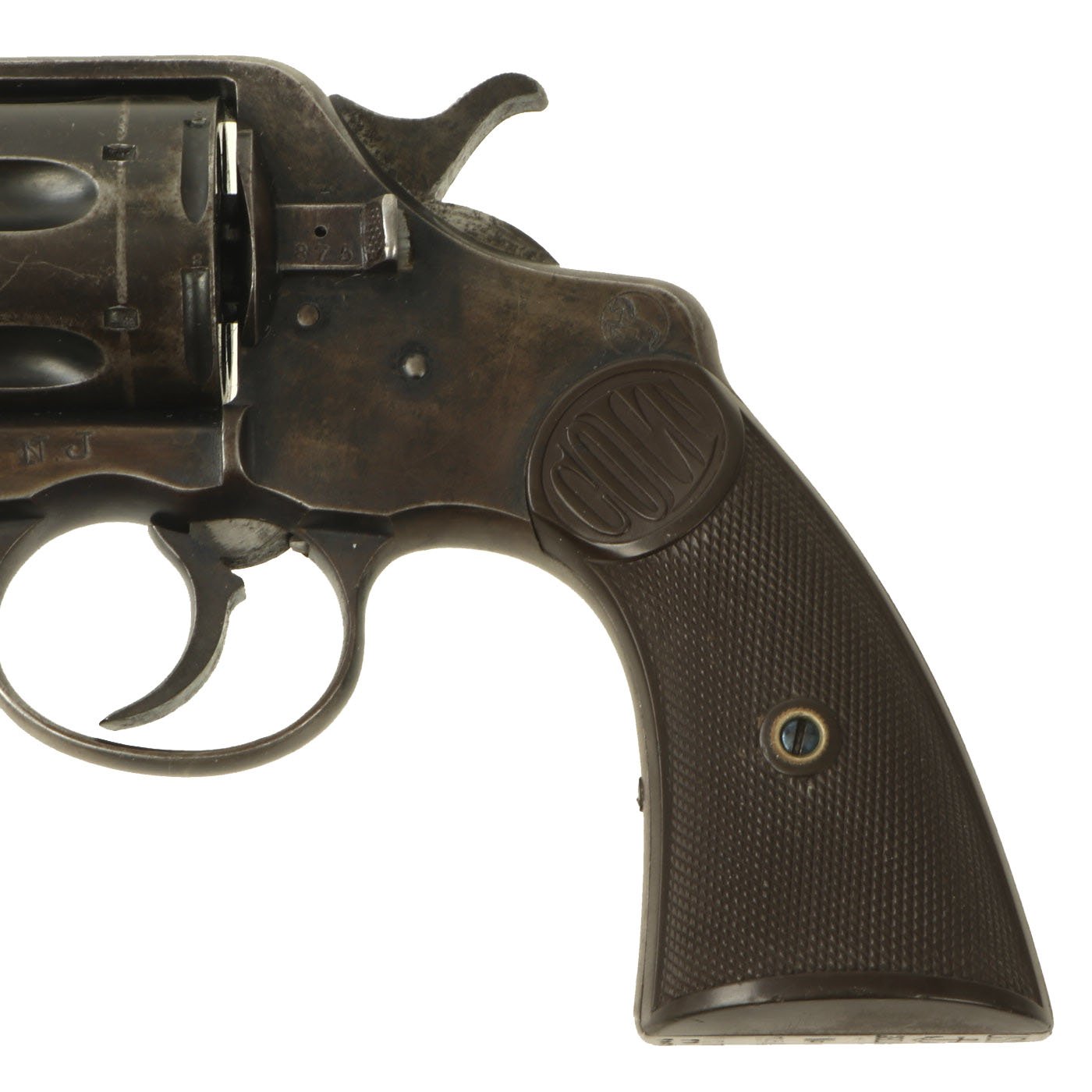 This is a nice "New Navy" issue example with military inspectors cartouches on the metal components, and a lovely set of COLT marked hard rubber grips, correct for a U.S. Navy Issued revolver. The serial number marked on the bottom of the grip is 70896, indicating production in 1896. The frame under the cylinder crane, the cylinder crane itself, the cylinder release, and the bottom of the barrel are all marked with assembly number 875. Only early production D.A. 38 revolvers had assembly numbers only on these parts, and later produced examples of this had the serial number, as it was found that the butt frame serial number wore off easily.