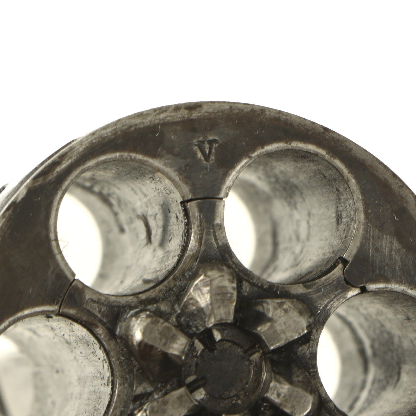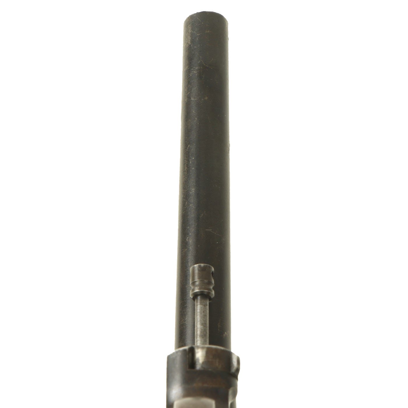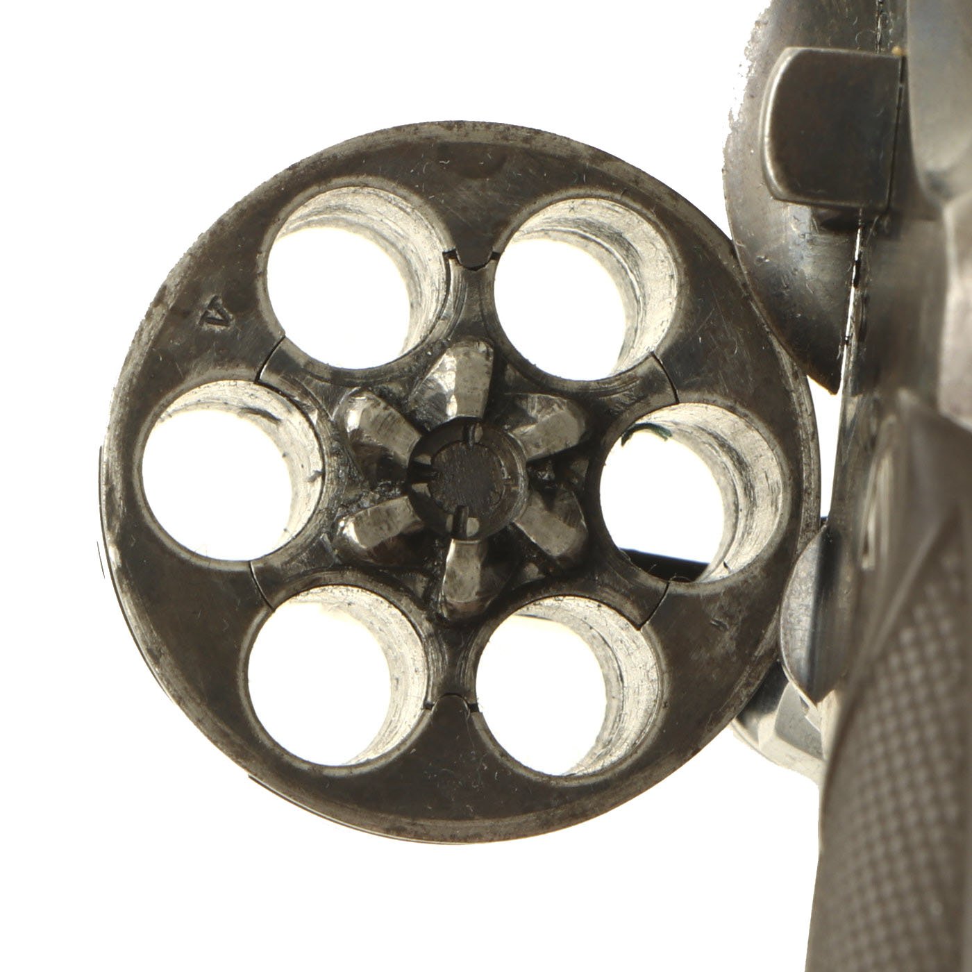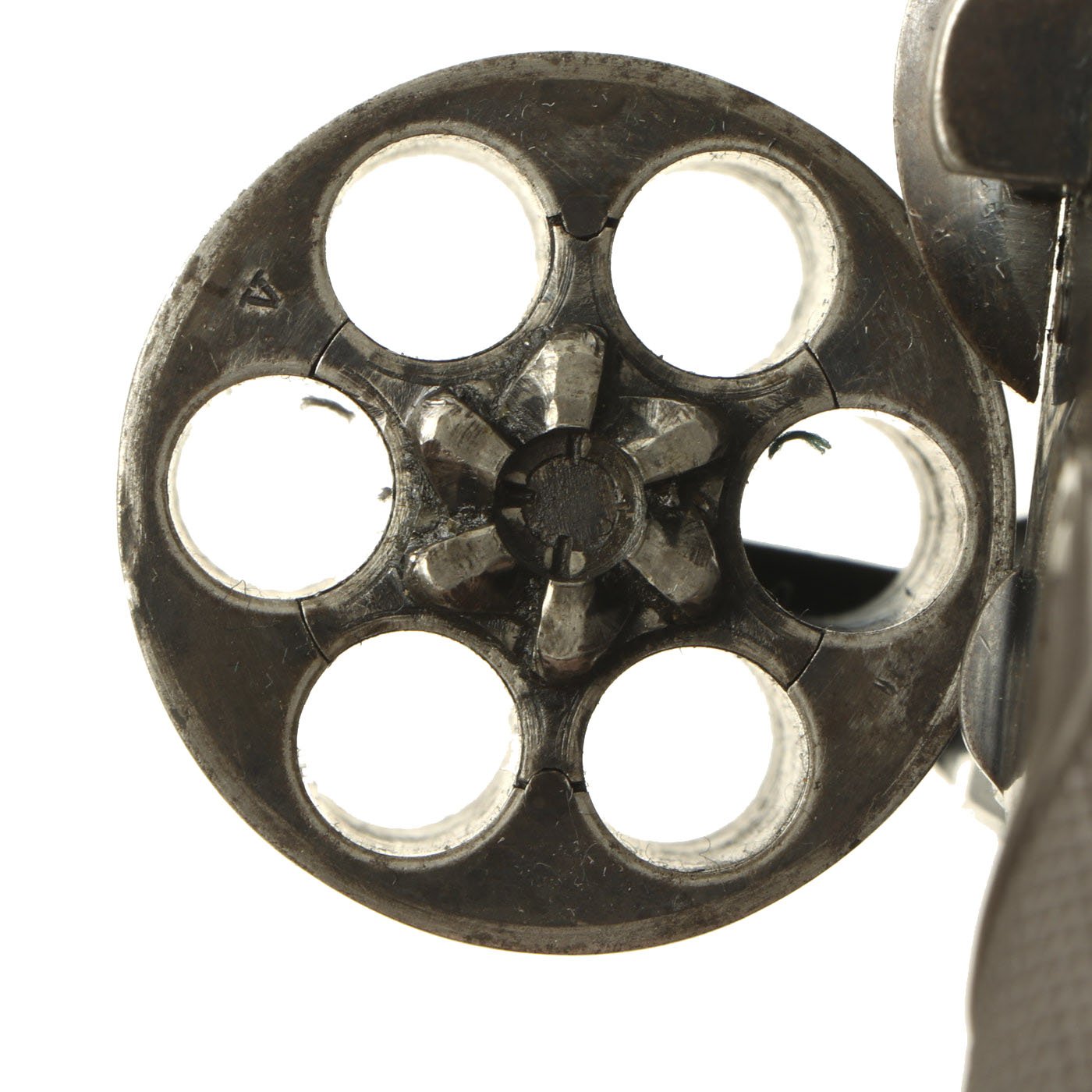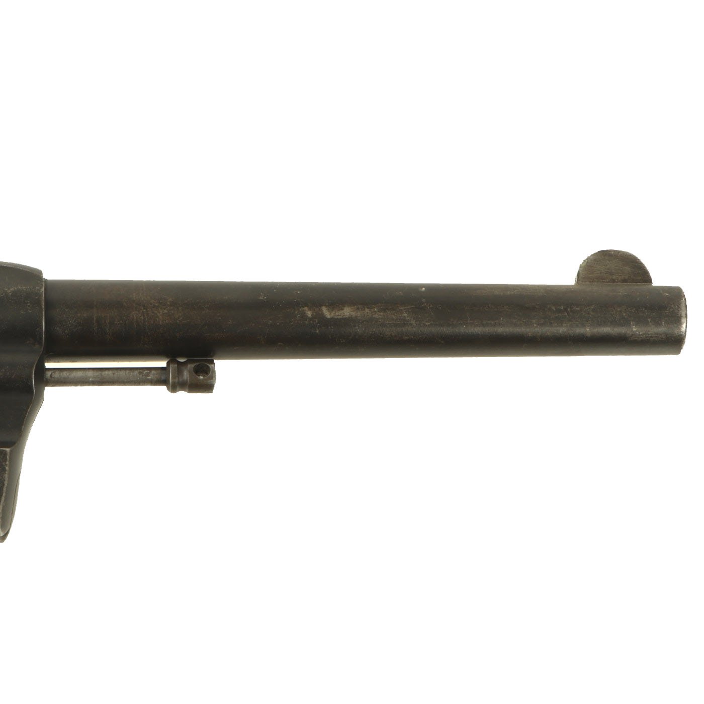 Condition of the revolver is very good, with a lot of the original finish present, and no signs of major rust or other damage. There are areas of wear as well as some scratches and dings, but nothing out of the ordinary for a 100 year old revolver. The bore is clean, and has clear lands and grooves, with just a bit of speckling and wear. The cylinder swings out to the left correctly, with a functional cartridge extractor. We did not notice any issues cycling the revolver in both single and double action.