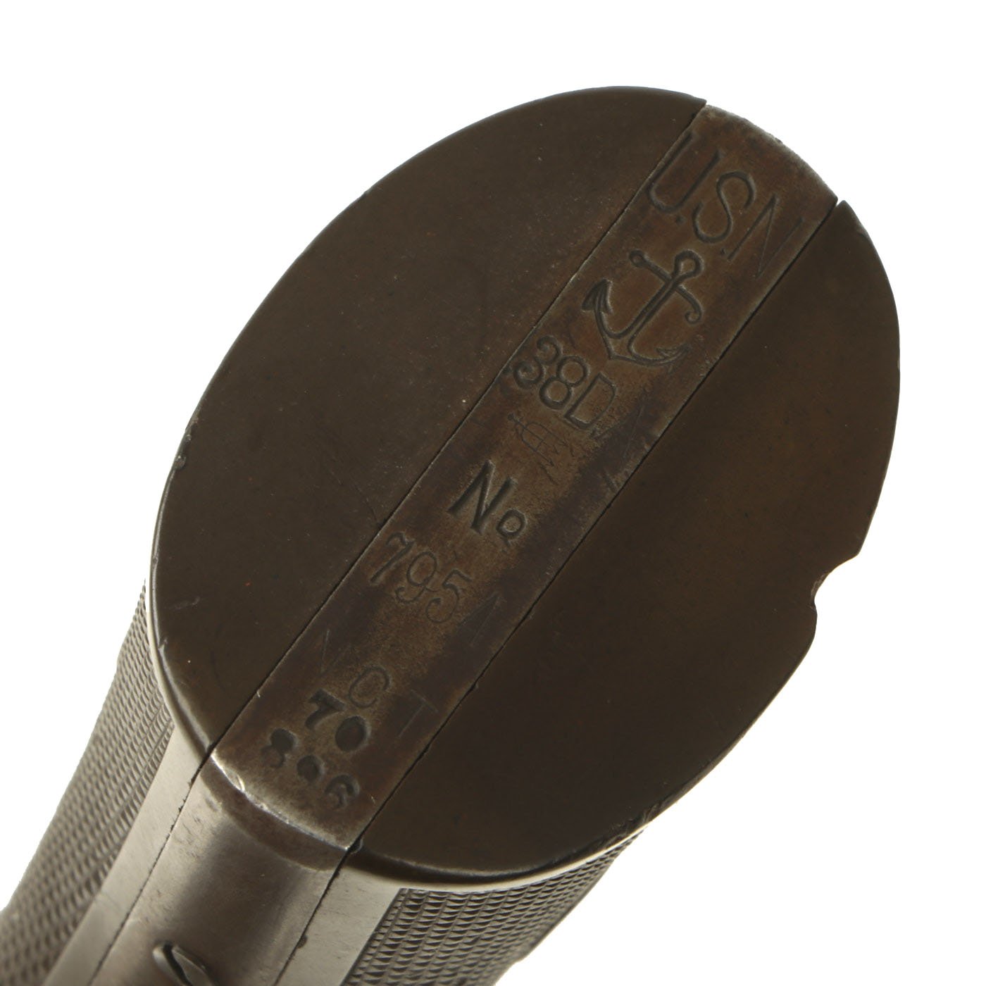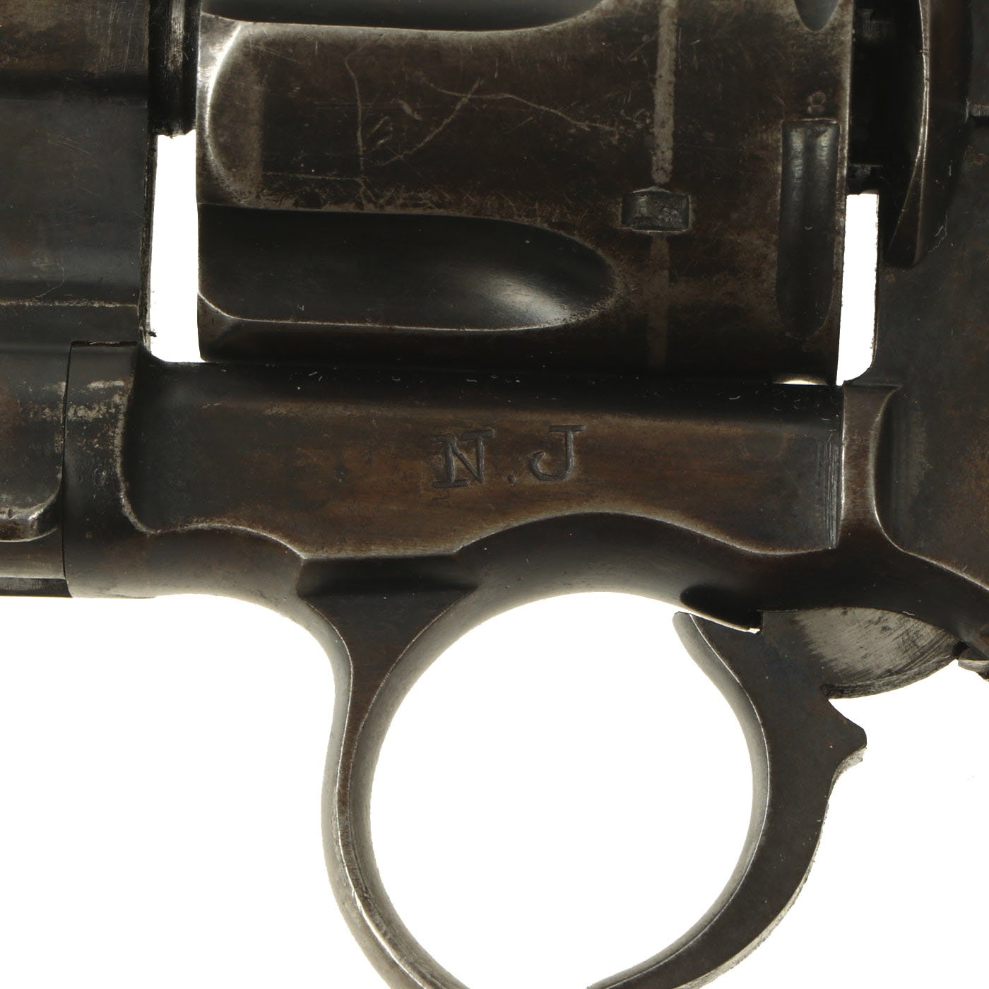 The initials "N C T" are for Lt. Nathan C. Twining, Inspector of Naval Ordnance in Hartford C.T., who was appointed to the position in 1895. He inspected Colt M1895 .38 Revolvers and Winchester-Lee 6mm Rifles while stationed there. There is an additional N.J. marking on the right side of the frame, indicating that it was shipped to the New Jersey Naval battalion after inspection.