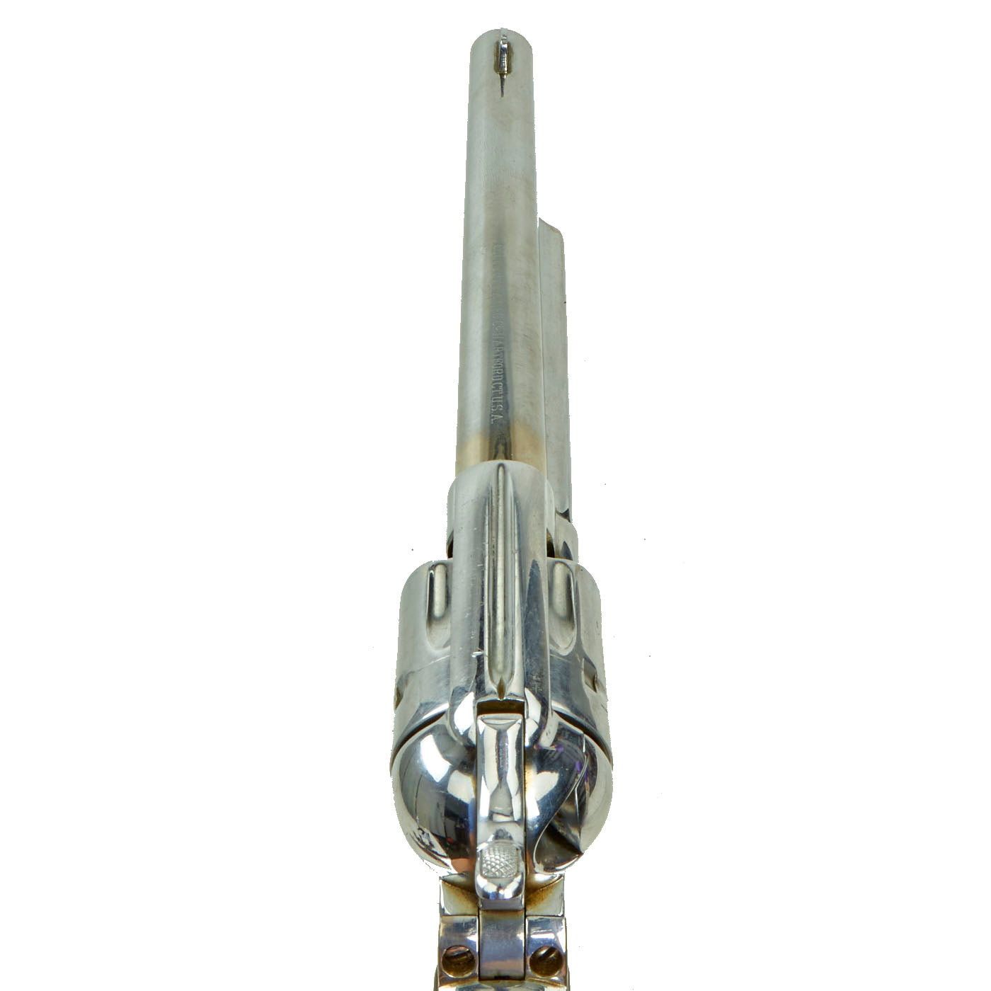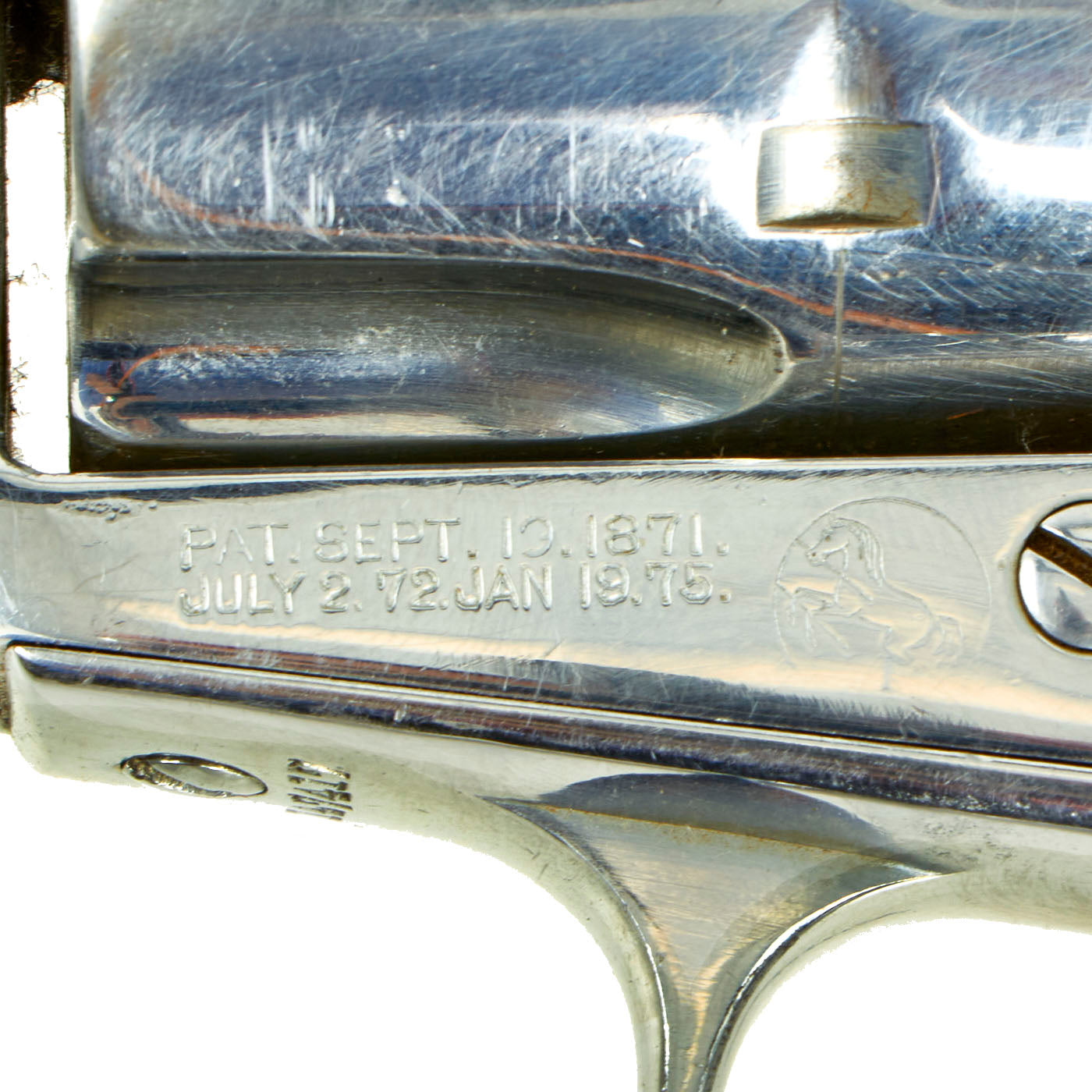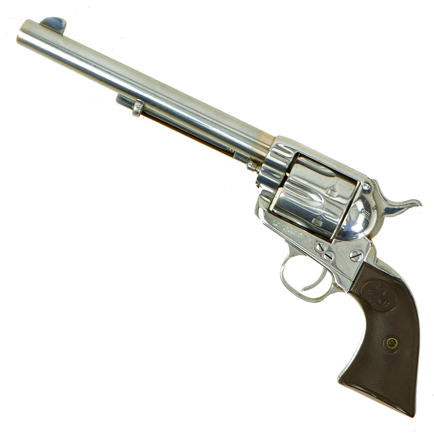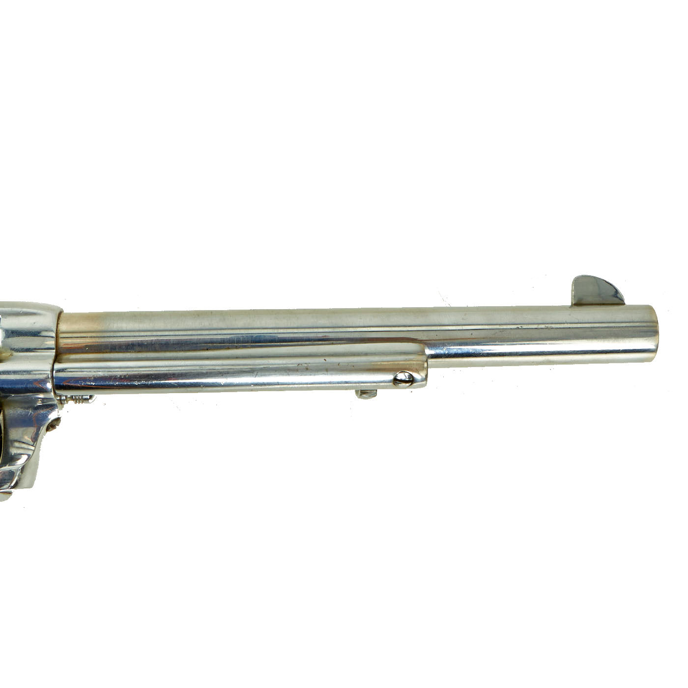 Original Item: Only One Available. This is every School boy's dream! A real Cowboy six gun! This fantastic Colt SAA (Single Action Army) Revolver has a full length factory-replaced 7 1/2" barrel and lovely Colt hard rubber grips, bearing the iconic Colt "Prancing Pony". We also believe that the gun was entirely refit at the factory, and now has a fantastic nickel plated finish!