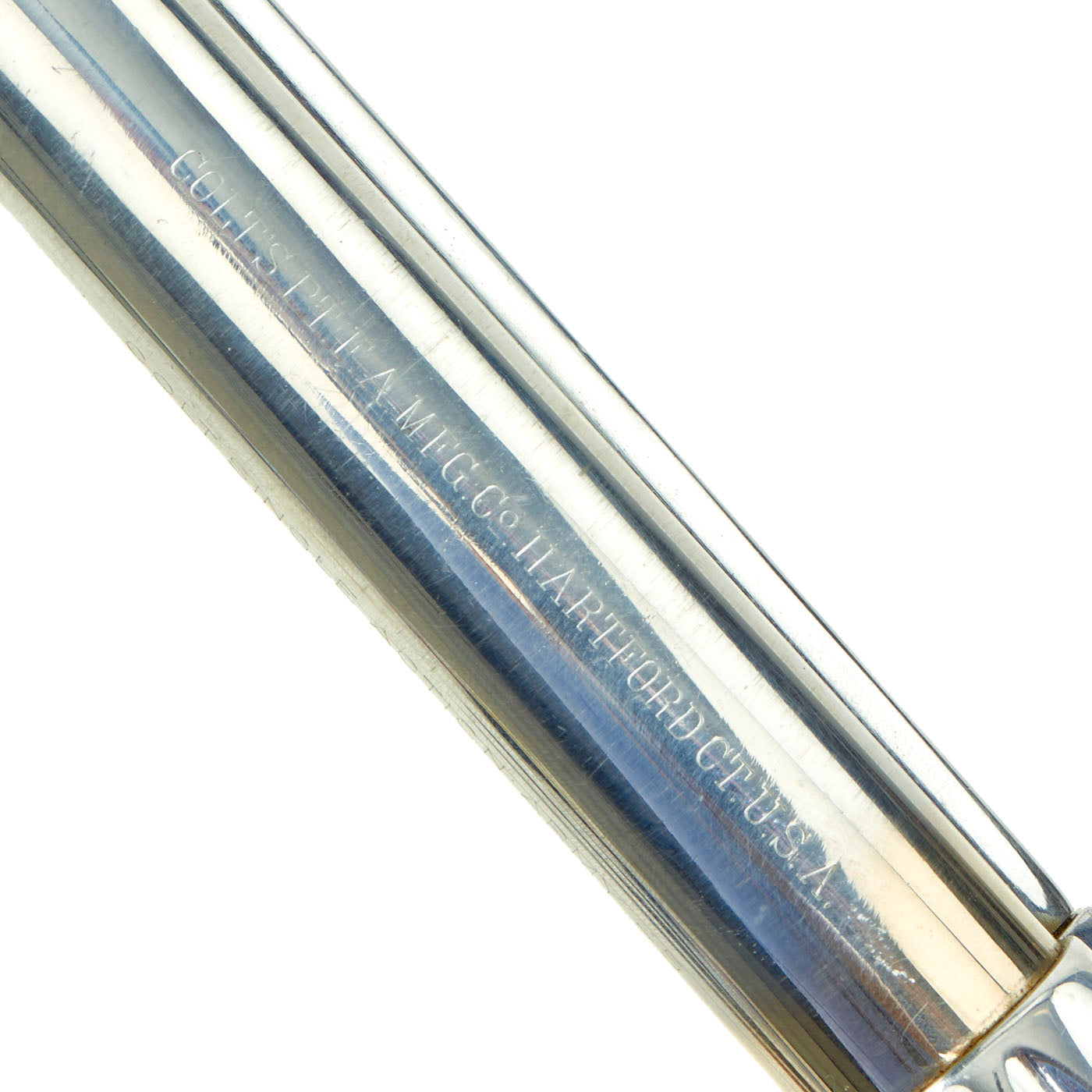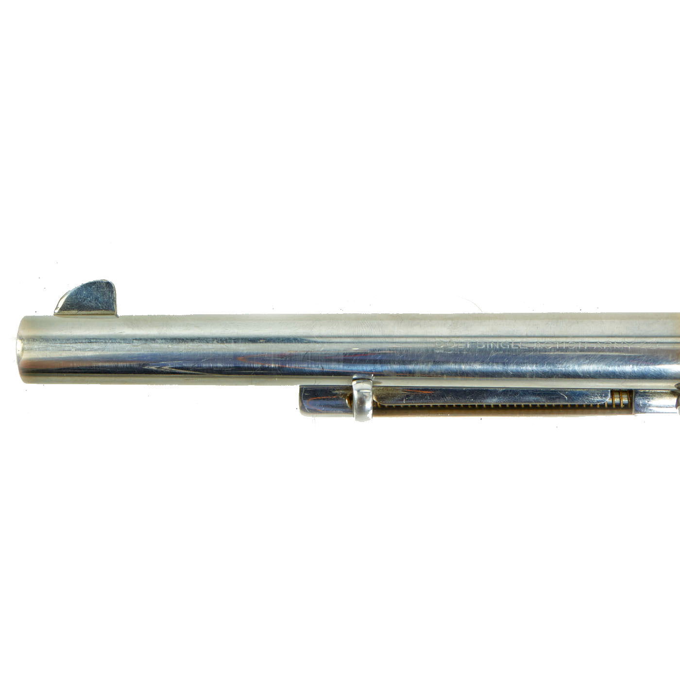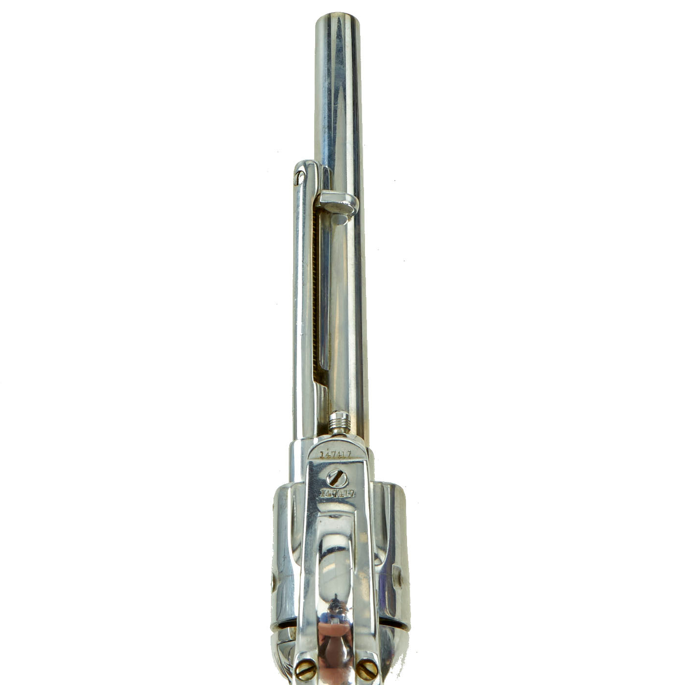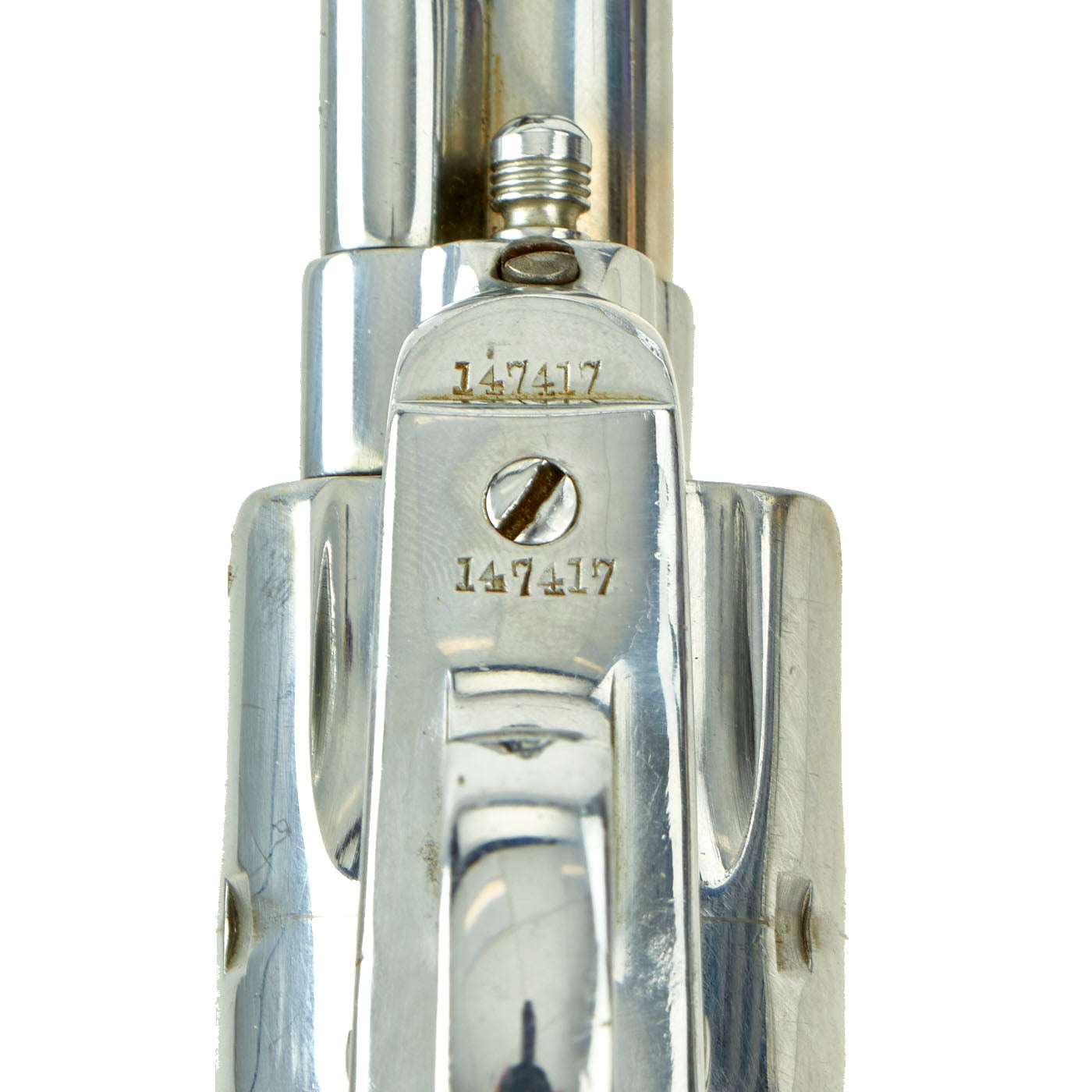 Original Item: Only One Available. This is every School boy's dream! A real Cowboy six gun! This fantastic Colt SAA (Single Action Army) Revolver has a full length factory-replaced 7 1/2" barrel and lovely Colt hard rubber grips, bearing the iconic Colt "Prancing Pony". We also believe that the gun was entirely refit at the factory, and now has a fantastic nickel plated finish!