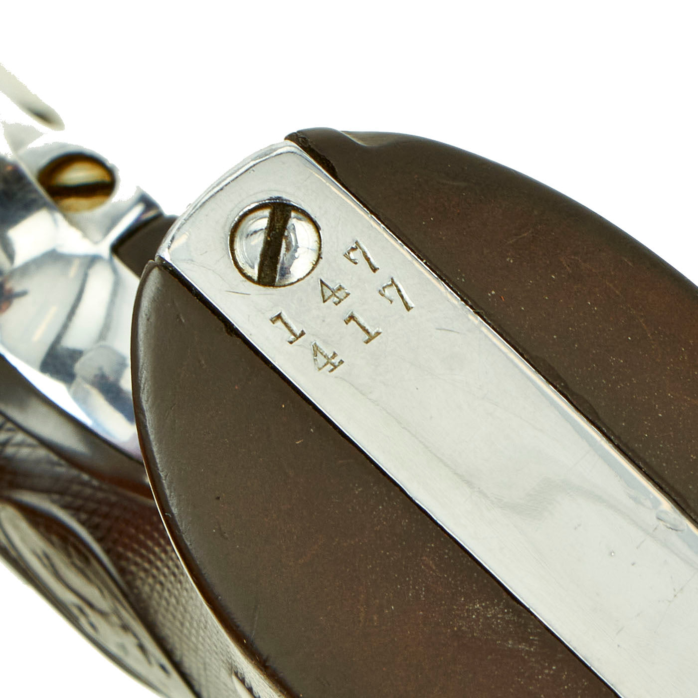 The revolver looks simply fantastic, with just a bit of wear and patination on the nickel plated finish. The Colt hard rubber grips have a lovely dark brown color, with just a bit of wear, and some dents on the very bottom. The checkering is still strong, and the "Prancing Pony" is clear. The revolver disassembles correctly, and the cylinder arbor pin and locking screw are in great shape.