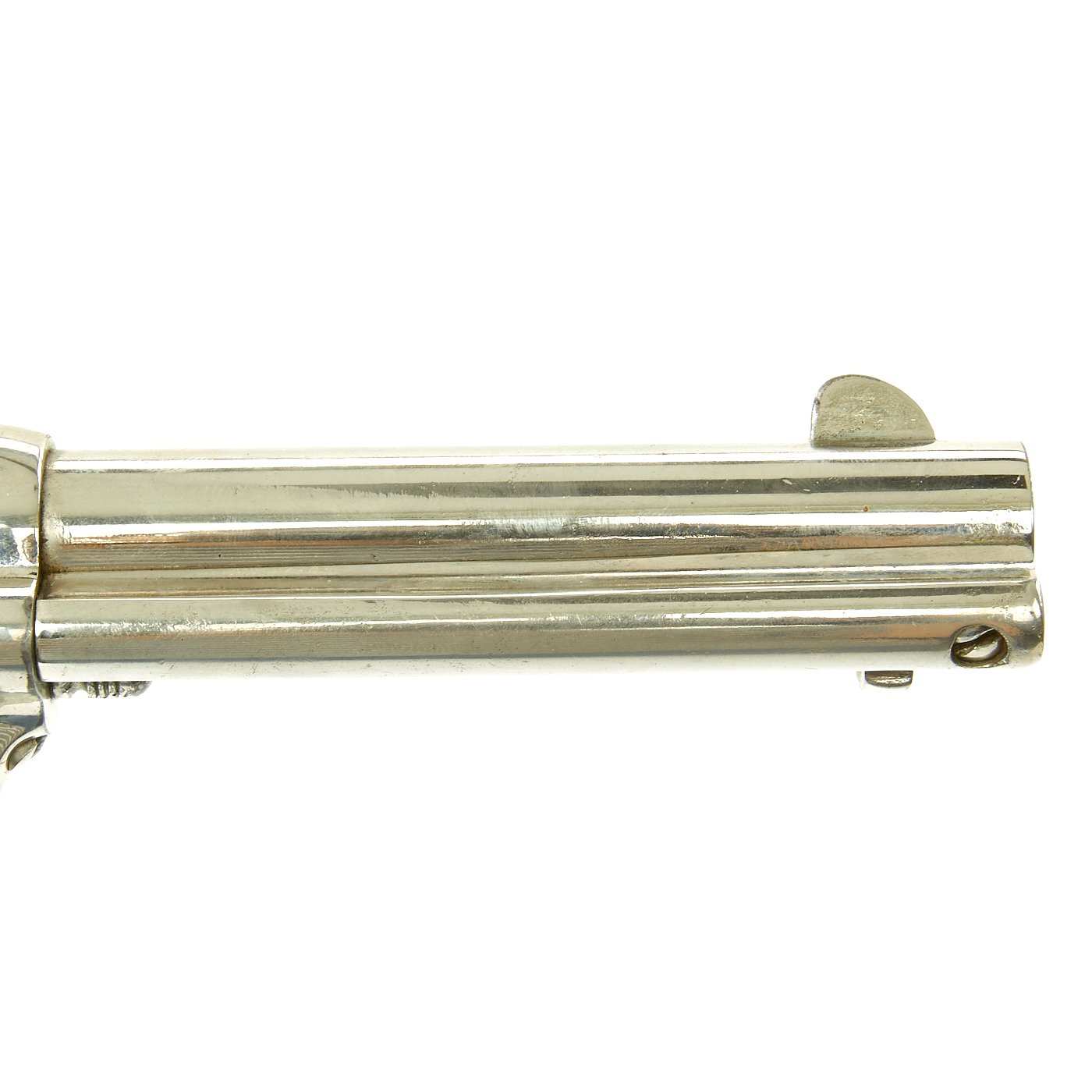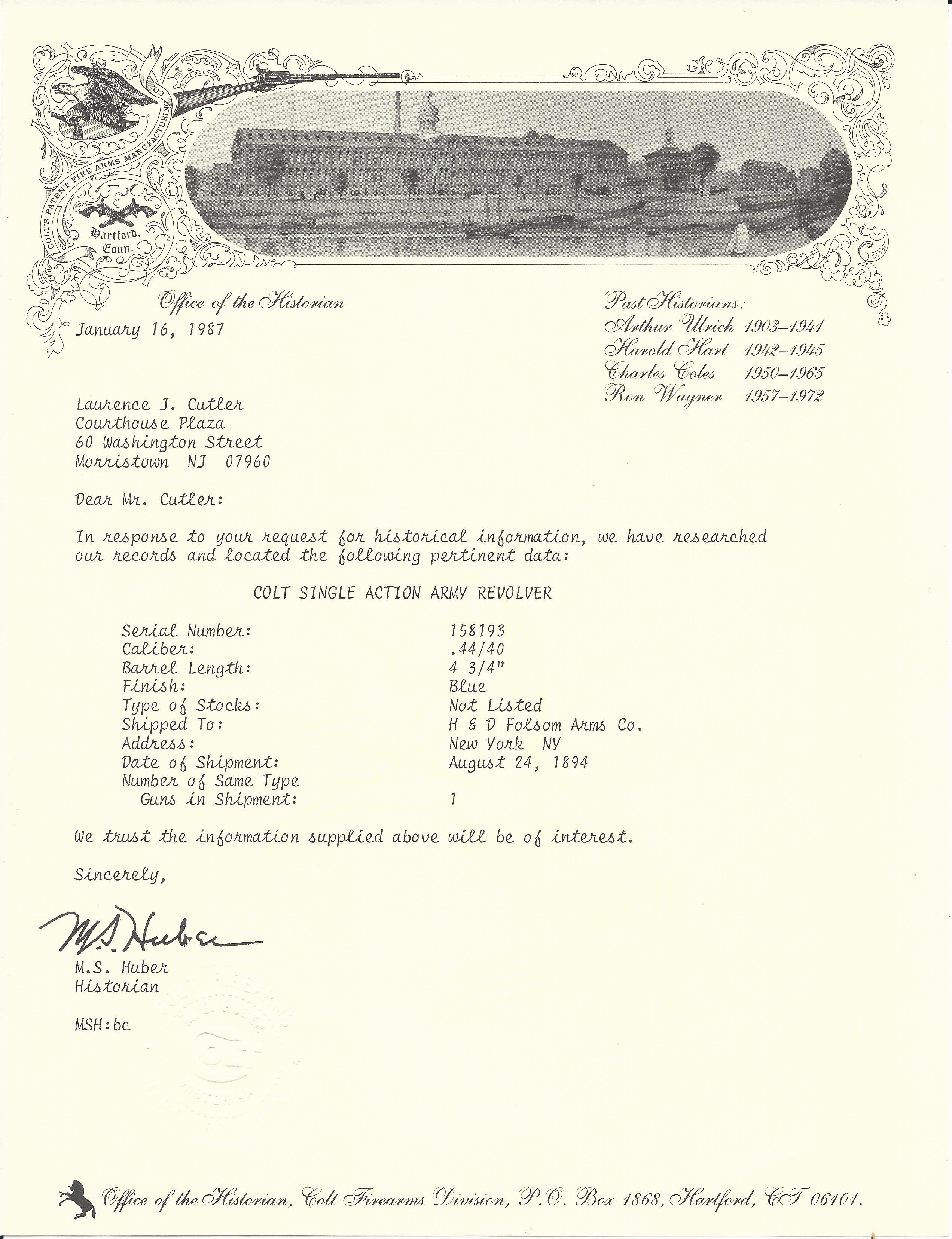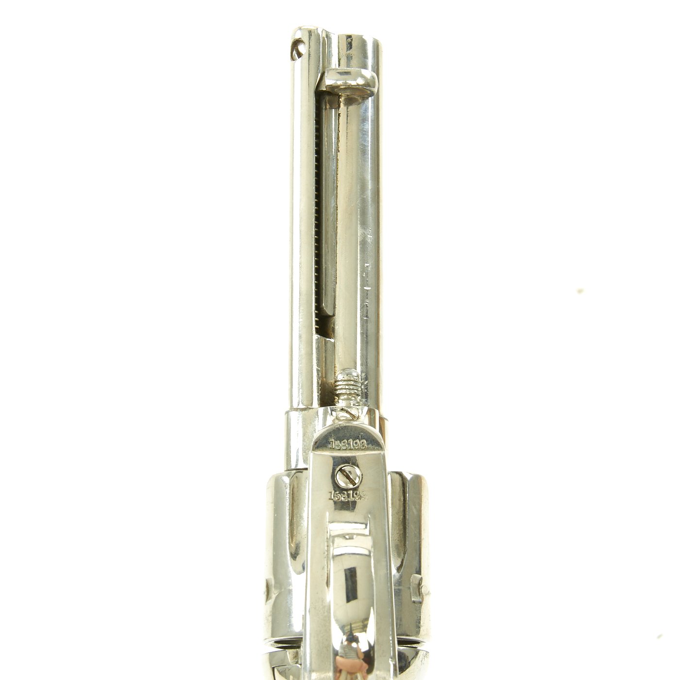Regarding the history of this revolver, the Colt letter indicates it was shipped August 24th 1894 to retailer H. & D. FOLSOM ARMS Co, New York, New York, and there was only this one Revolver in the shipment. Interestingly the factory letter states it was shipped with a blue finish but we think that because of the fashion in the Roaring 1890's it was immediately Nickel Plated by special order of the customer. Demand was very high and supplies always short so undertaking Nickel plating in New York was very possibly much quicker in the delivery time than directly from Colt.