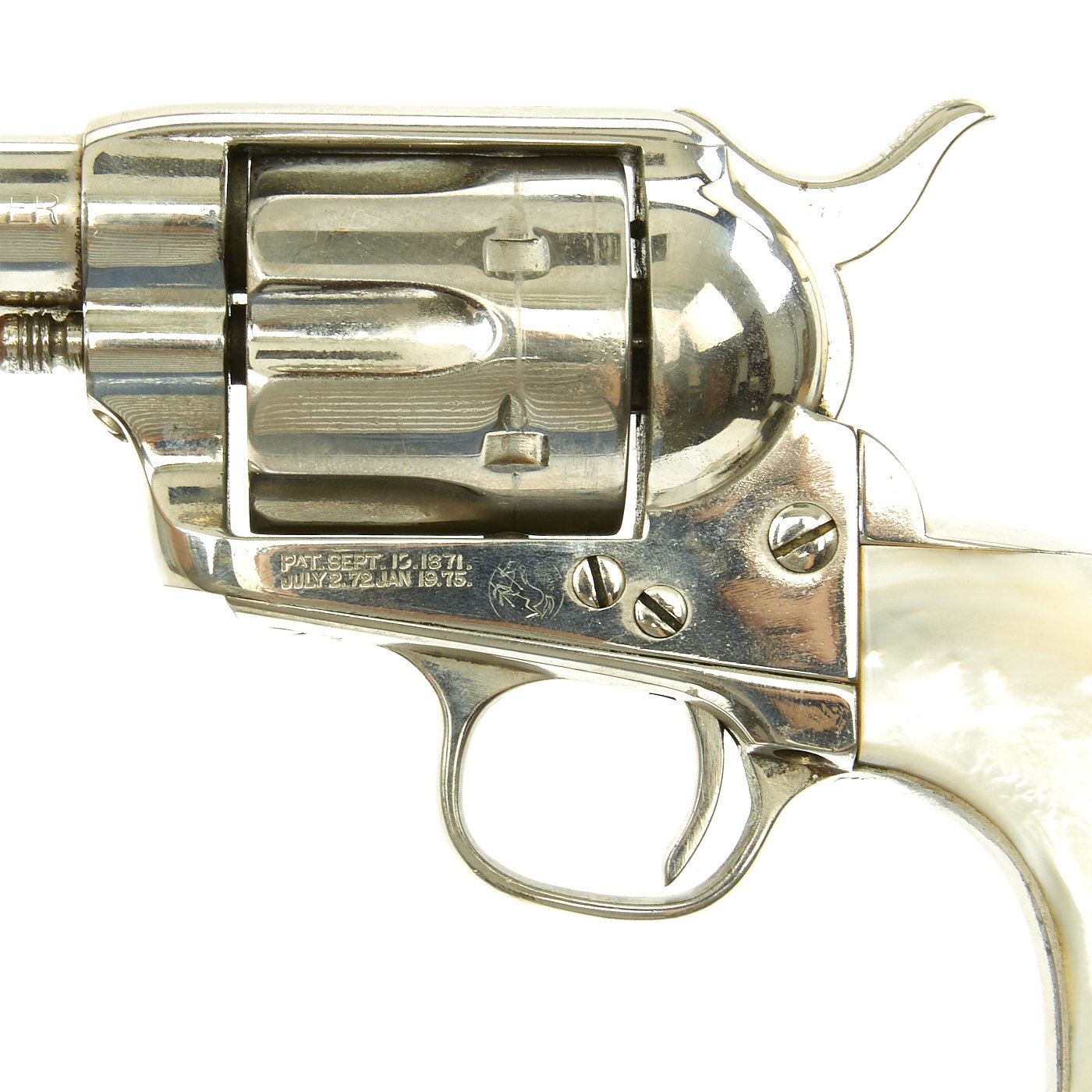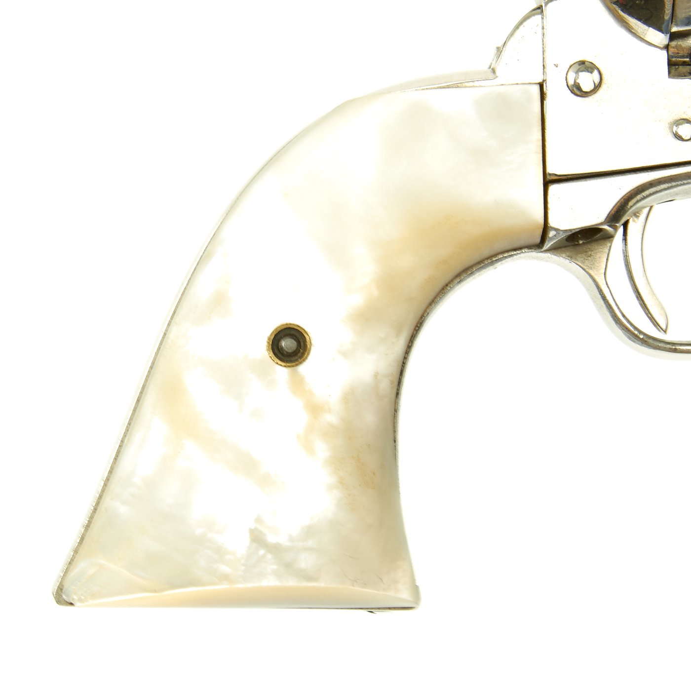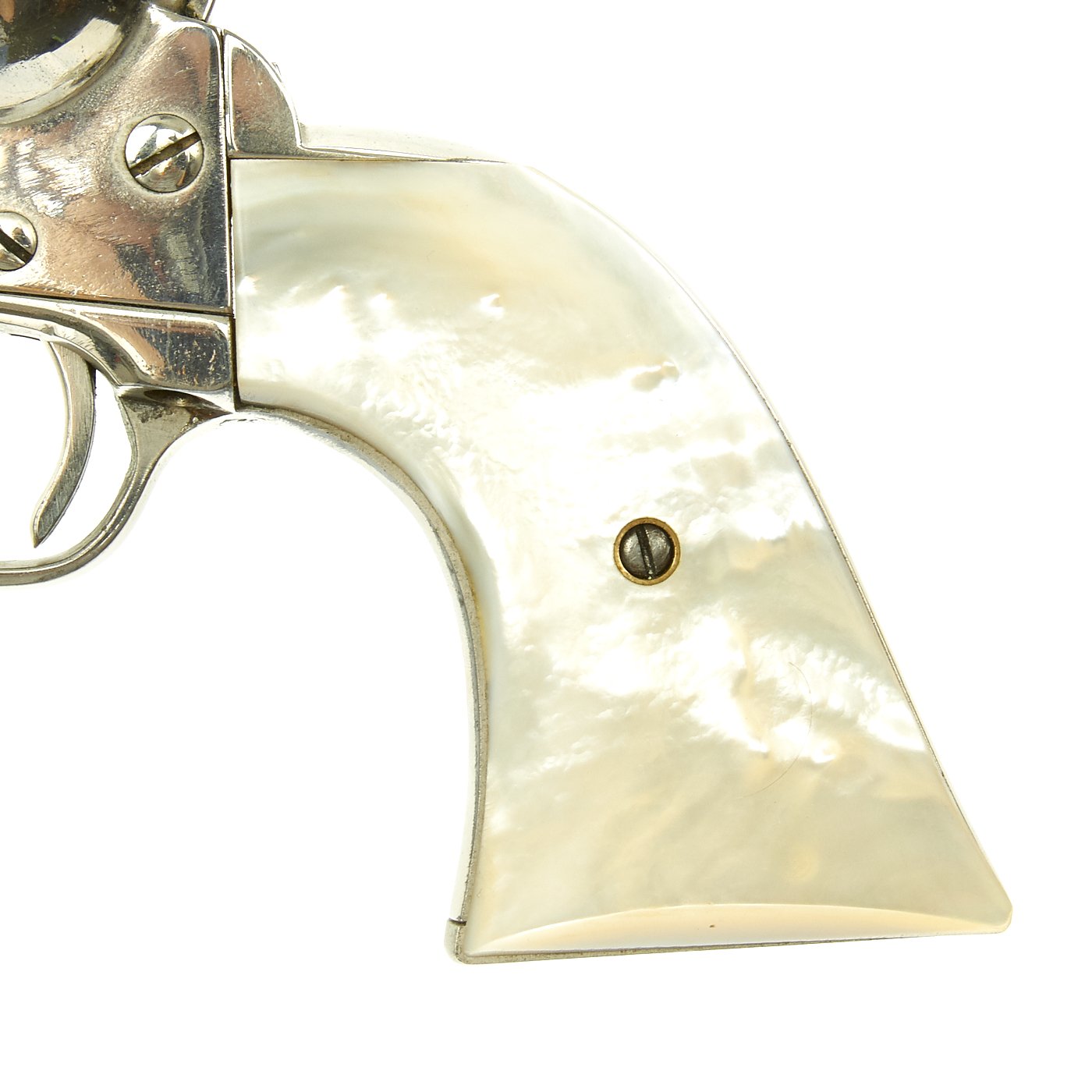 Original Items: Only One Set Available. This is it! Every young "Old West" fans dream: A real Colt Six-shooter! This is an incredible original Colt Single Action Army "Frontier Six Shooter" Model Revolver, nickel-plated with custom Mother of Pearl grips. Included with this revolver is also an official Colt Historian letter, dated January 16, 1987, giving the factory records of this particular revolver, which really helps explain the history of this really "pimped out" example.