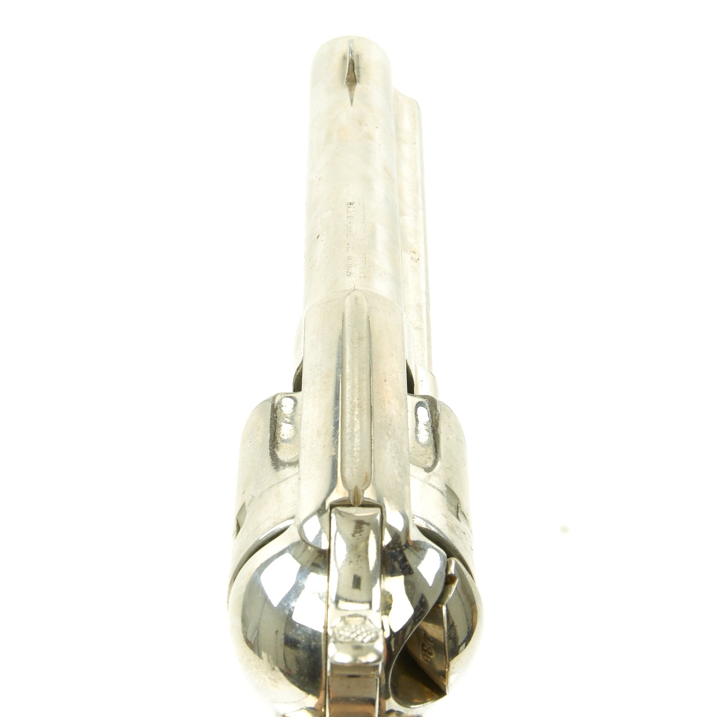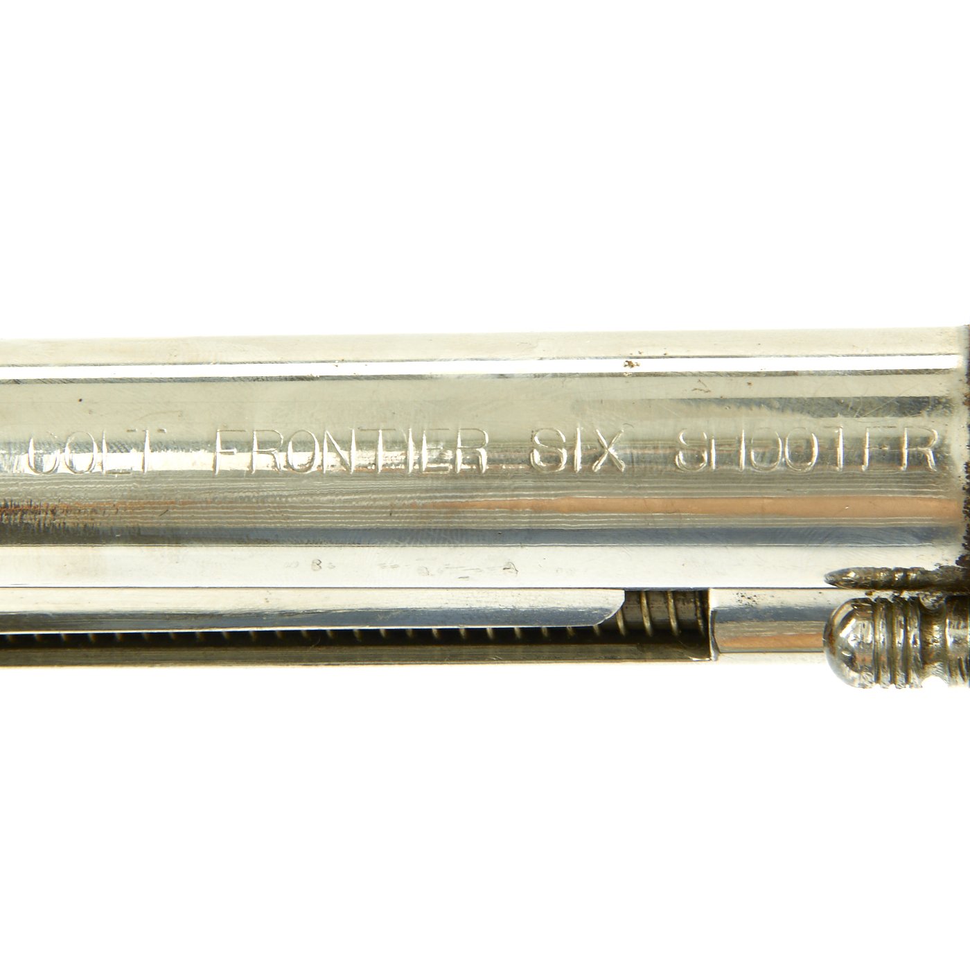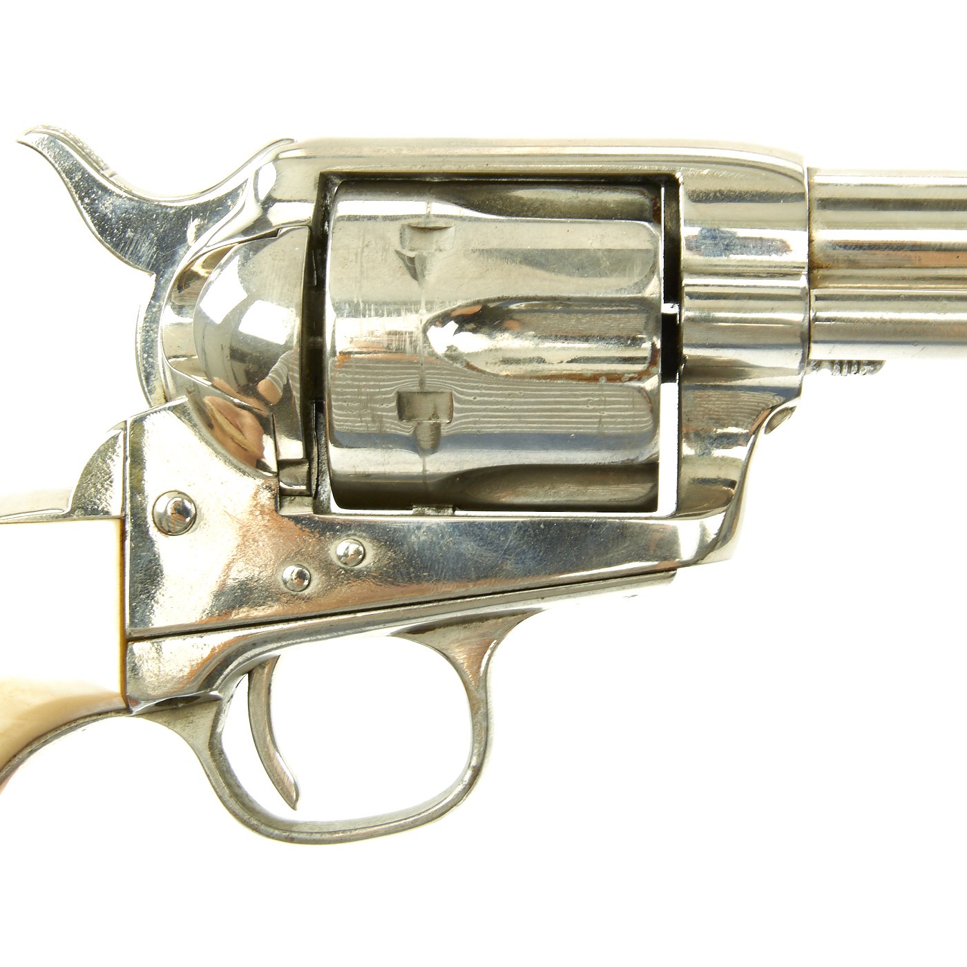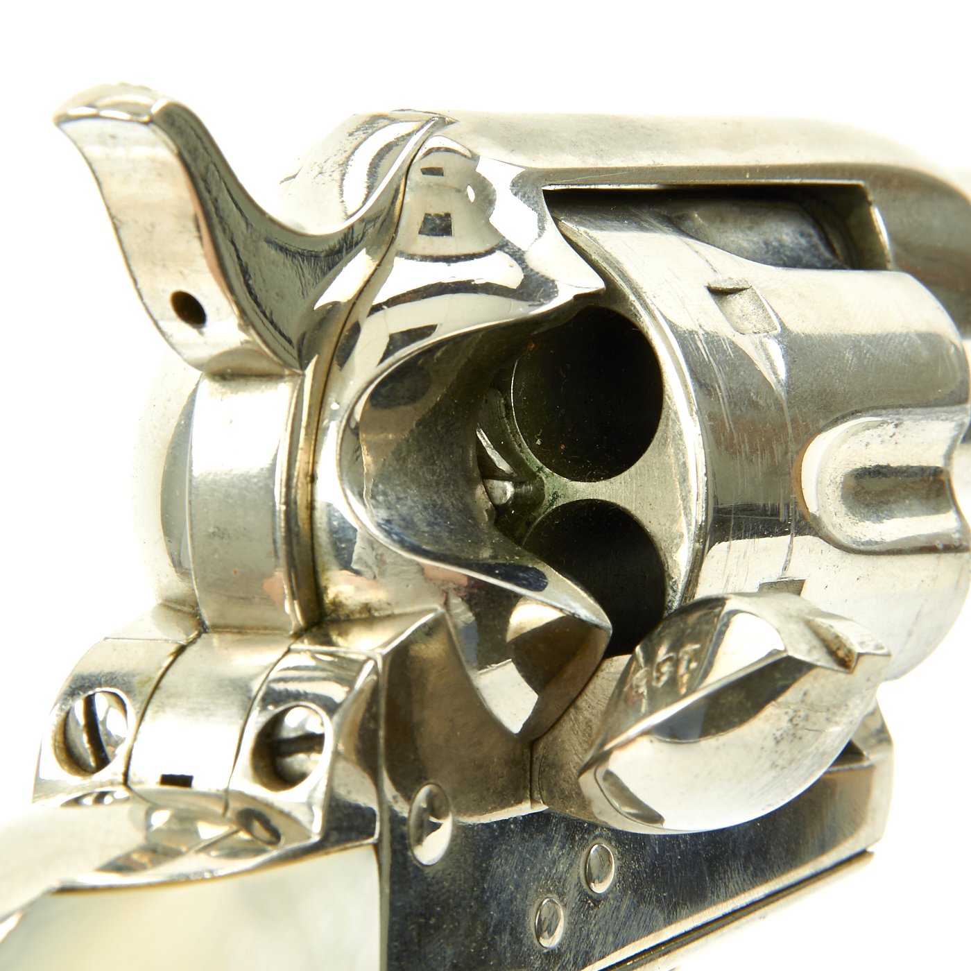 Original Items: Only One Set Available. This is it! Every young "Old West" fans dream: A real Colt Six-shooter! This is an incredible original Colt Single Action Army "Frontier Six Shooter" Model Revolver, nickel-plated with custom Mother of Pearl grips. Included with this revolver is also an official Colt Historian letter, dated January 16, 1987, giving the factory records of this particular revolver, which really helps explain the history of this really "pimped out" example.