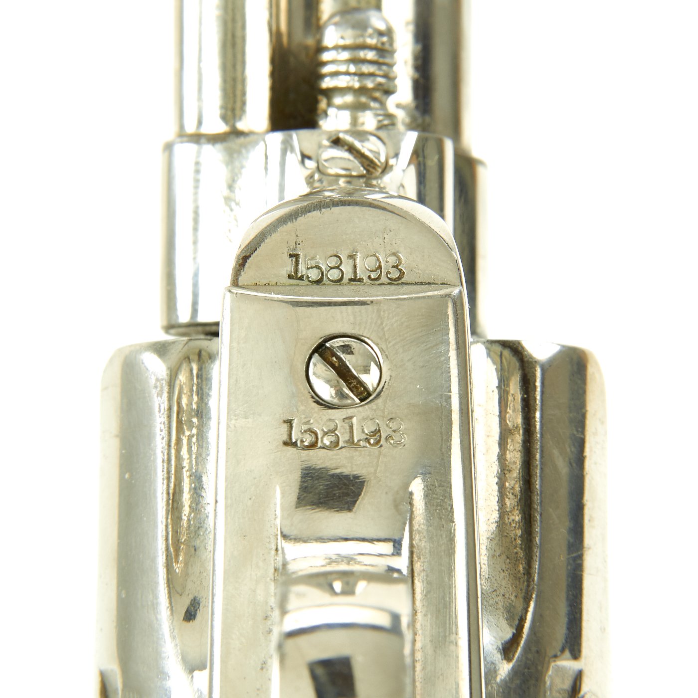 This revolver's serial number is 158193, which indicates it was manufactured in 1894. The Nickel plating is almost entirely intact, with just some scuffing on the cylinder from the cylinder locking pawl. The left side of the frame shows the Colt "Prancing Pony" logo, and shows patent dates of 1871, 1872 and 1875. The trigger guard, frame and grip bottom strap strap have matching serial number 158193, so this is an all matching revolver.
