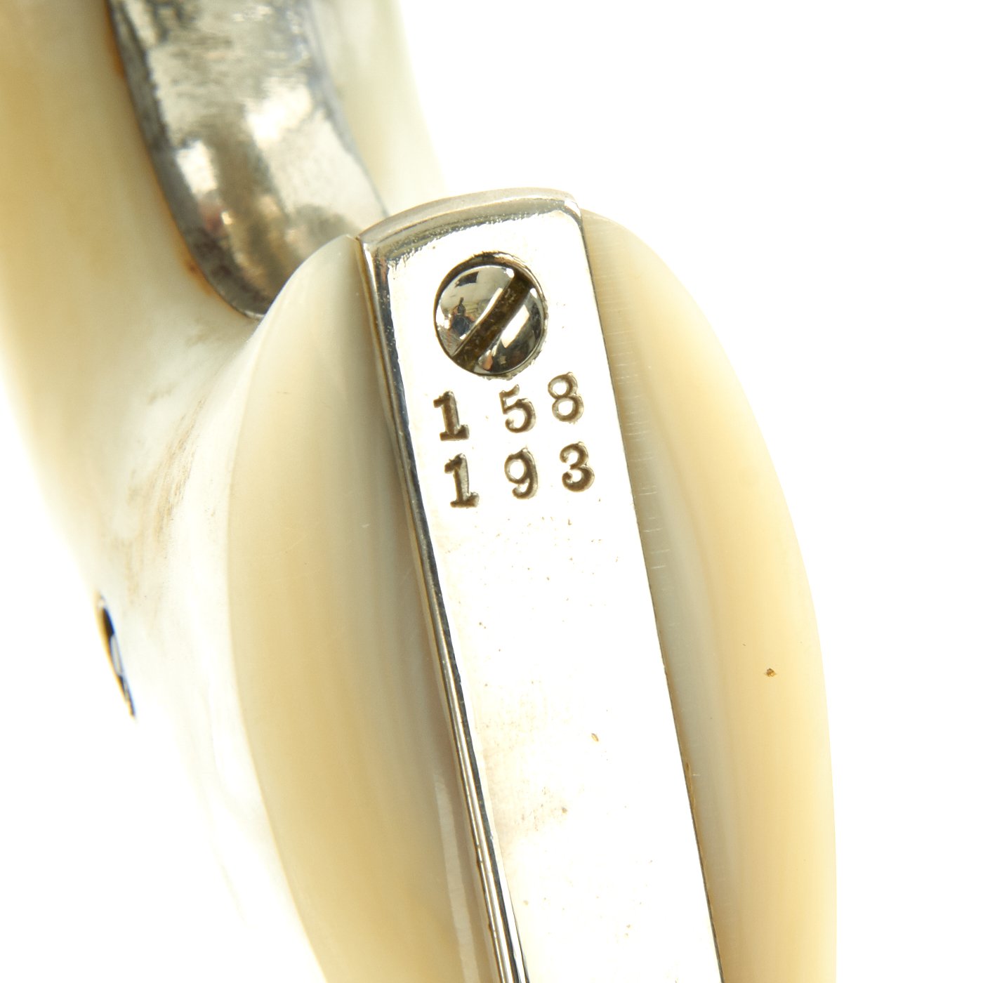 The custom mother of pearl grips are in great shape, with just a bit of chipping on the rear bottom corner. There is no real staining or wear to speak of. The bottom of the grips also clearly shows the "grain" of the mother of pearl, showing that these are the real deal, and not some later celluloid replacement. If only we could still get mother of pearl of this quality!