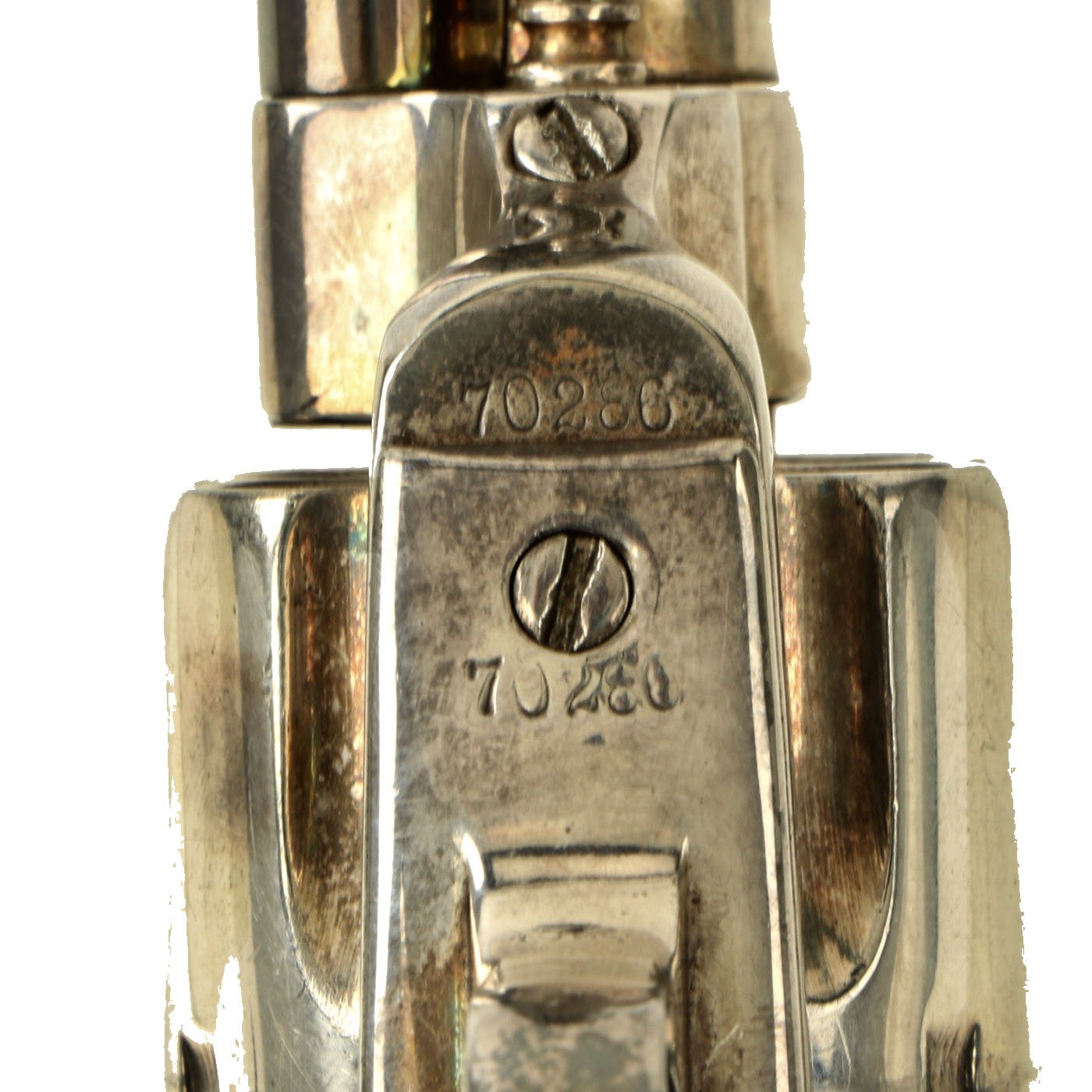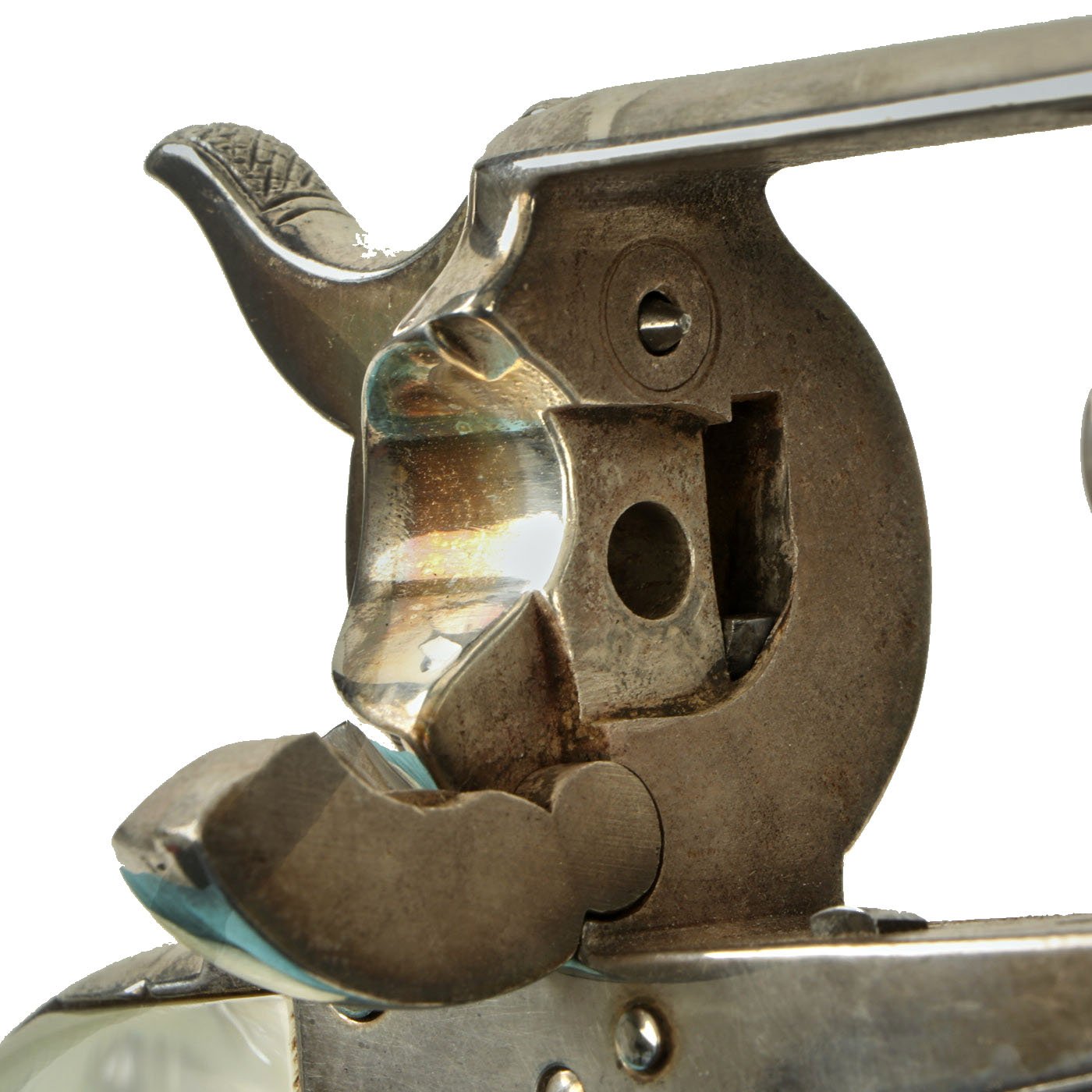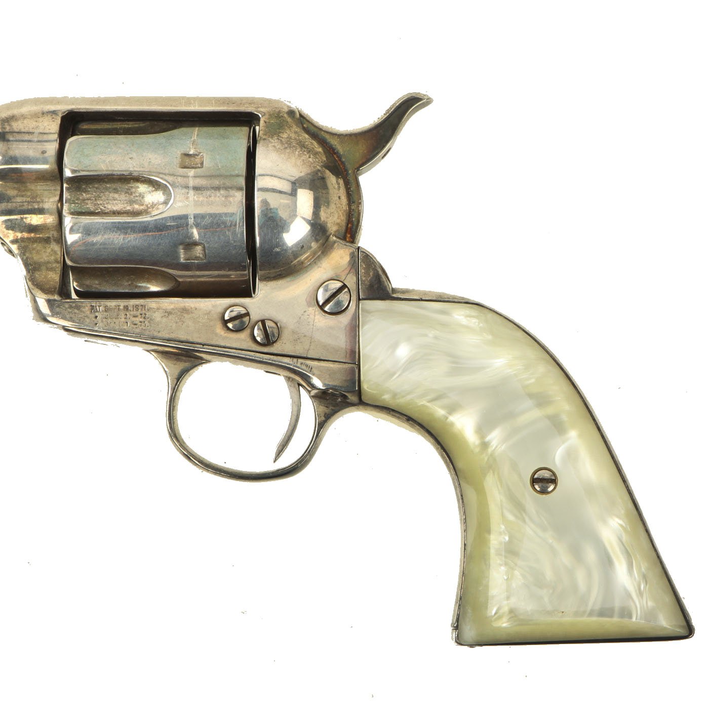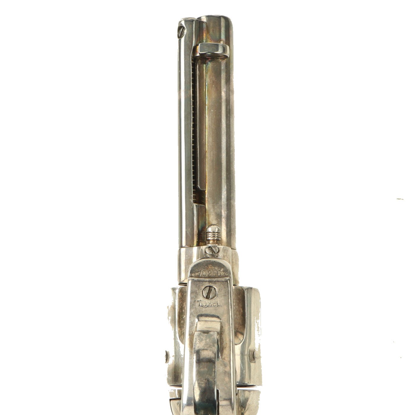 Original Item: Only One Available. This is every School boy's dream! A real Cowboy six gun! This very attractive Colt SAA (Single Action Army) Revolver has a "gunfighter friendly" shortened 4 3/4" inch barrel, which allowed a quicker draw. Additionally, this example has been customized, refinished in lovely Silver plate and fitted with some great looking pearloid plastic grip plates.