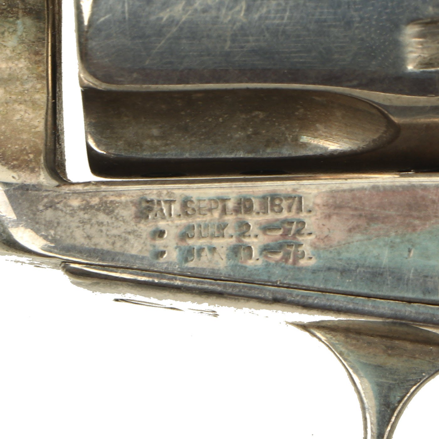 These are the early pattern markings, and this was made before the "Prancing Pony" logo began appearing on the frame. The caliber marking is not visible, however we checked the cylinder and barrel, and this revolver is definitely chambered for .45 Colt, also known as .45 "LONG" Colt, one of the most legendary handgun cartridges of the old west. When you hear people talk of a "Colt 45", this model gun is the reason why.