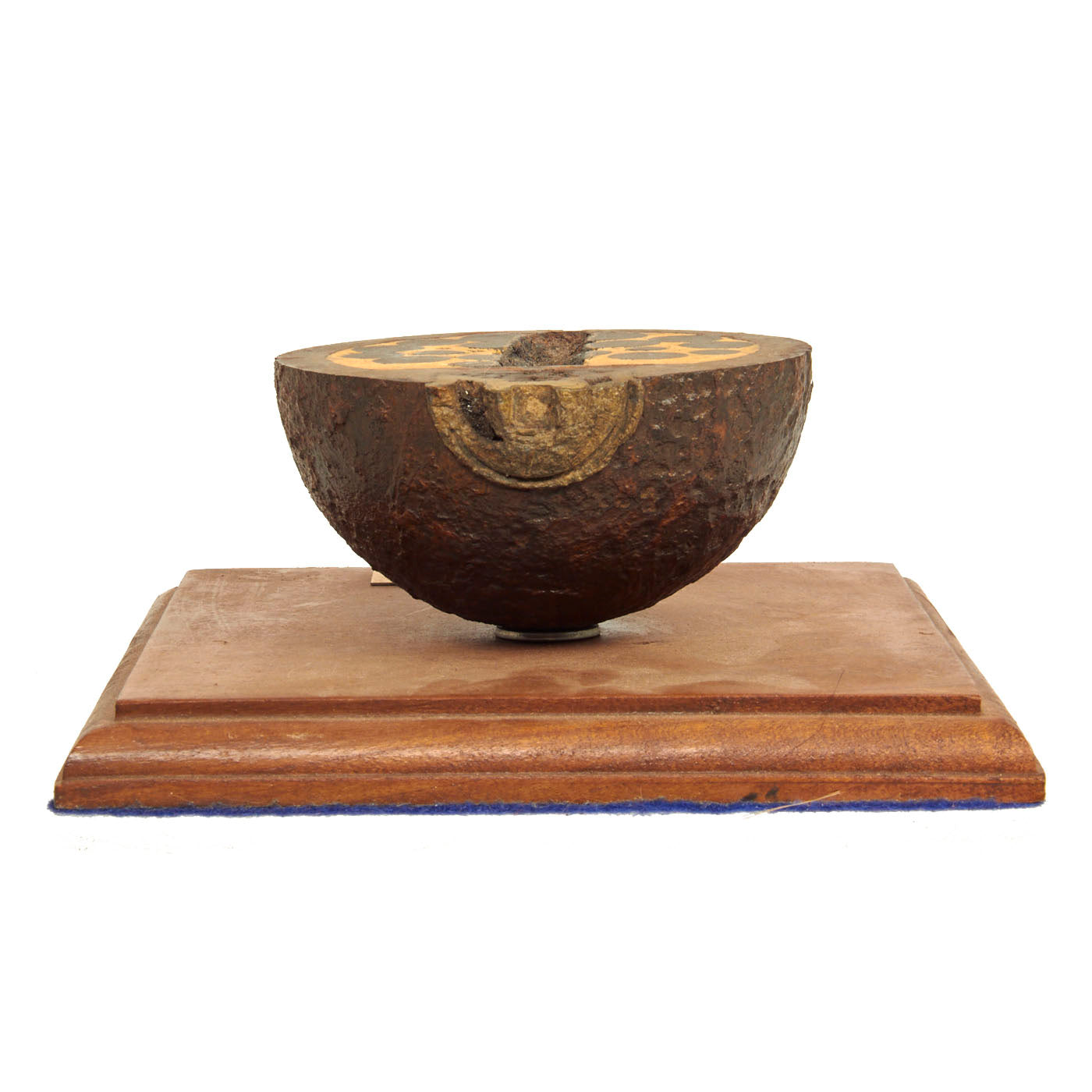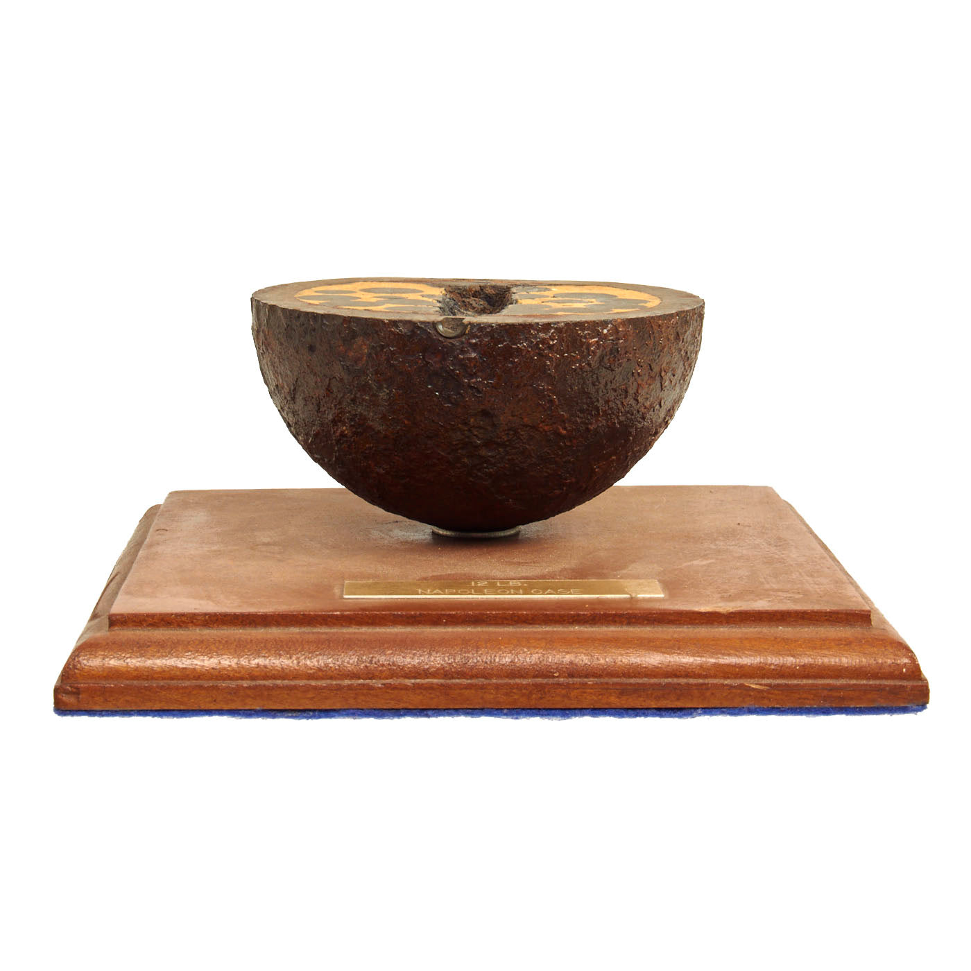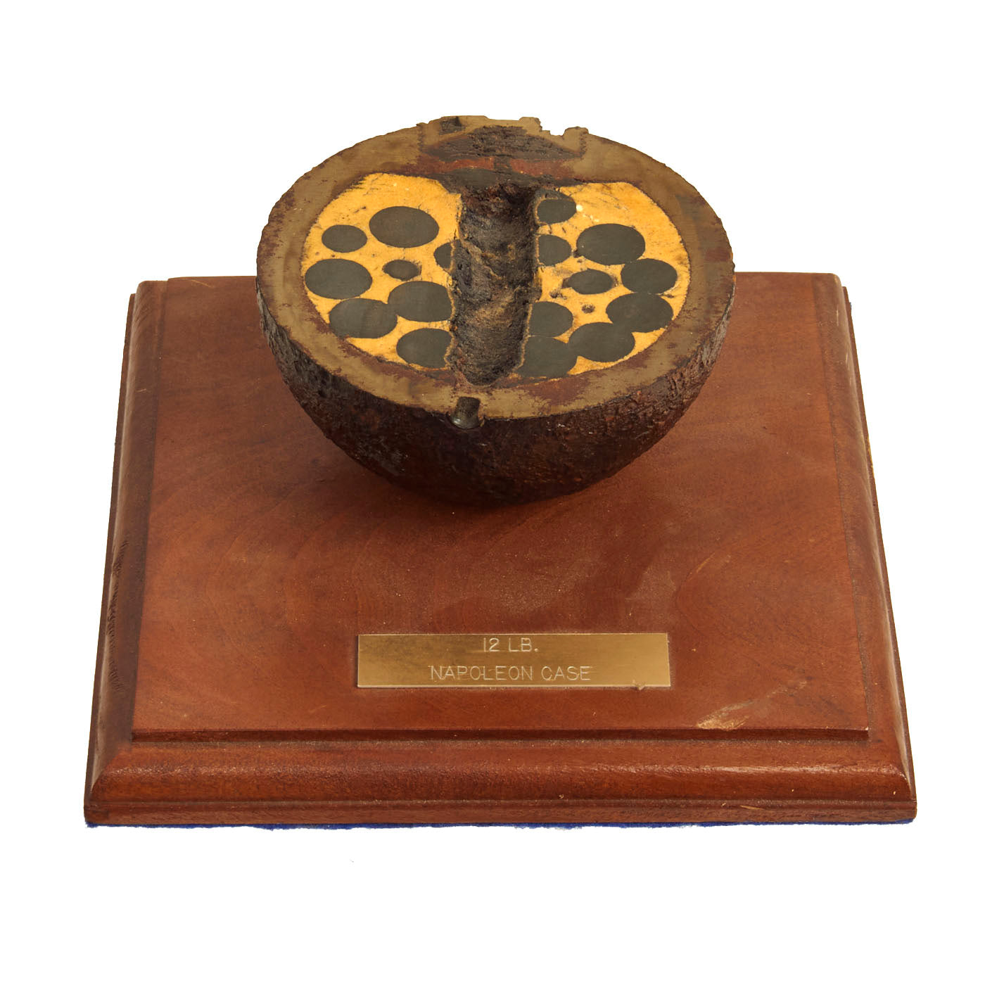 Original Item: Only One Available. Very well done cutaway display made from a Confederate cannonball. This is a 4.52” Shell used with the twelve pound Napoleon Artillery Piece. The shell is fitted with a two-slot Borman Fuze, which is still present, and still filled with the original shot!