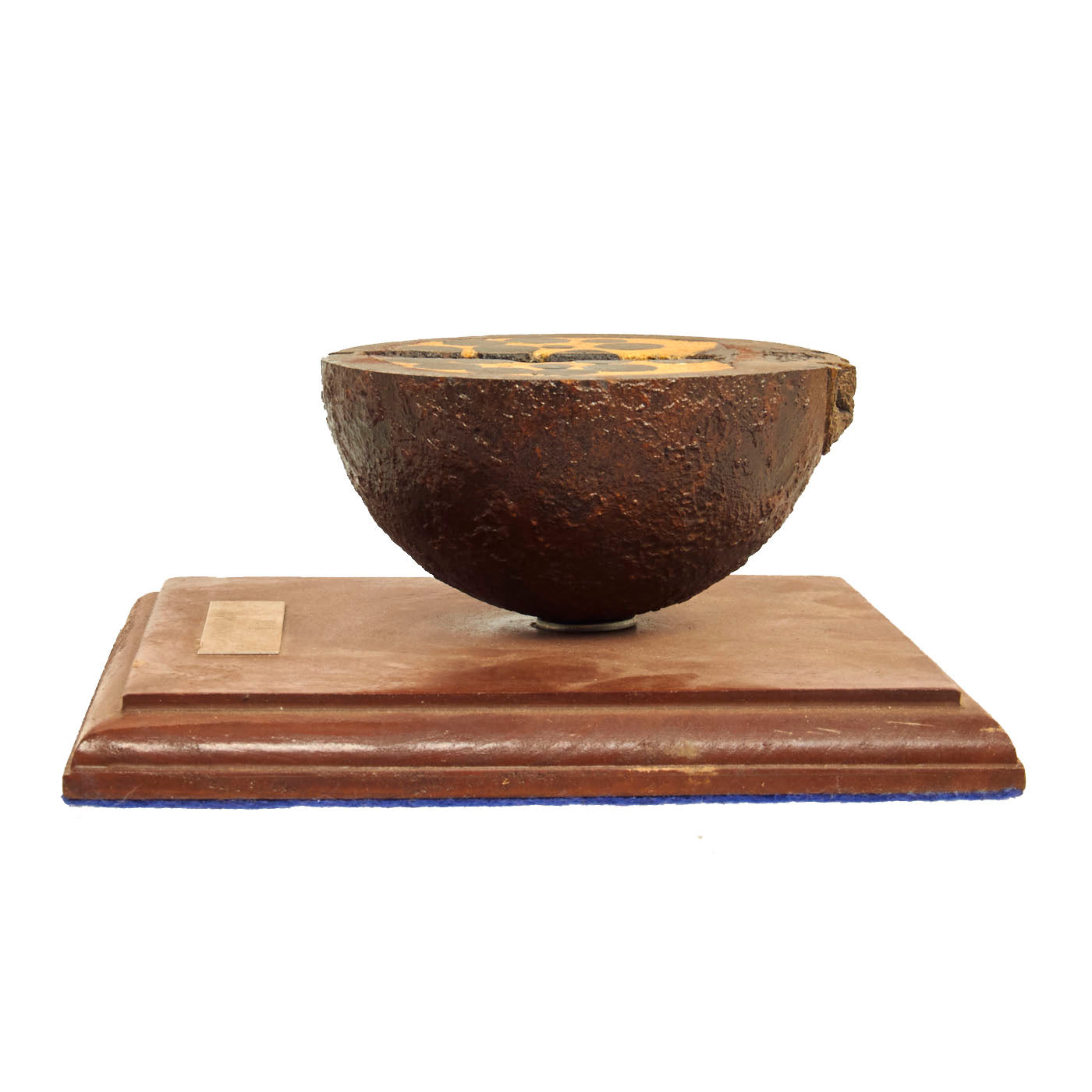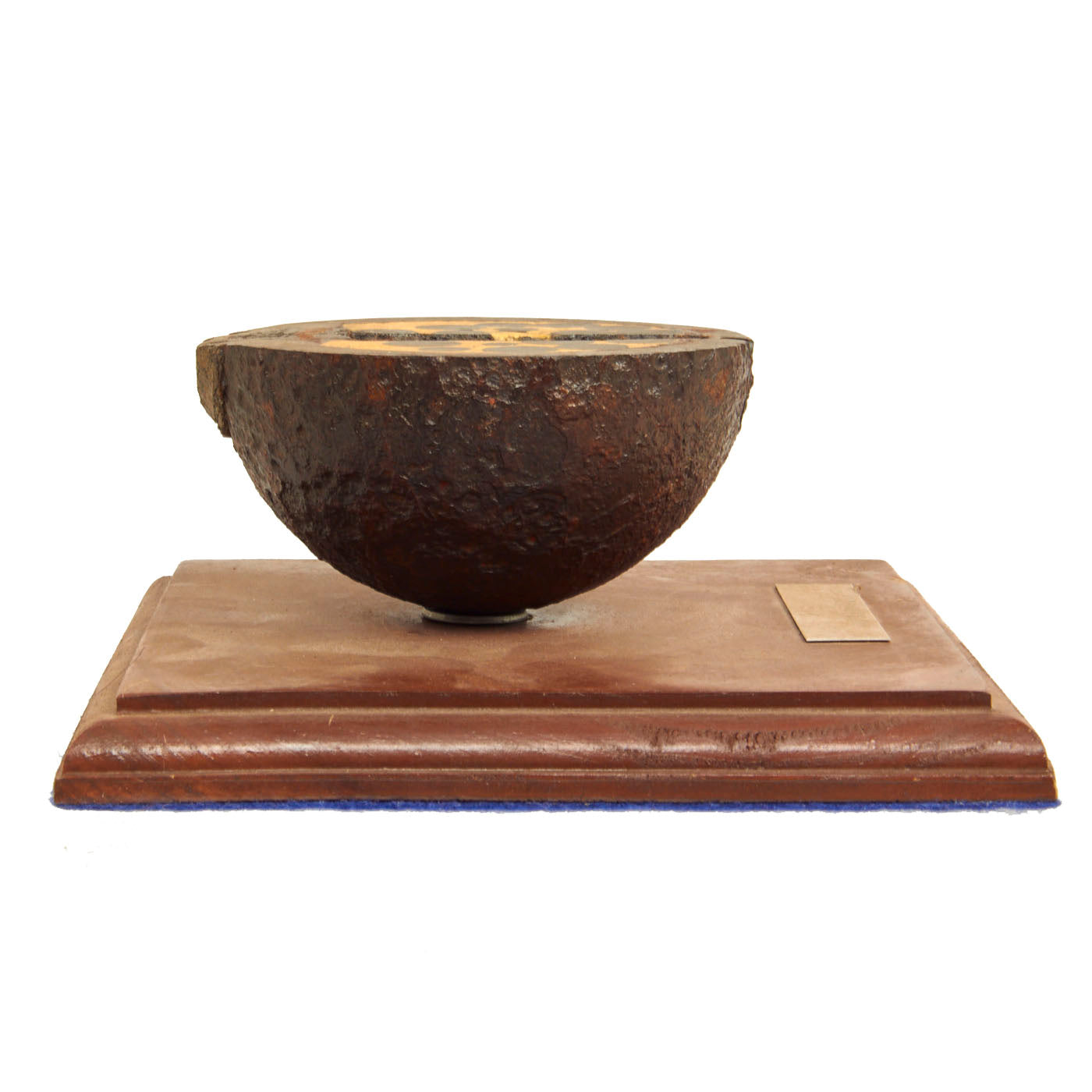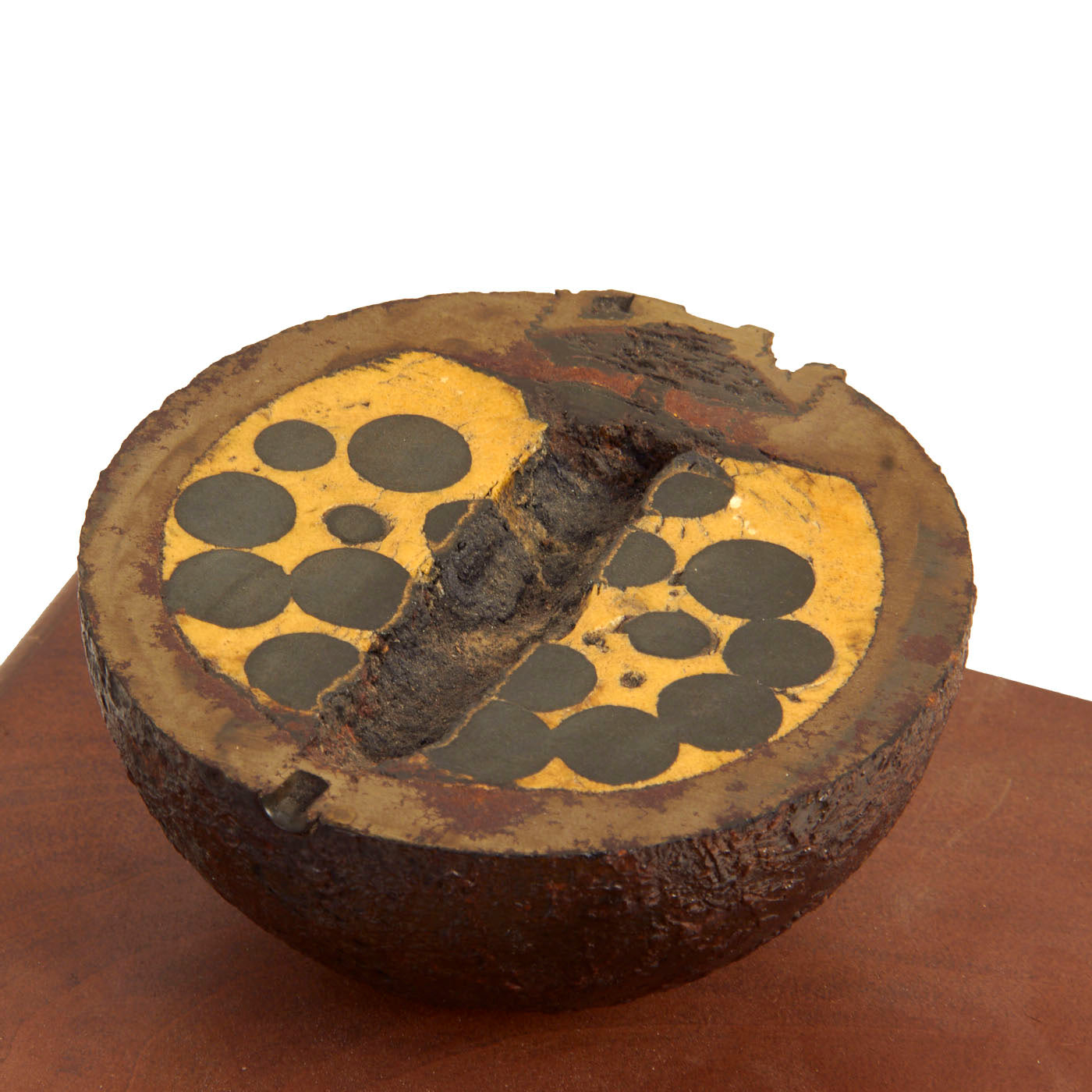 Original Item: Only One Available. Very well done cutaway display made from a Confederate cannonball. This is a 4.52” Shell used with the twelve pound Napoleon Artillery Piece. The shell is fitted with a two-slot Borman Fuze, which is still present, and still filled with the original shot!