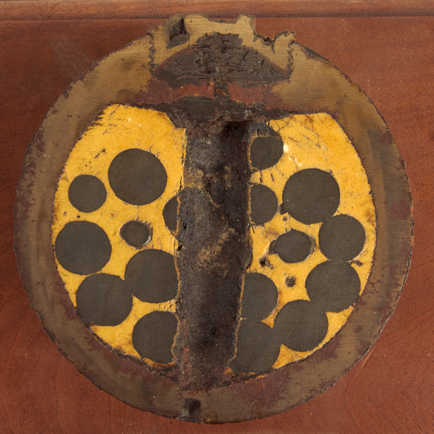 This item was excavated, so the iron surface is pitted from being underground for well over a century. Lead/zinc fuse band shows ground action on exterior, so no numbers remain visible. However, the embedded powder train within the band remains evident in the cross-section. The hole that lead to the inner charge from the fuse is also visible on this specimen.