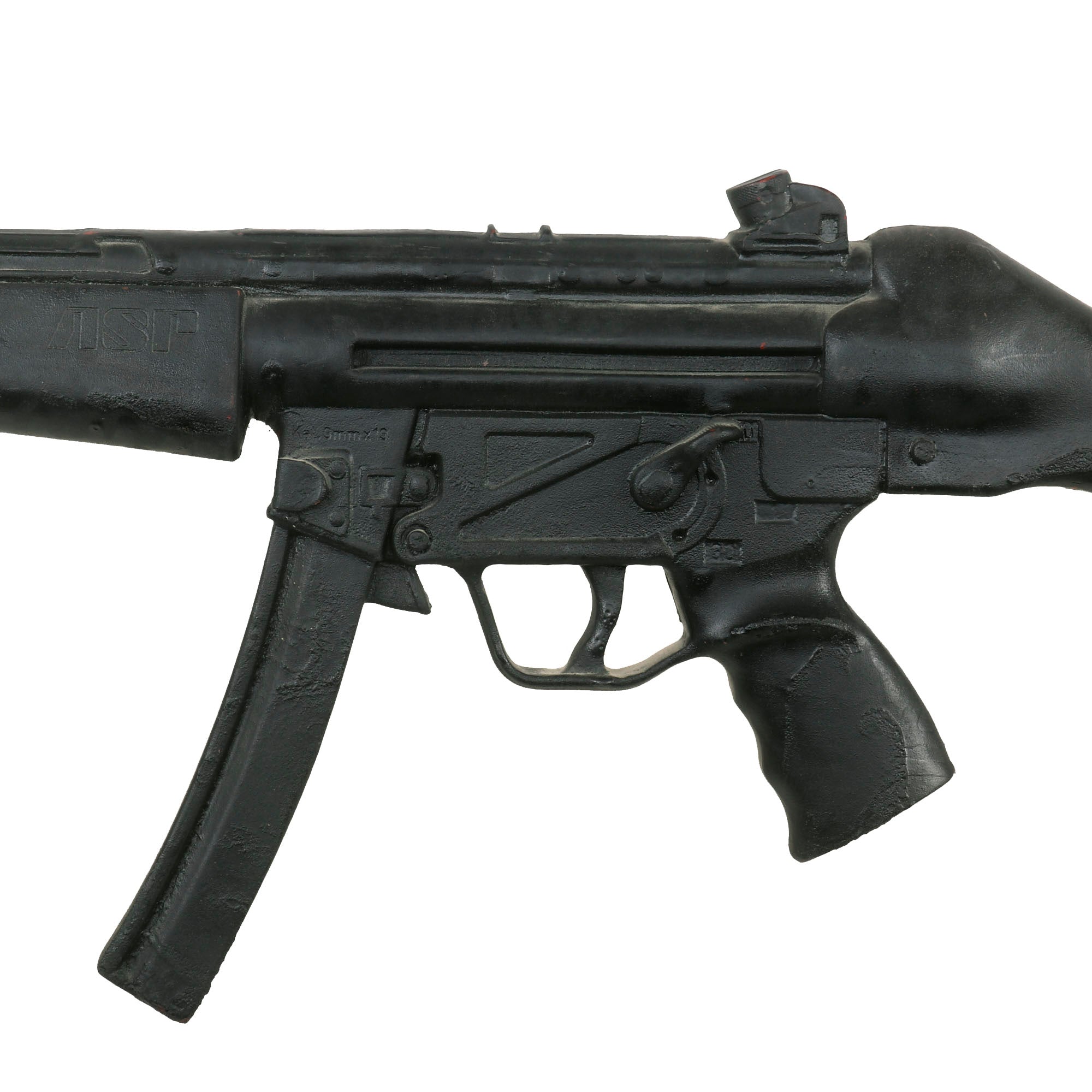 Original Item. Only One Available. This is an ASP-manufactured Red-colored MP5 training dummy gun that someone has painted black to mimic an actual MP5. It is made with the exact weight and dimensions of an actual MP5 in order to make training as realistic as possible.