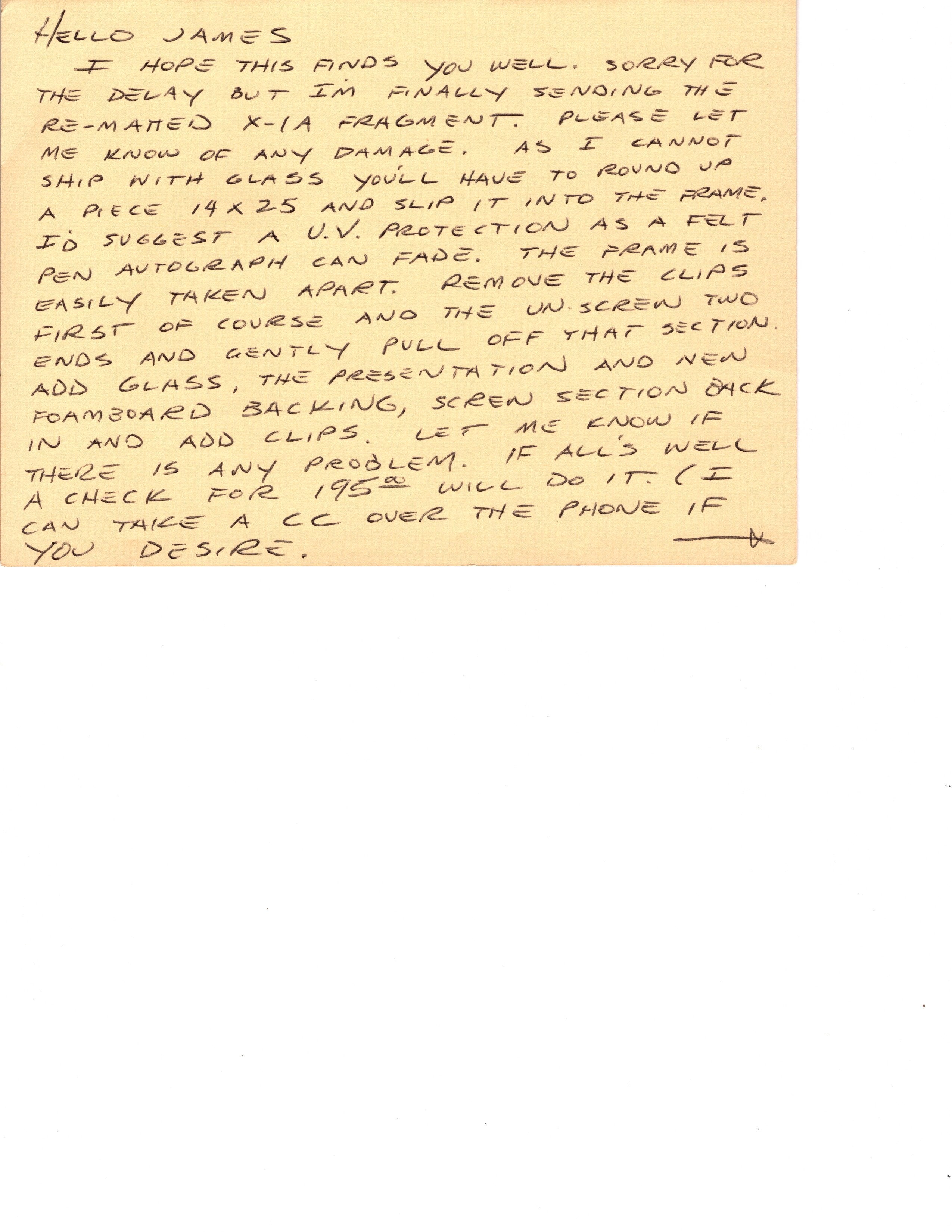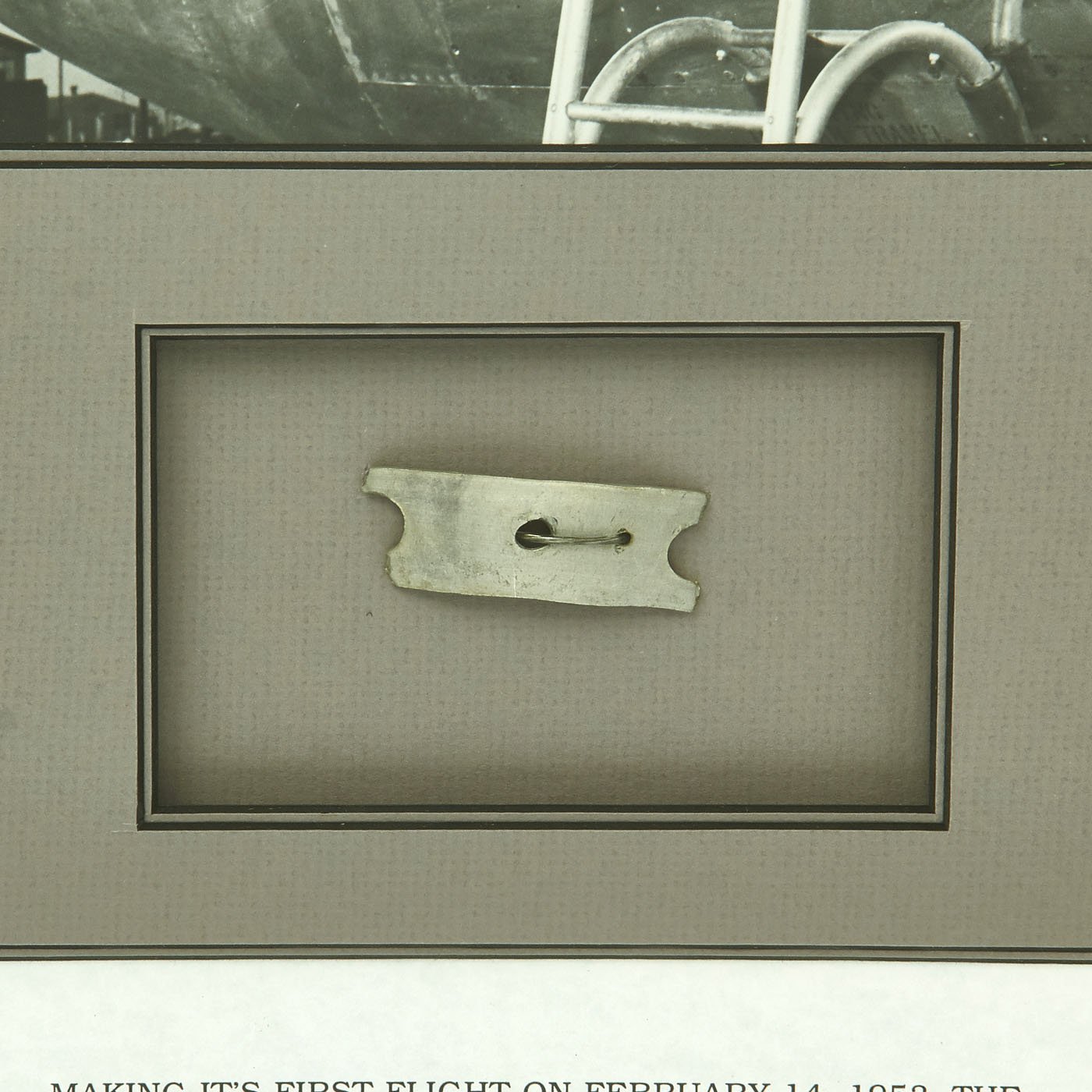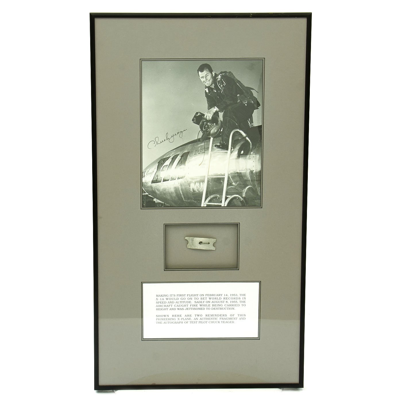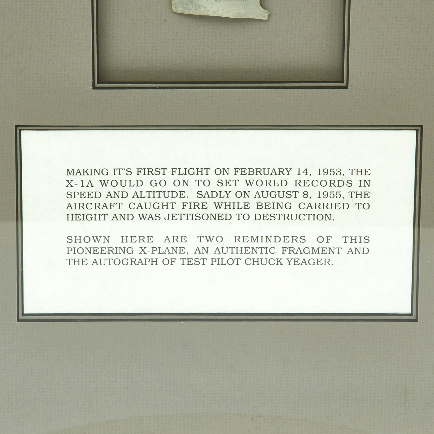 This piece of aircraft aluminum is from that very plane, recovered from the crash sight. It looks to be a piece of reinforcement or strapping. The piece itself is about 2" by 3/4", is mounted inside of the frame. Above the fragment is a glossy copy of a famous publicity photo of Chuck Yeager exiting the cockpit, which has been signed by Yeager himself.