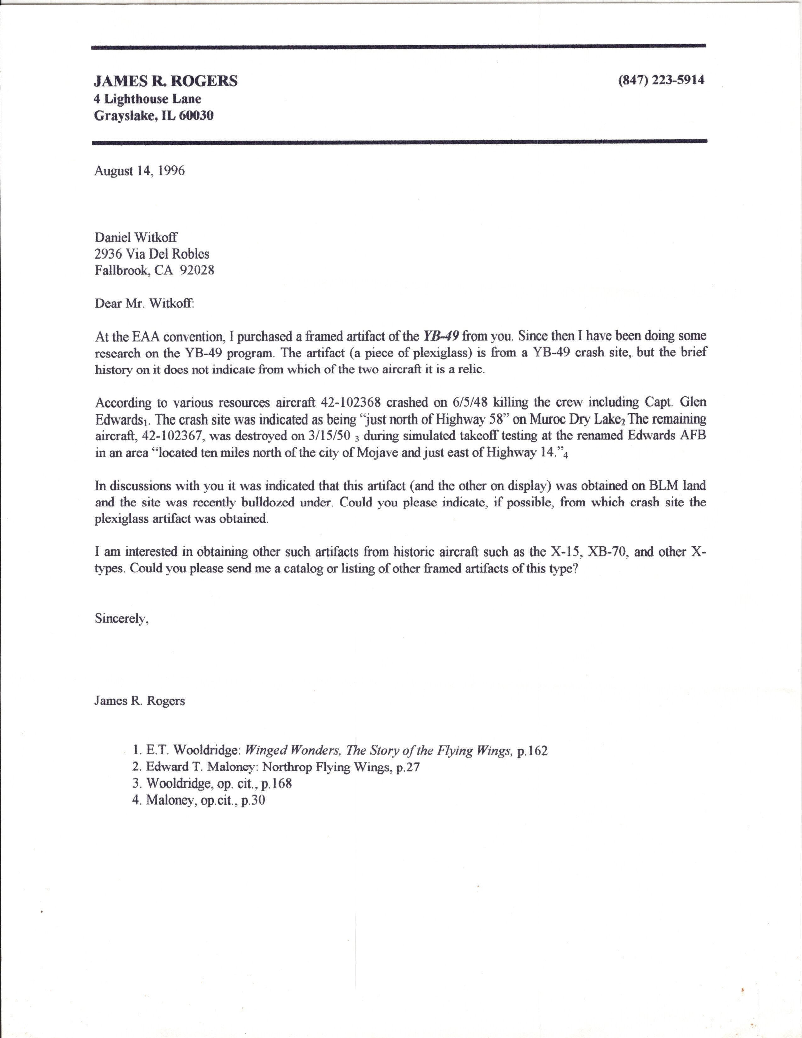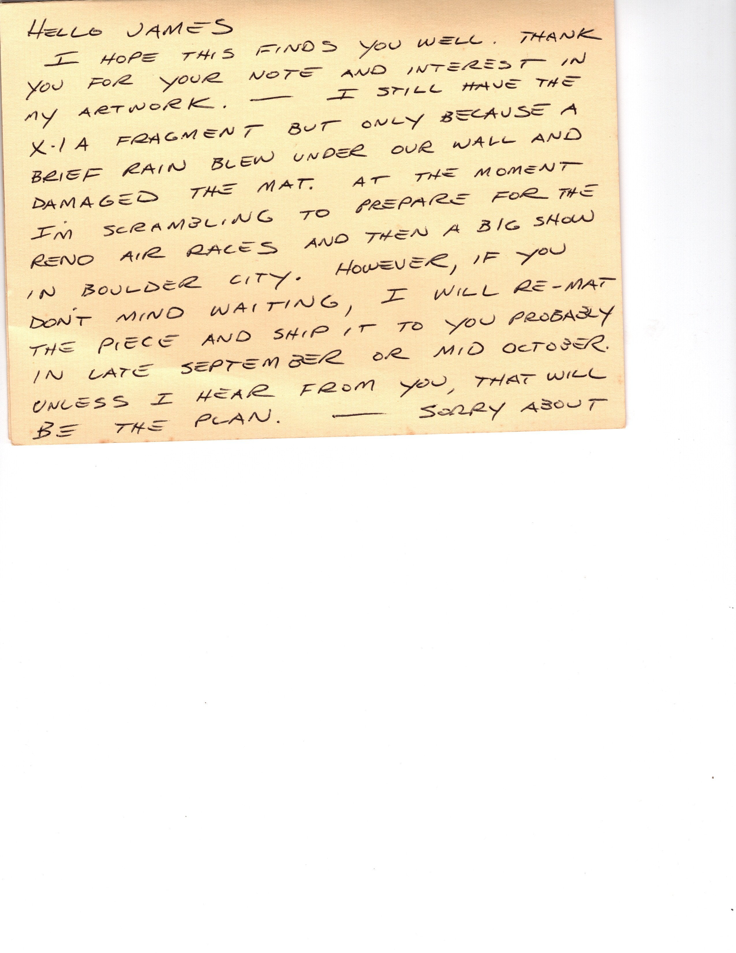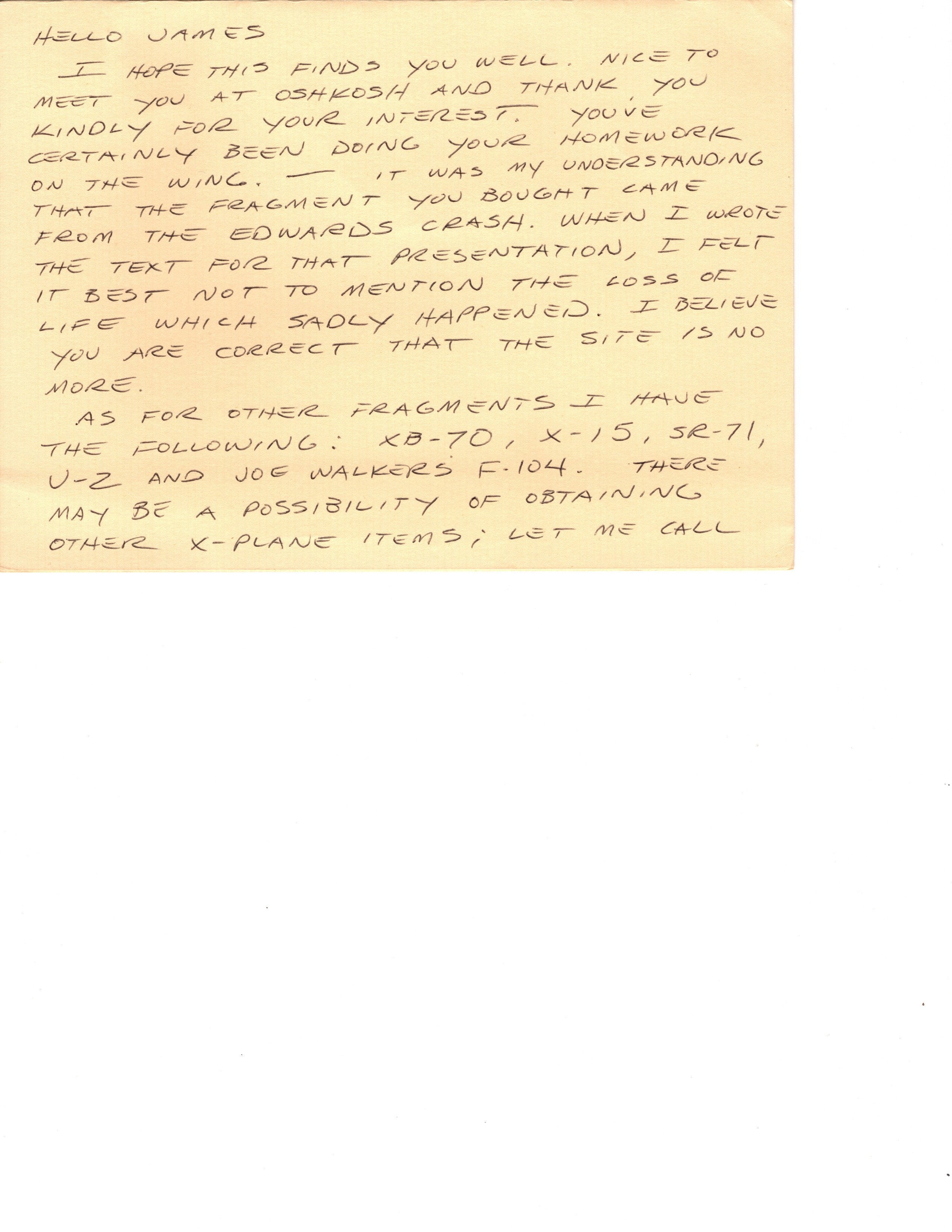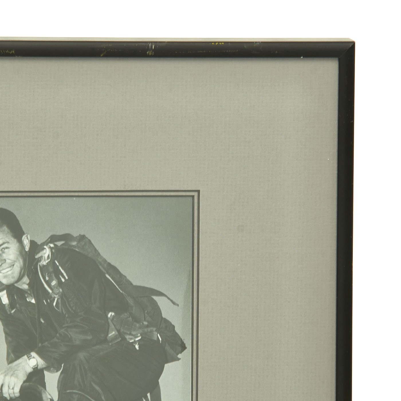This piece of aircraft aluminum is from that very plane, recovered from the crash sight. It looks to be a piece of reinforcement or strapping. The piece itself is about 2" by 3/4", is mounted inside of the frame. Above the fragment is a glossy copy of a famous publicity photo of Chuck Yeager exiting the cockpit, which has been signed by Yeager himself.
