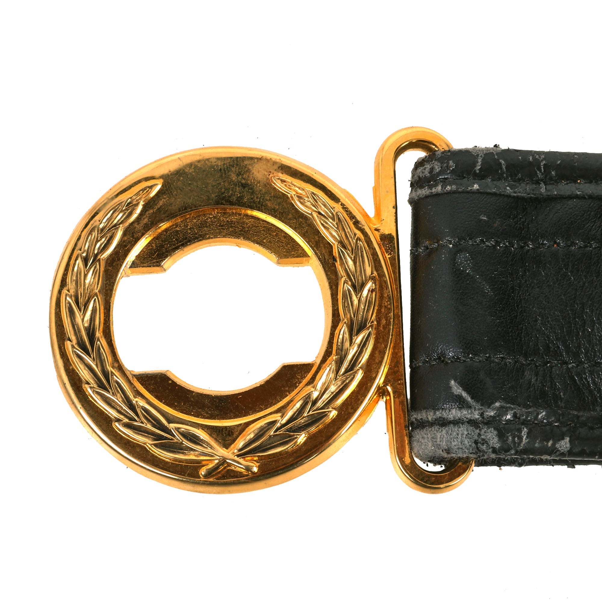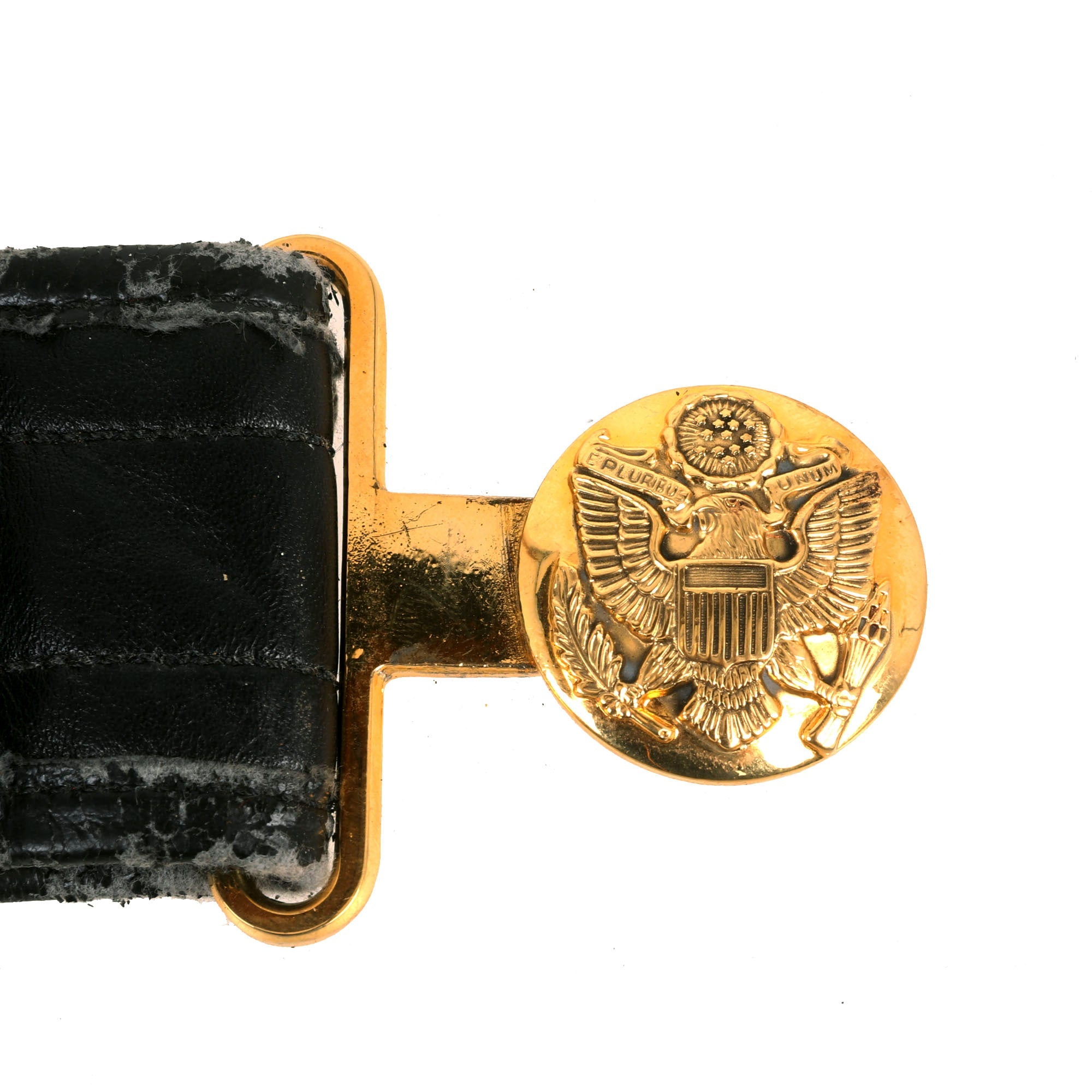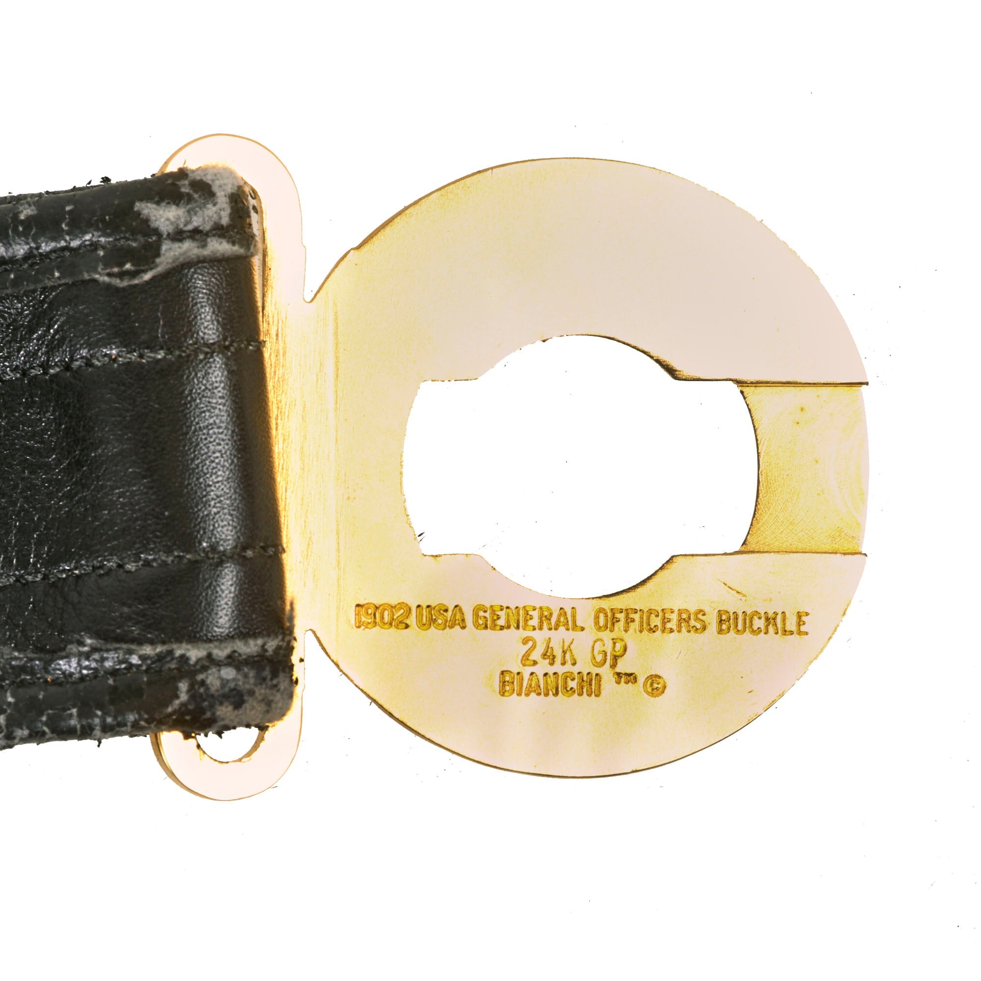 Up through WWI, all officers wore a brown belt with an interlocking eagle plate in garrison (The Model 1910 Officer’s Garrison Belt). After the war, the belt was no longer regulation. In July 1943, the Army Chief of Staff “expressed a desire” as the original memorandum states, “for a belt to be worn by all general officers when carrying sidearms, except when actually going into combat.” The use of the belt was left to the discretion of each General Officer. It was worn with the Army Combat Uniform and also issued in conjunction with the General Officer’s Issue Colt Model 1903 Pocket Model.