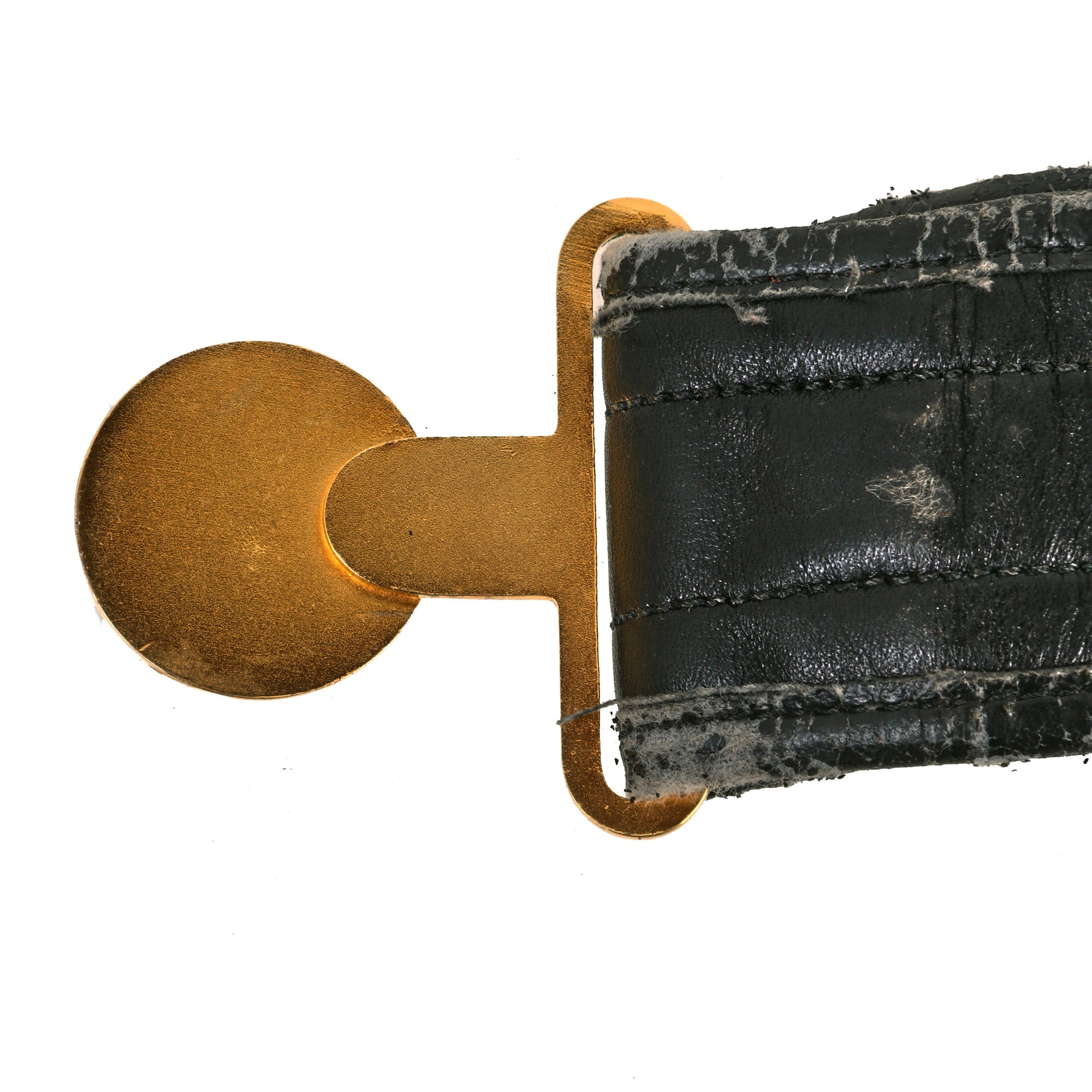 This indicates that the buckle is plated with 24K gold, which would make sense for a General Officer. The belt rig is certainly worn with much of the leather chipping as shown, so this set definitely saw heavy service. There is a form in the holster to keep its shape, but we haven’t been able to get the holster to open. A great set, ready for further research and display!